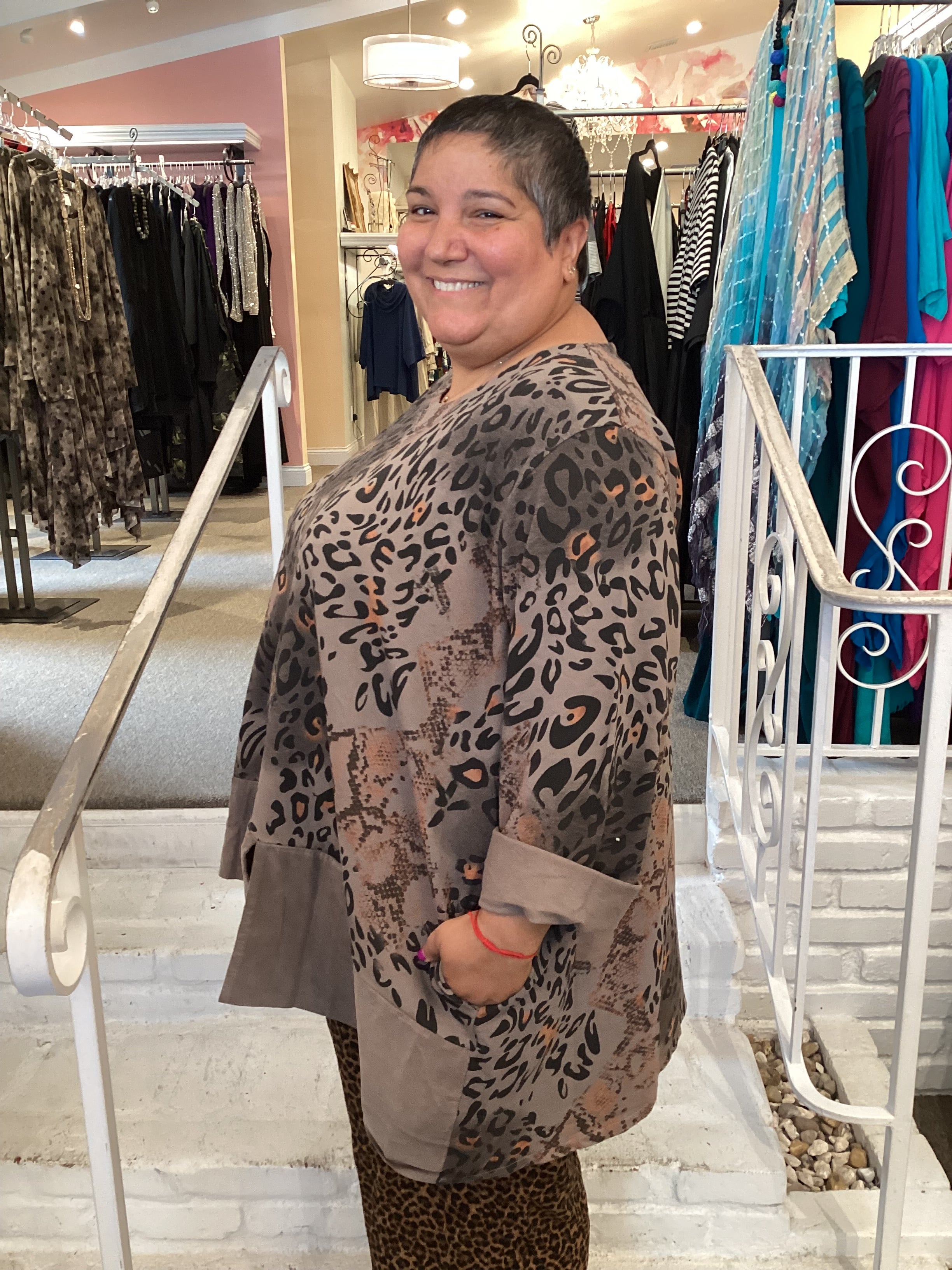 Enjoy this fall wardrobe addition!! Unique animal prints on French terry sweatshirt in a generous square shape. The long sleeves are wide, about 18" diameter at the elbow and of course you will love the side seam pockets. The front hemline is a solid contrasting fabric. Our 2X model is comfortable in this one size garment.