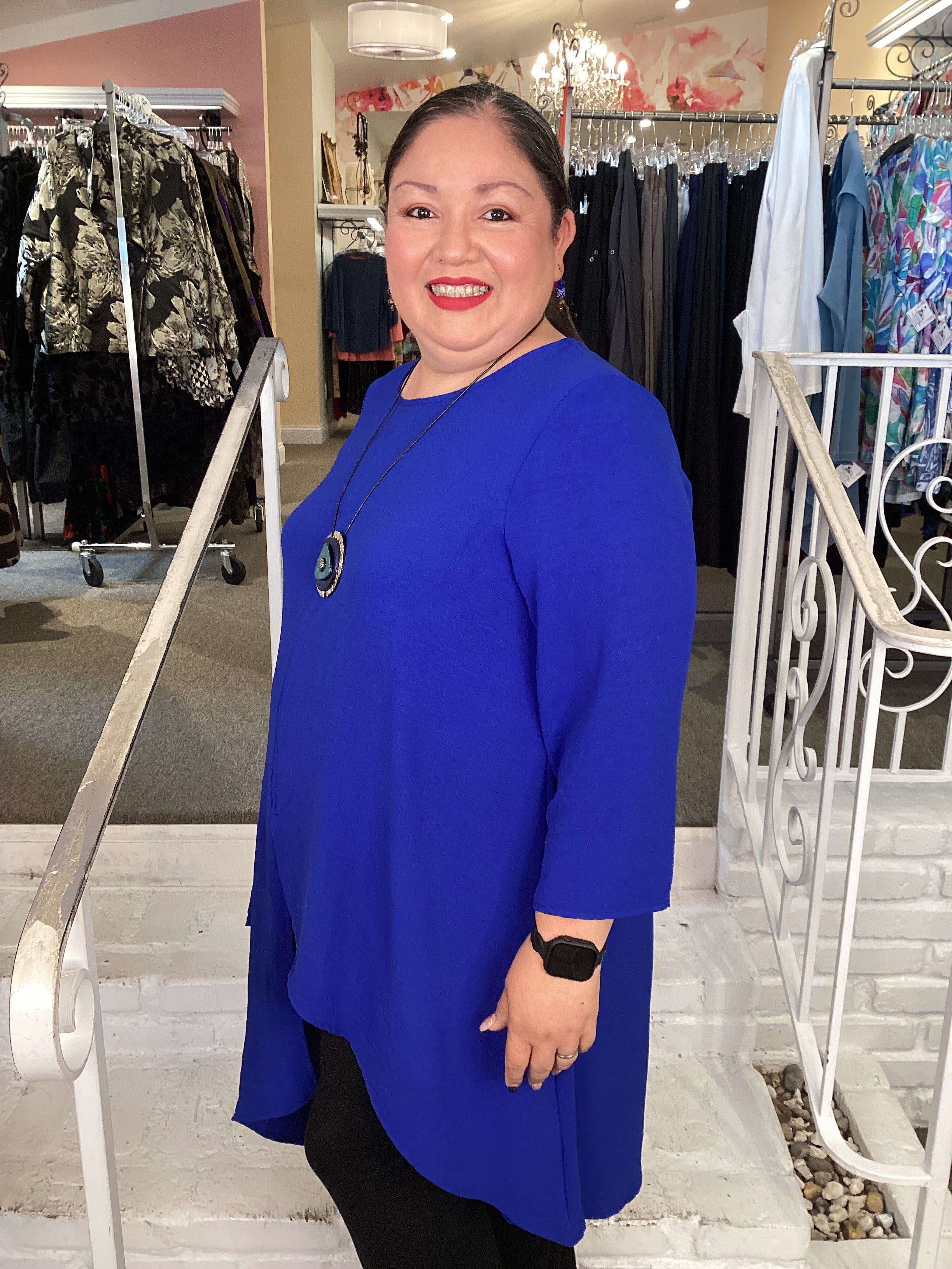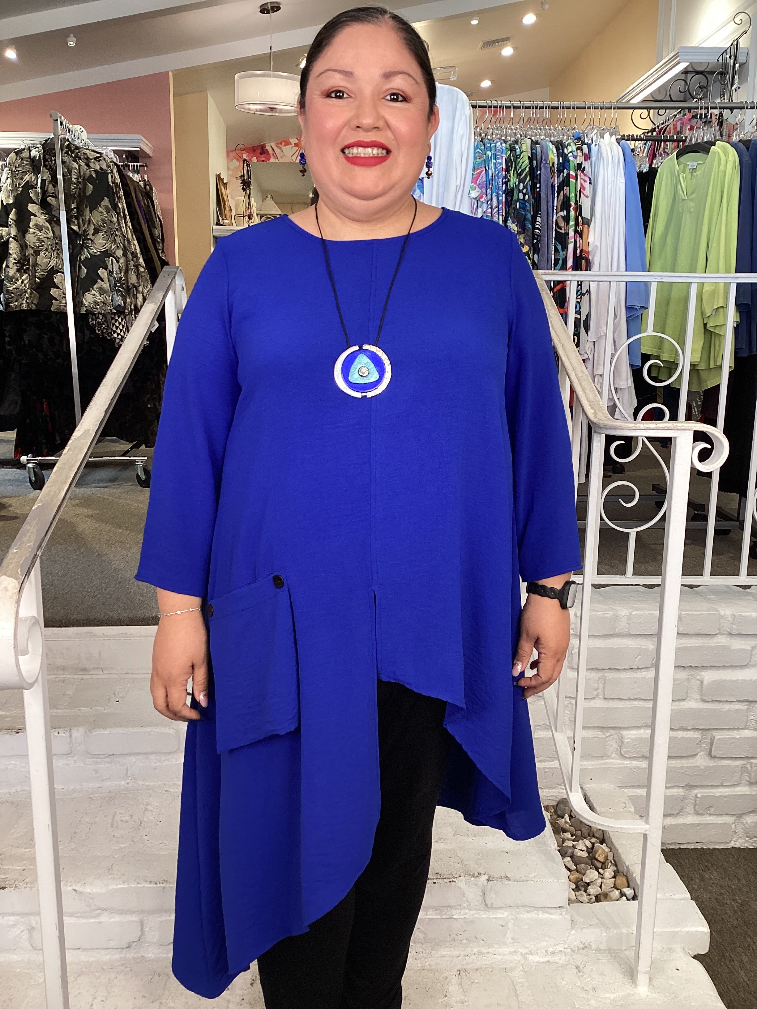 This beautiful long tunic has an asymmetrical cut in the front and back with an adorable front pocket. It has a 3/4 length sleeve with a scoop neck. The front opening is a stylish addition. Complete the look with a pair of leggings or pants.