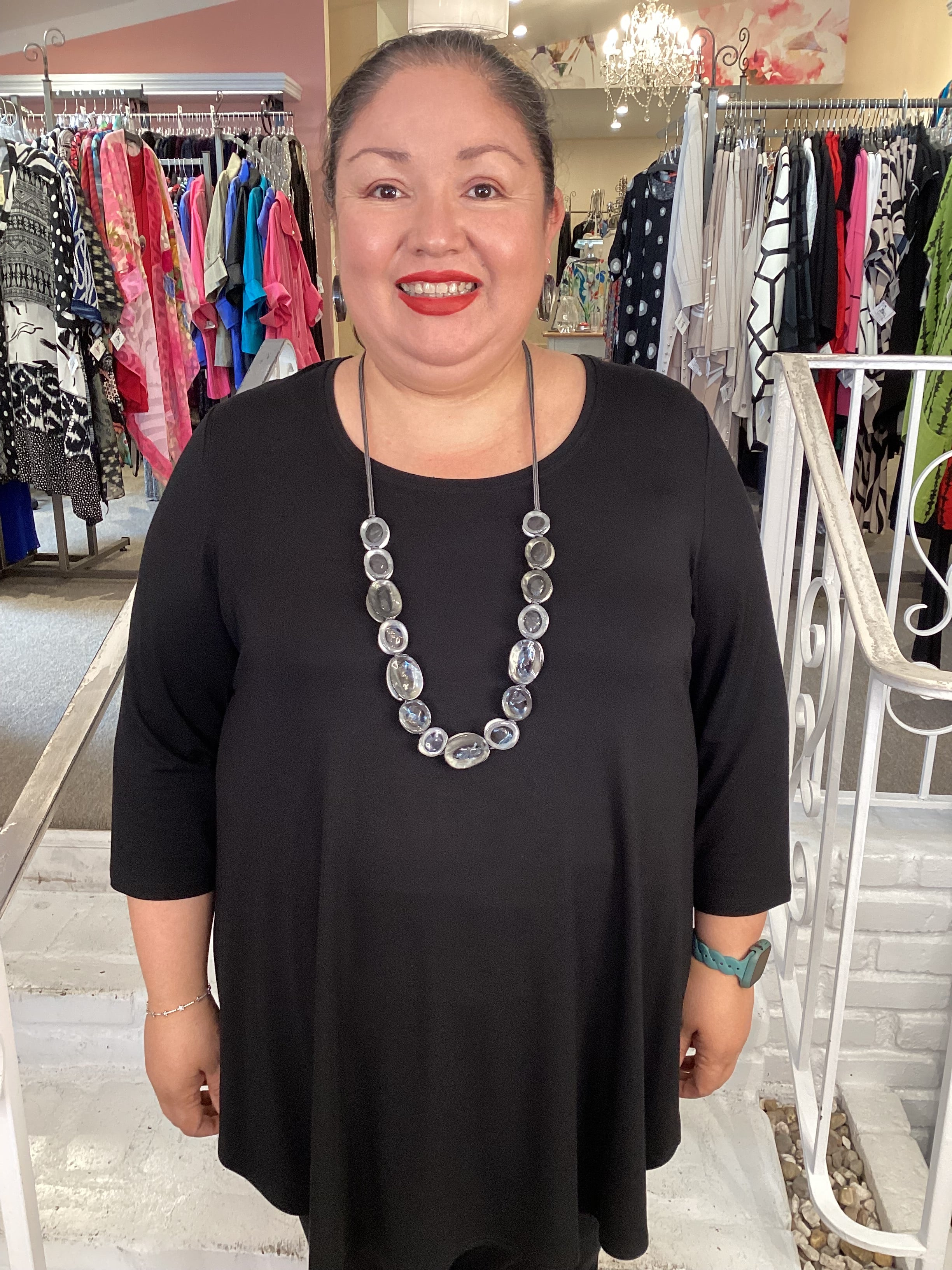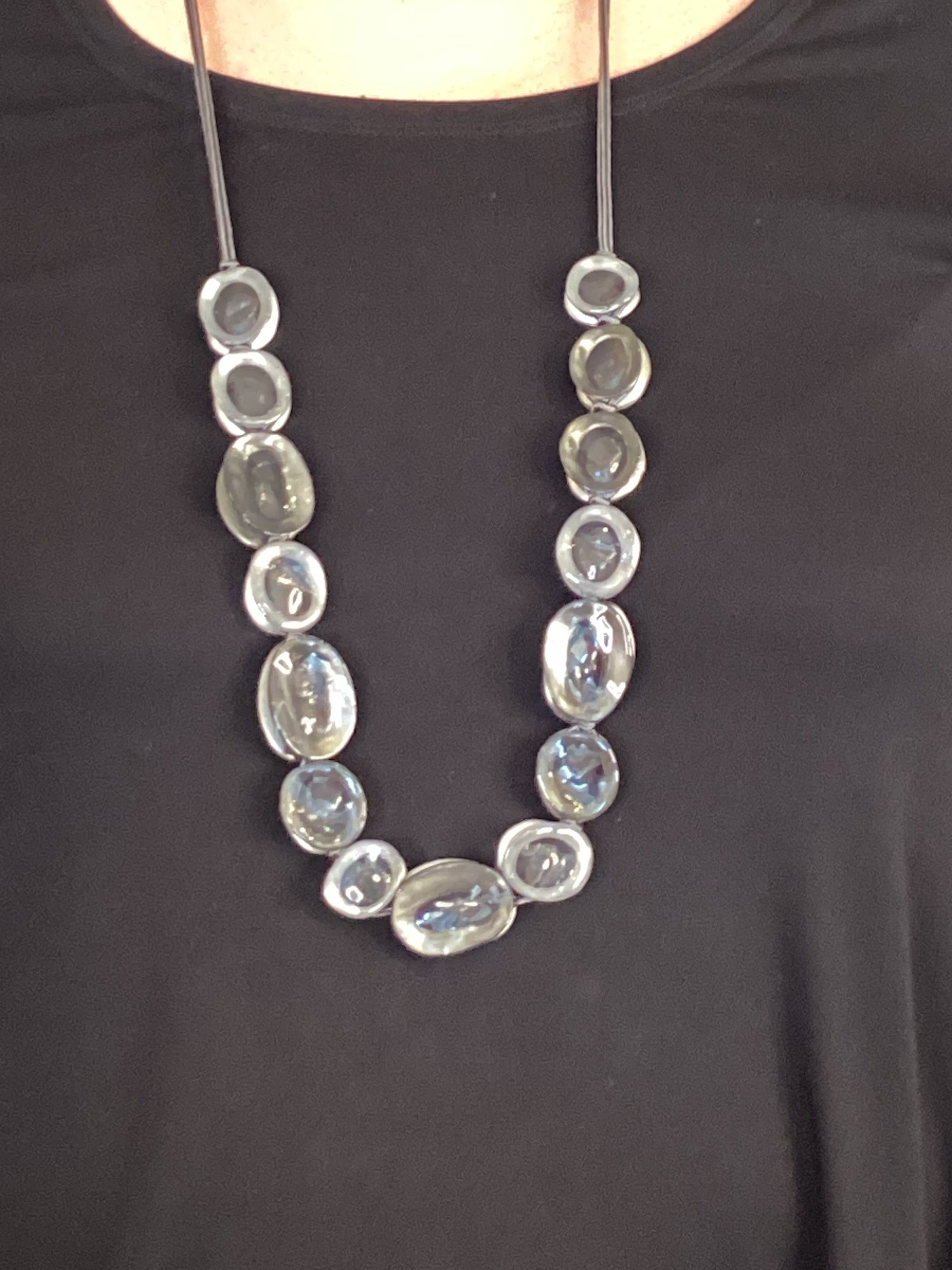Add a touch of fun to your look with this Long Circles Necklace featuring clear resin ovals framed in chic grey trim. Its adjustable length lets you customize your style effortlessly, making it perfect for layering or wearing solo. Playful and versatile, this necklace brightens any outfit with a modern twist.