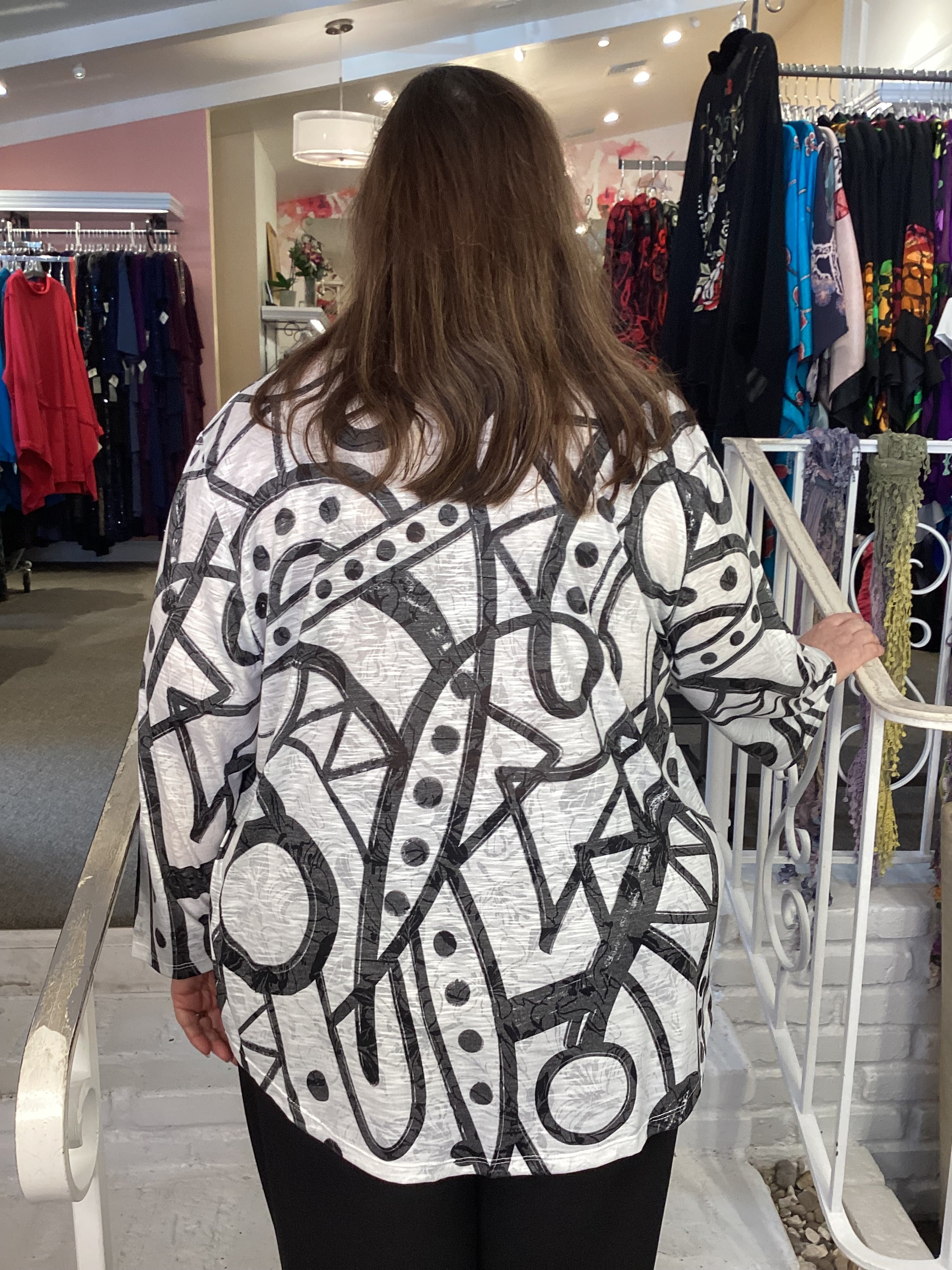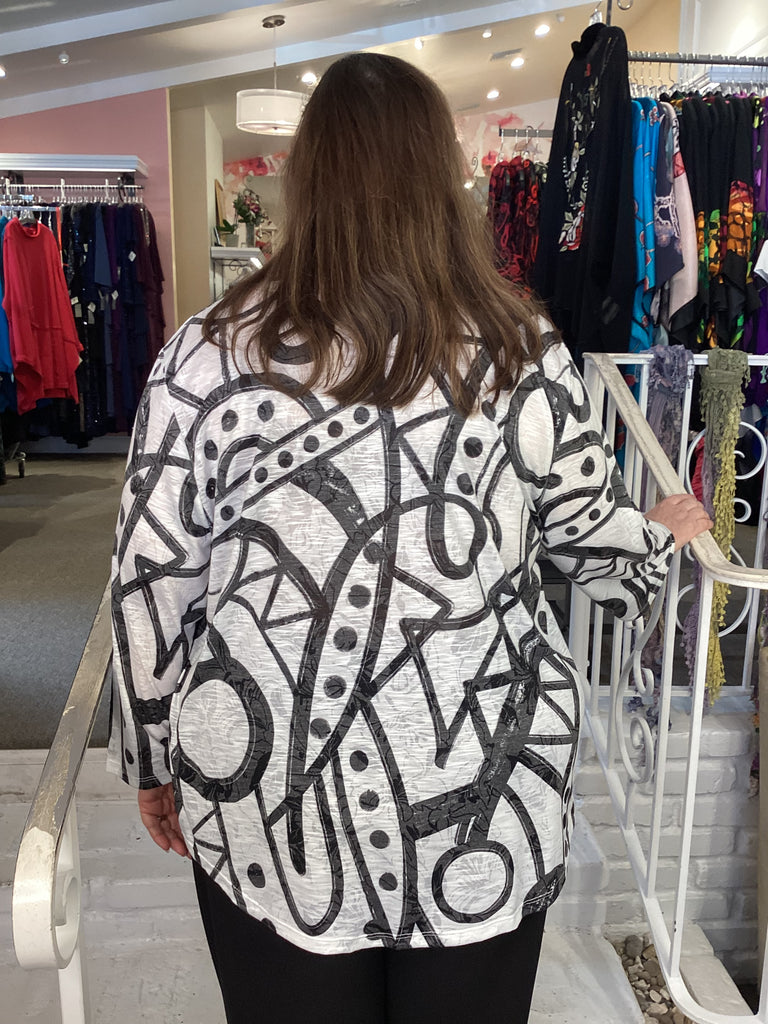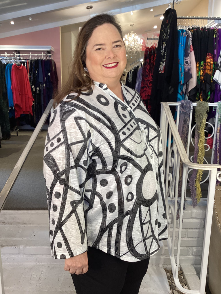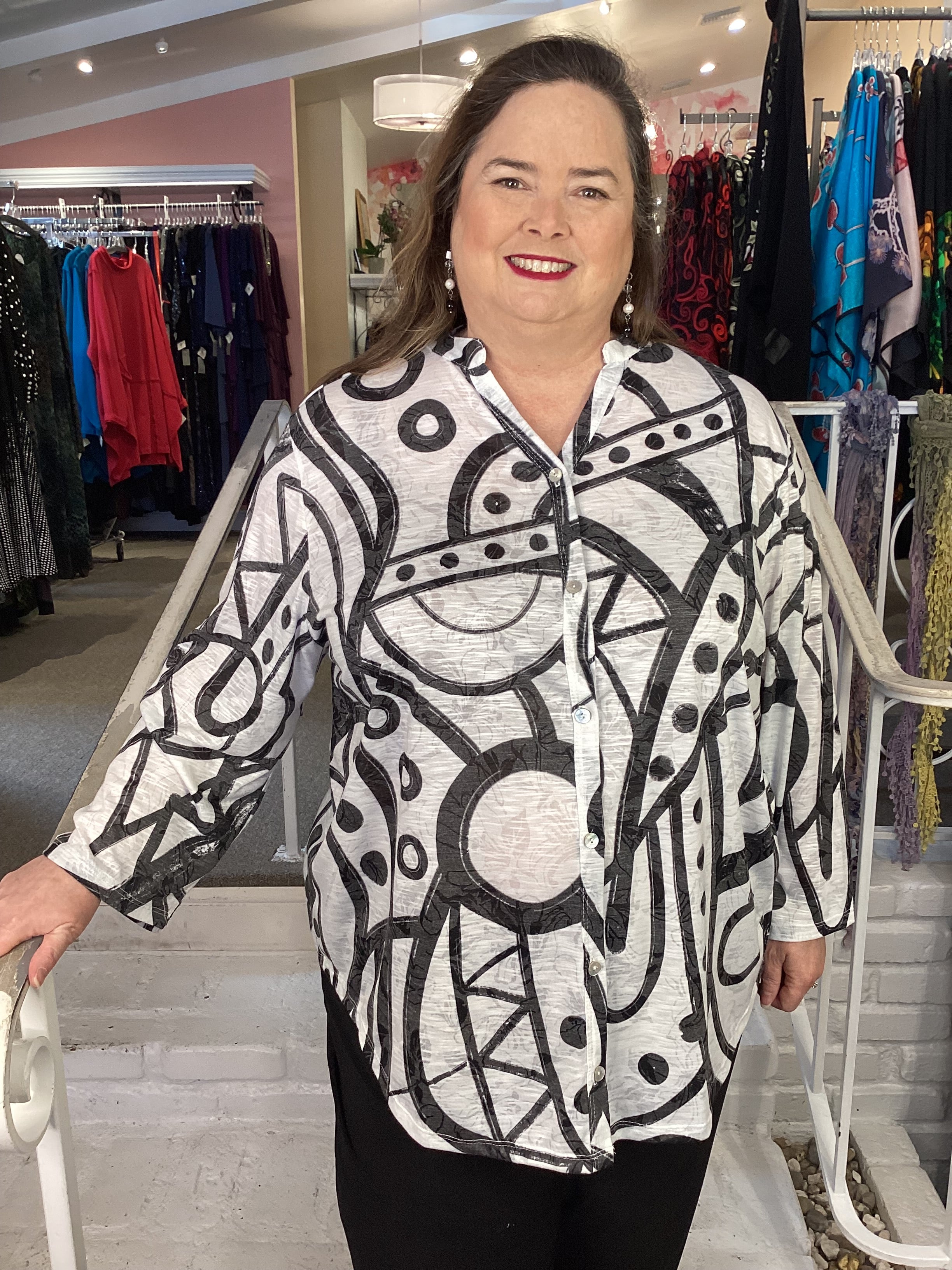 Add a touch of style to your wardrobe with our Cay Button Down Shirt. This mandarin collar shirt features a black and white abstract print, perfect for any occasion. Its long sleeves provide comfort and versatility. Experience the benefits of a fashionable and functional piece.
