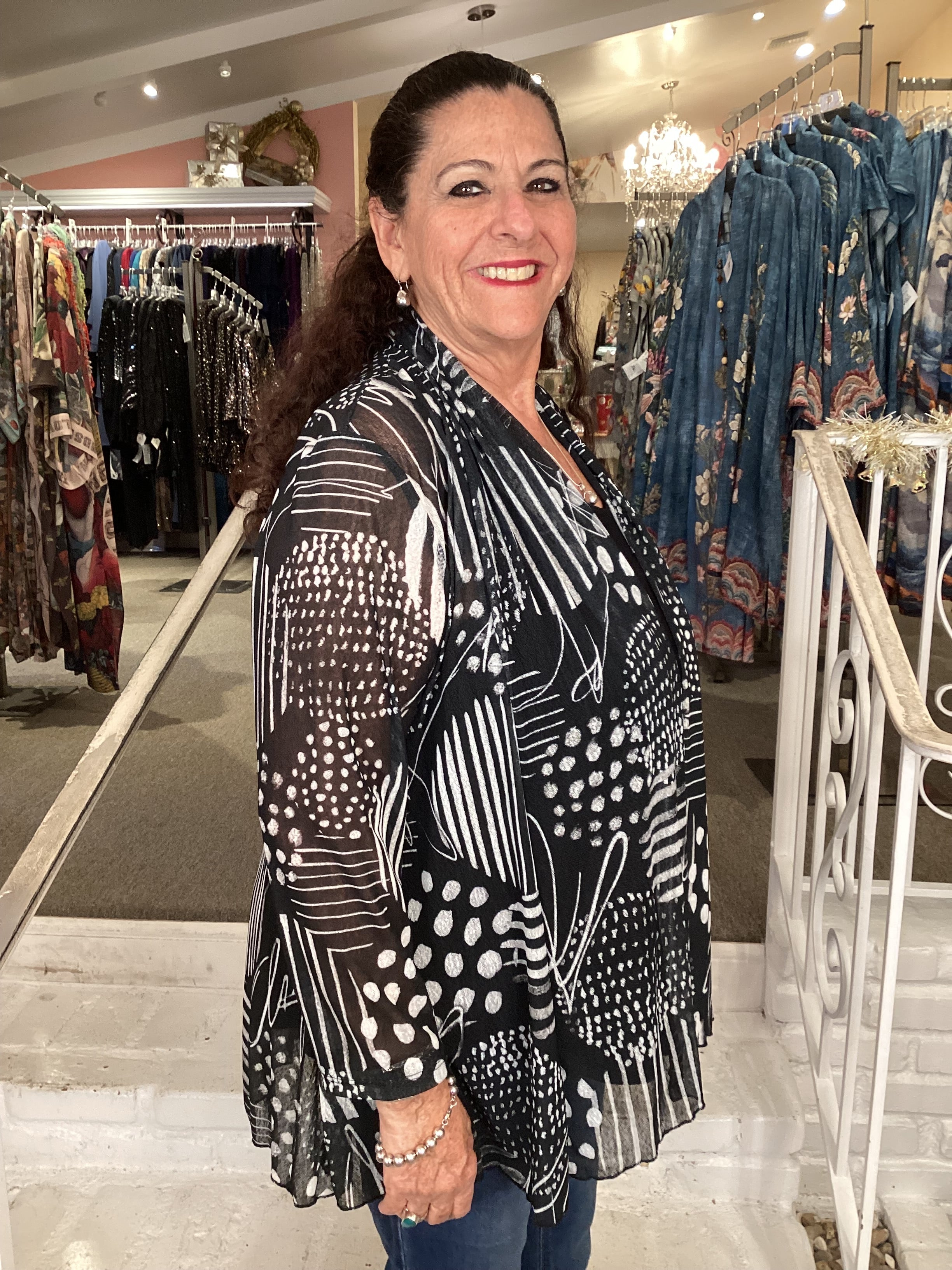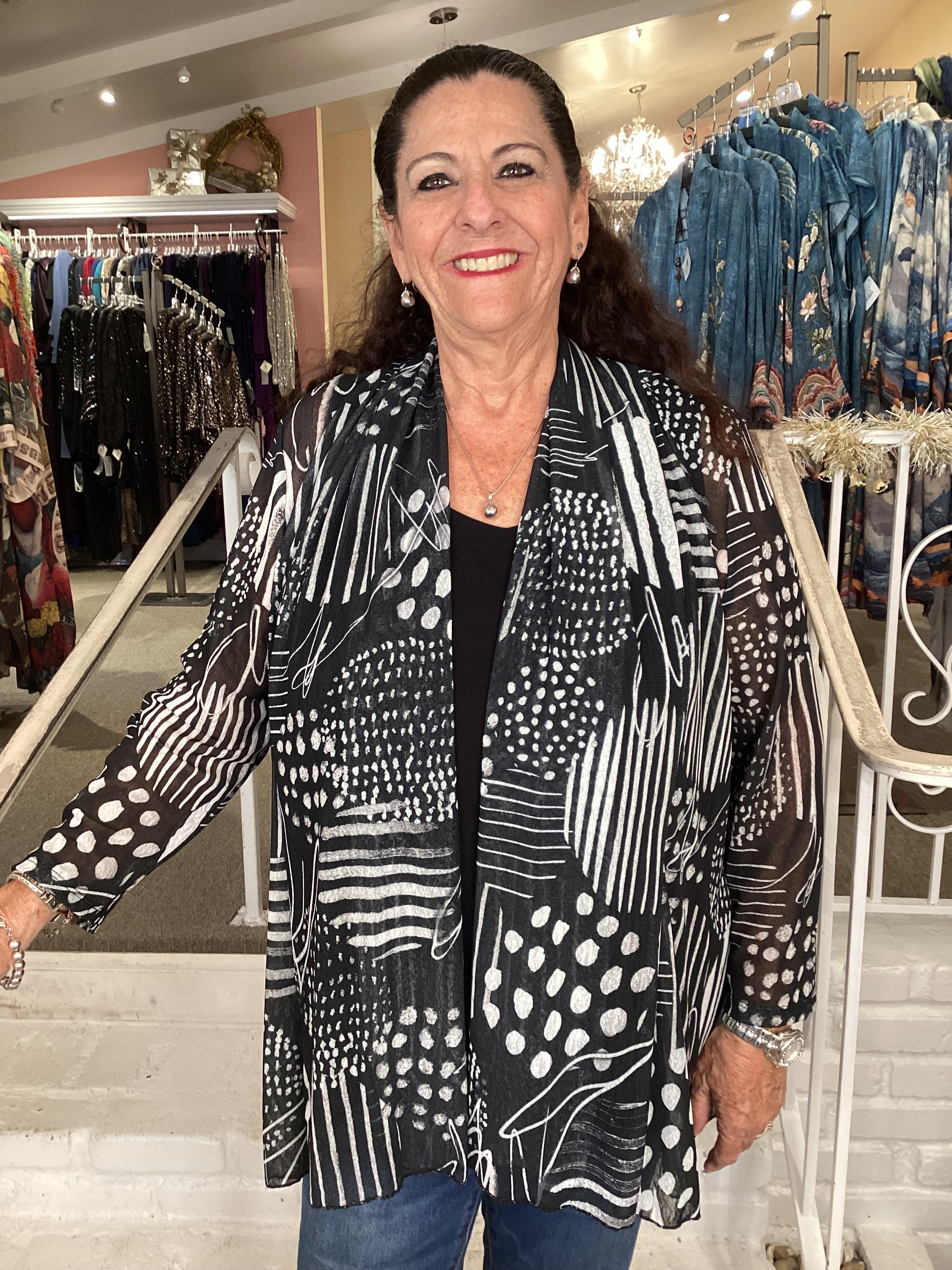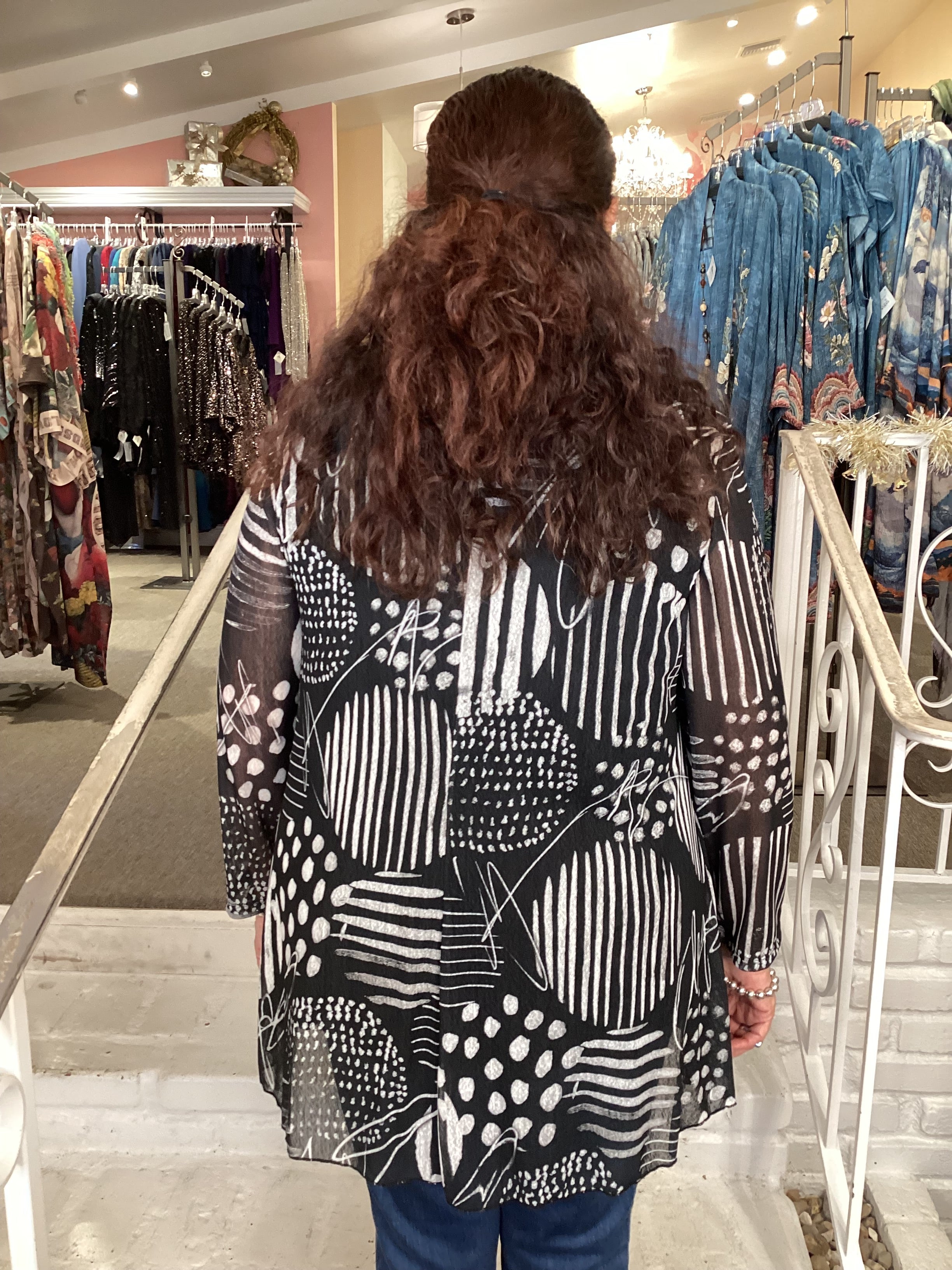 Layer up with effortless style in this lightweight mesh cardigan! The classic black and white print adds instant visual interest to any outfit, while the long sleeves provide just enough coverage without the bulk. Perfect for throwing over your favorite tee or dress, this breezy piece transitions seamlessly from season to season.