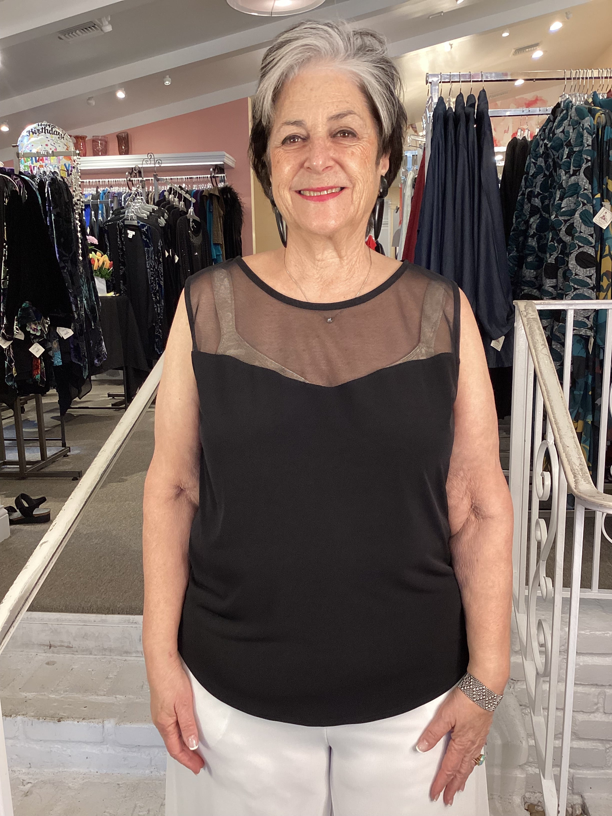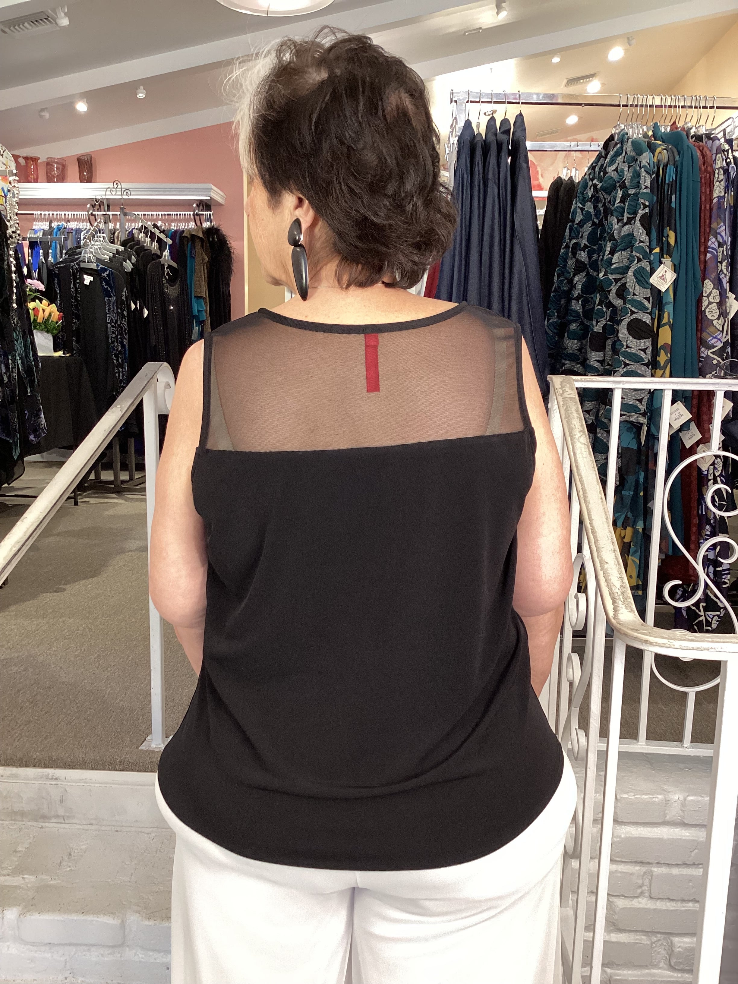 This simple shell top is made more stylish with a front and back sheer mesh yoke. Great for layering with a round neckline and light weight knit.
