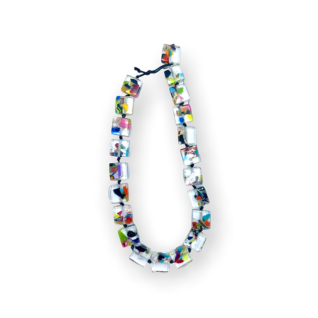 Handcrafted in Brazil, this eye-catching resin necklace features playful cubes in vibrant hues that shift and shimmer with every movement. No two pieces are identical—your necklace is as one-of-a-kind as you are. A bold accessory that transforms any outfit into something unforgettable.