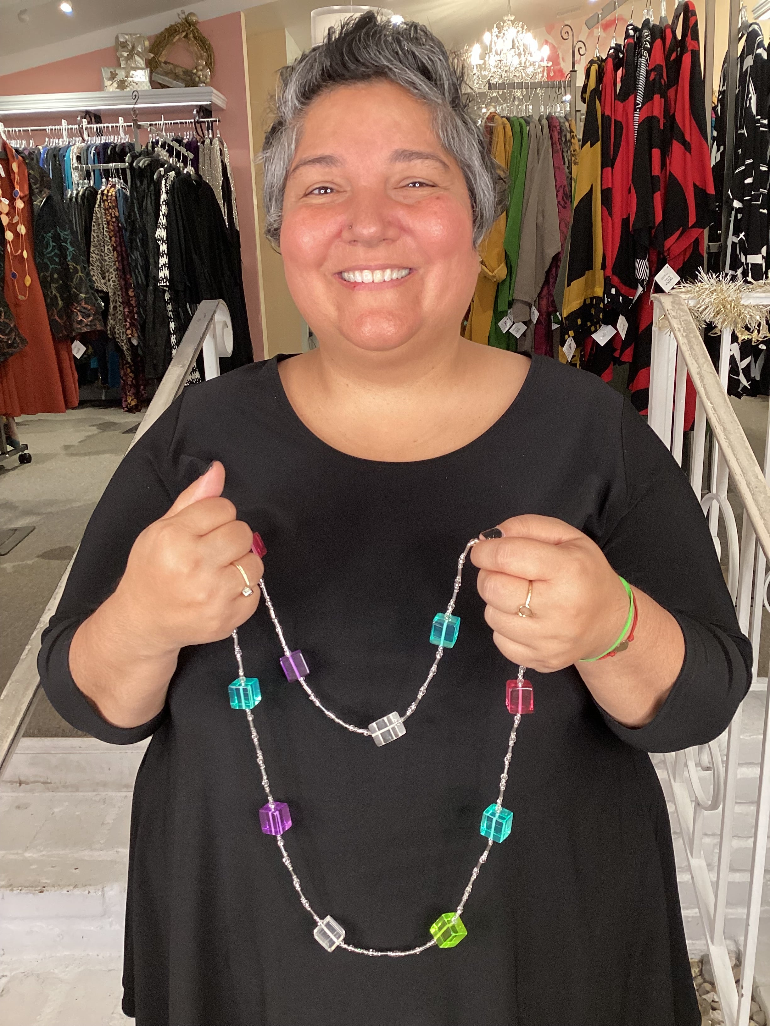 This is a wonderful piece of wearable art by Atelier 1701 made with a unique resin. This beautiful necklace has spaced cubes in pretty pale colors, the spacers are crystal tube beads with small layered crystals in clear.Each necklace is a one of a kind. No two are alike so there may be minor differences in selected elements.