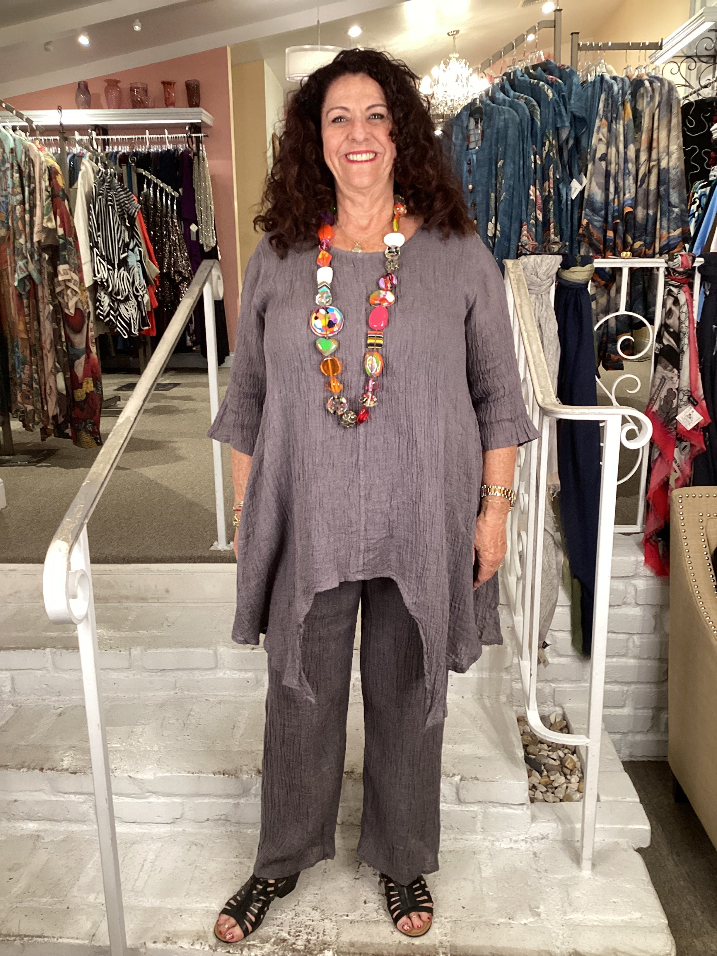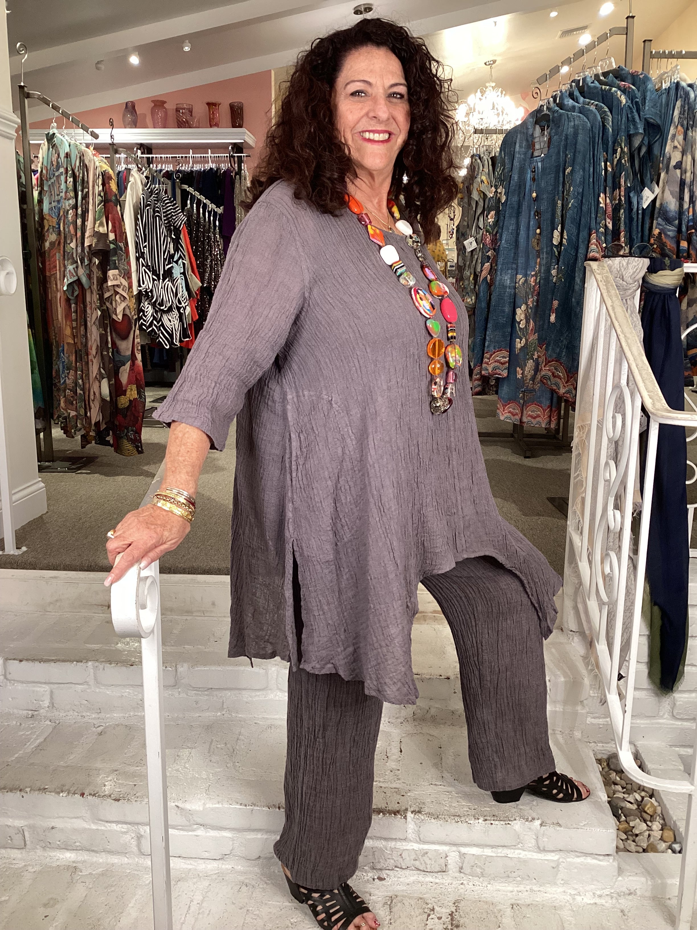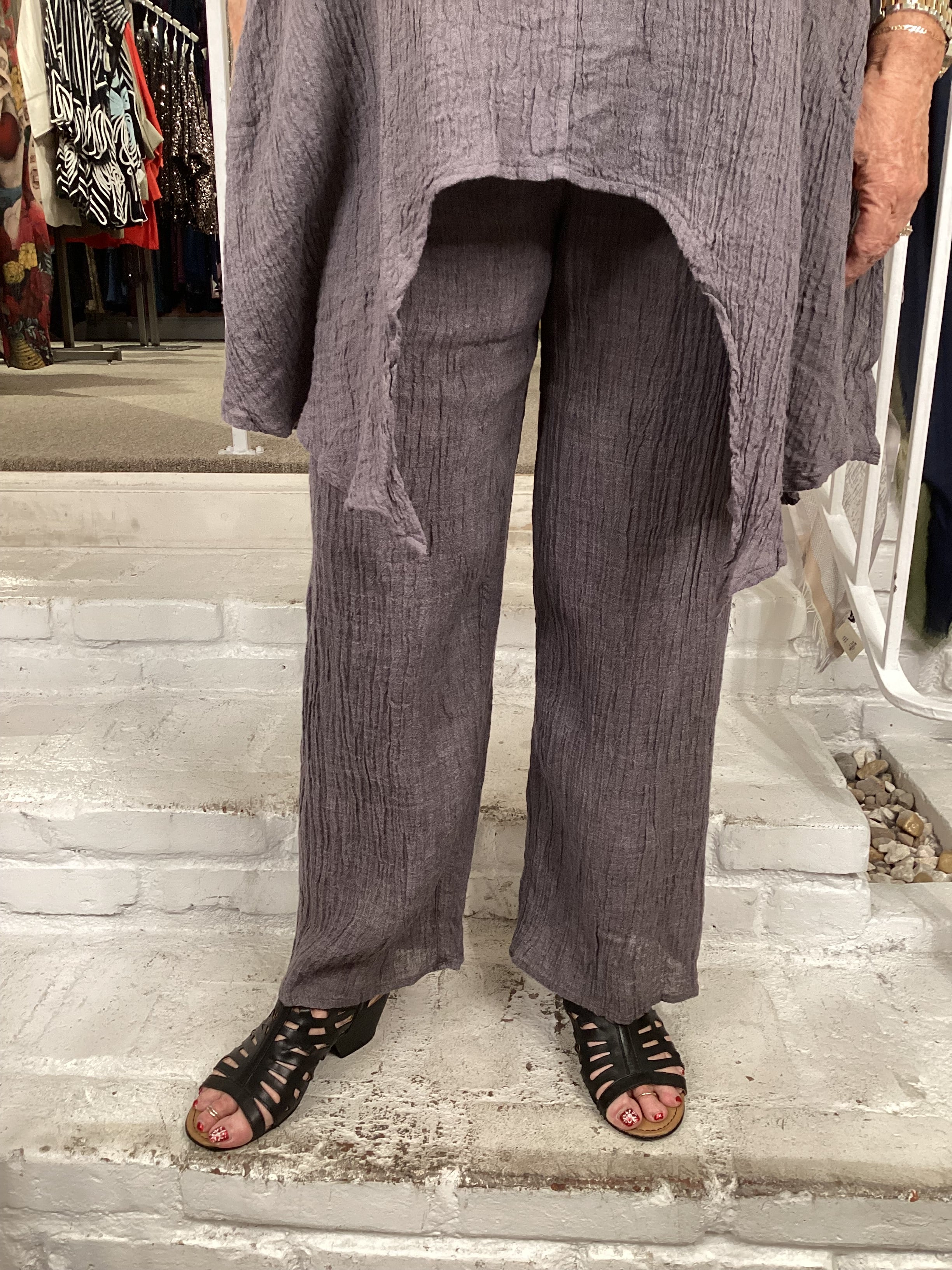 These essential pants deliver effortless sophistication and comfort. Constructed from lightweight linen gauze with a natural crinkle finish, they feature a clean straight-leg silhouette that flatters all proportions. The elastic waistband provides gentle support and all-day wearability, making them ideal for both relaxed and polished styling. A versatile wardrobe staple that pairs seamlessly with tunics, shirts, and layered pieces.