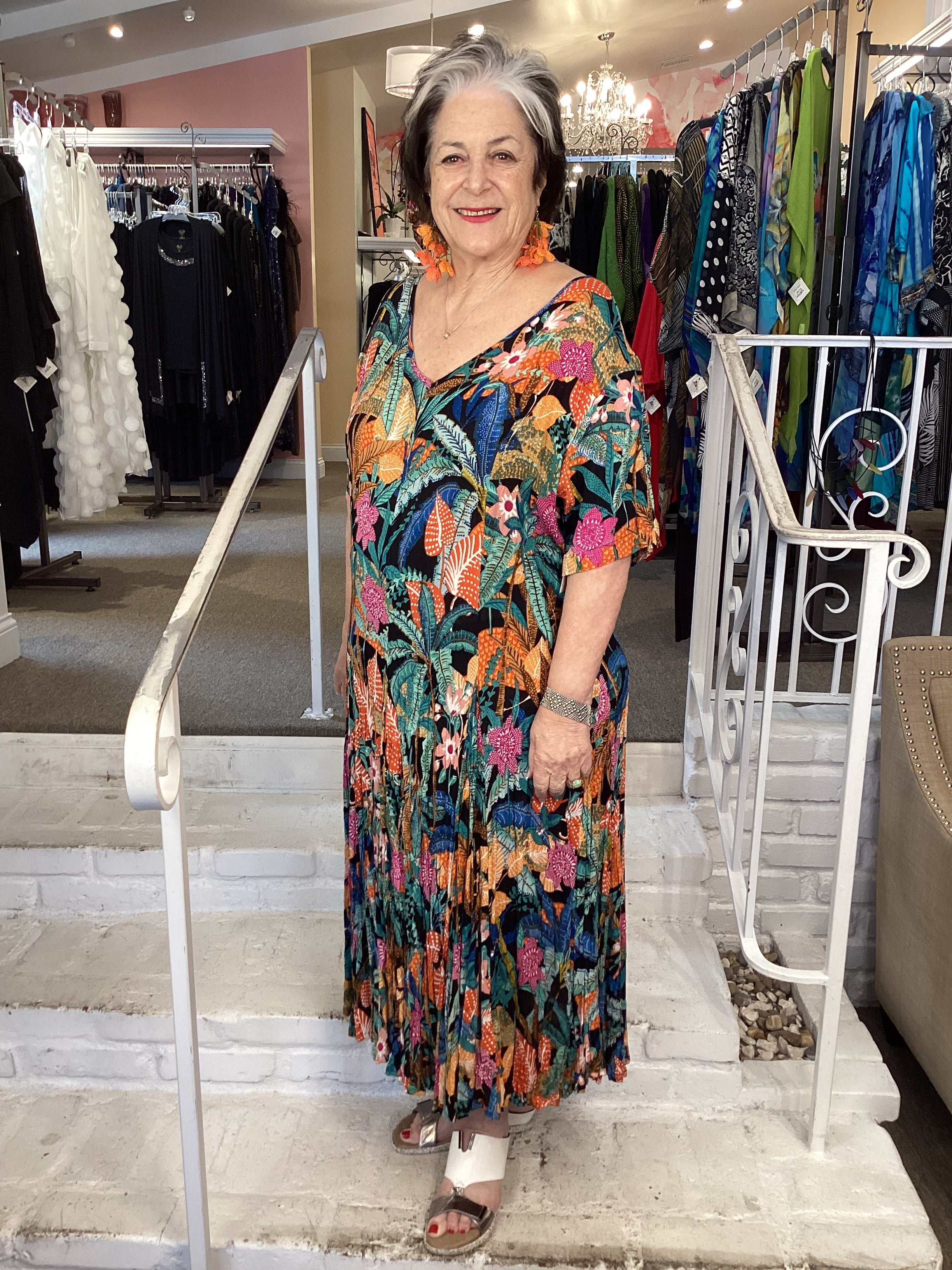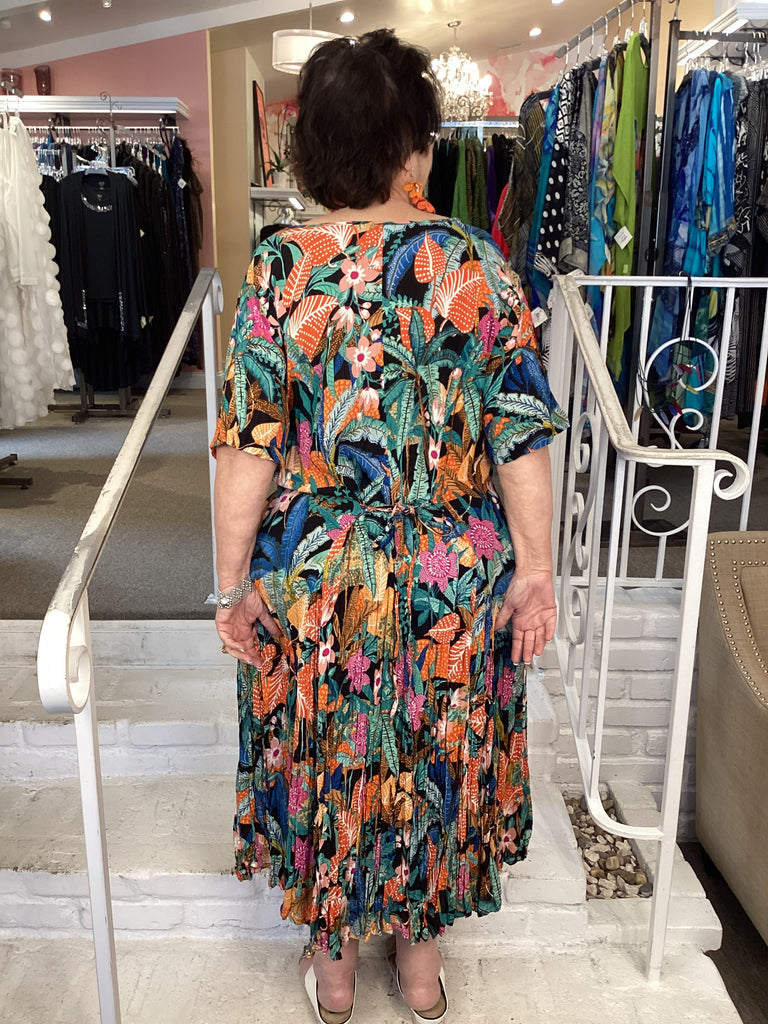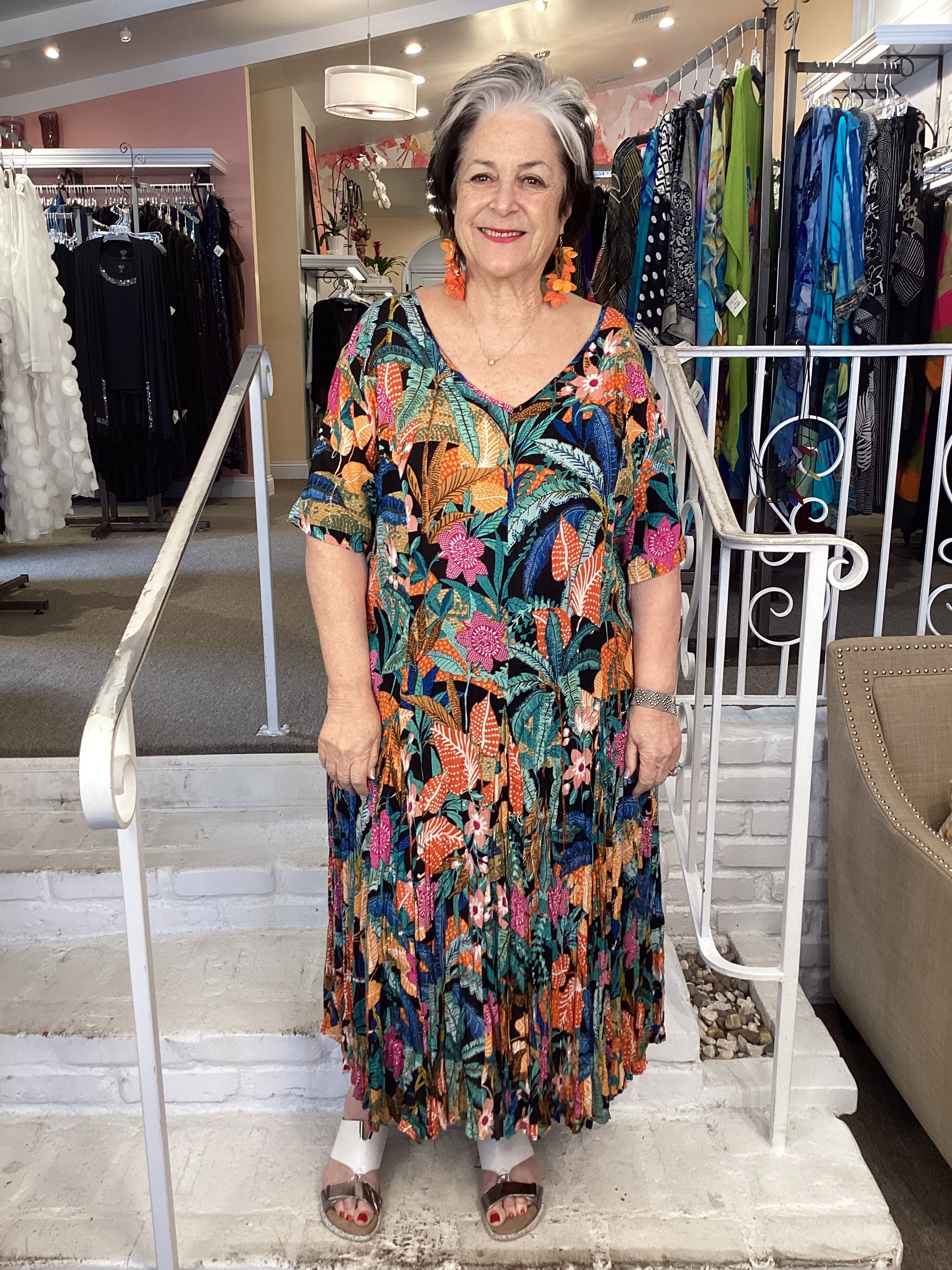 Summer is here and so are our summer dresses from Orientique!!! This lightweight rayon crinkle print fabric is a great warm/hot weather piece for your wardrobe. This dress features a lacing detail in the back, v-neck, elbow length sleeves. A-line silhouette, drapes beautifully. Our model is wearing a 1X.