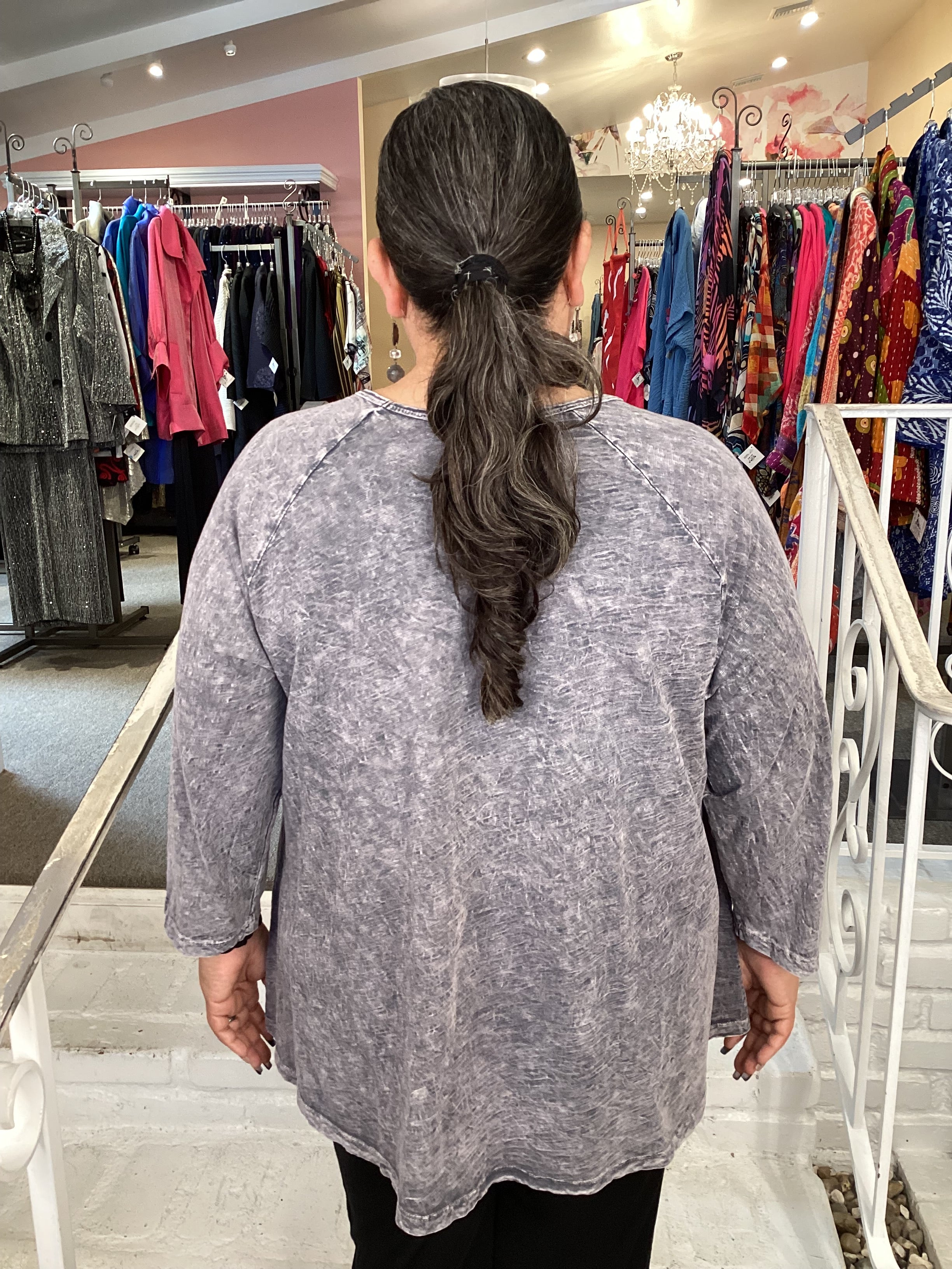 These are mineral washed for a worn look on the wonderful 100% cotton slub knit that everyone loves. These Plus Size Two patch pockets are so handy at the hemline that dips a little on both sides. These are full cut but drape nicely to the body.