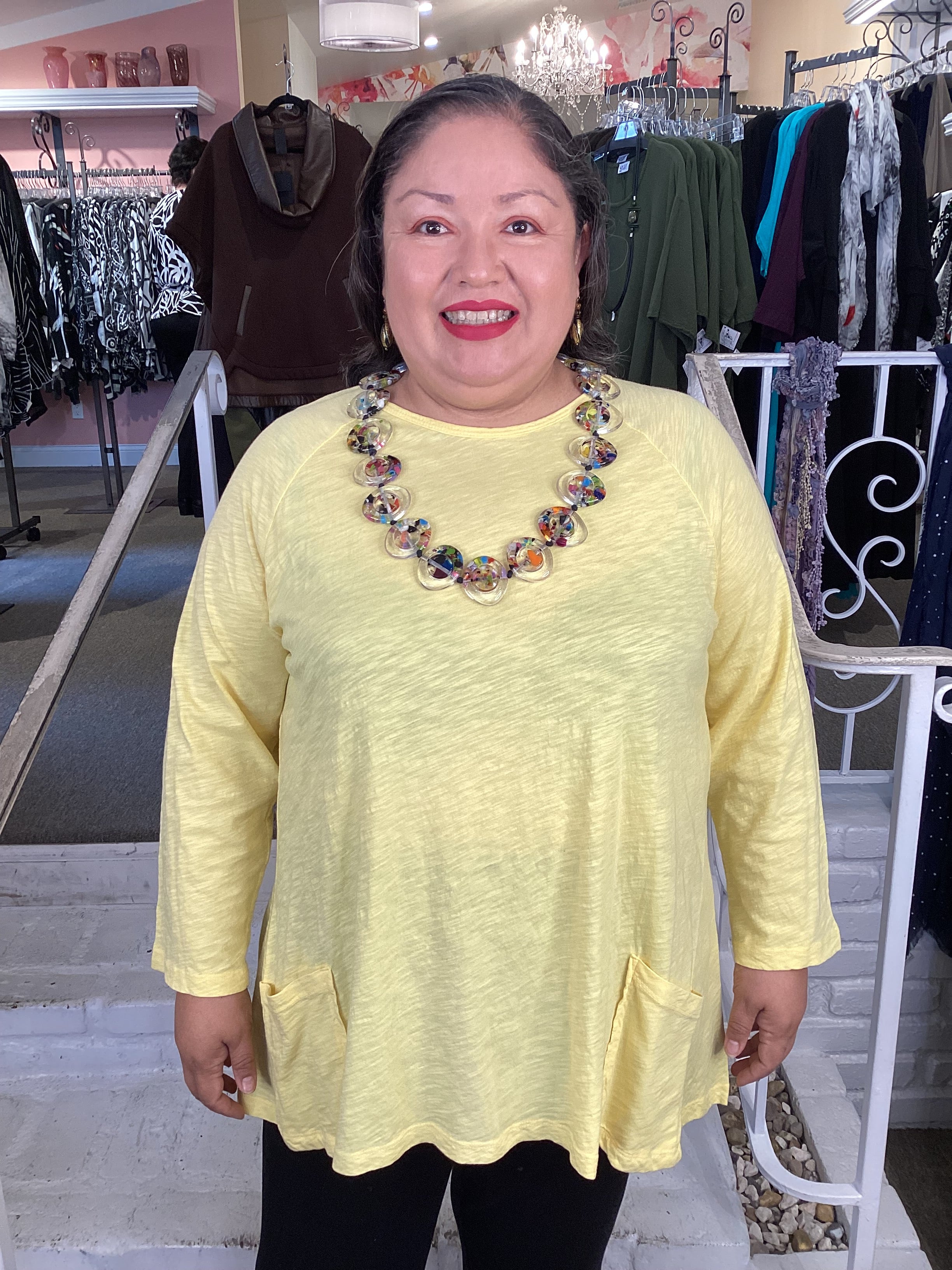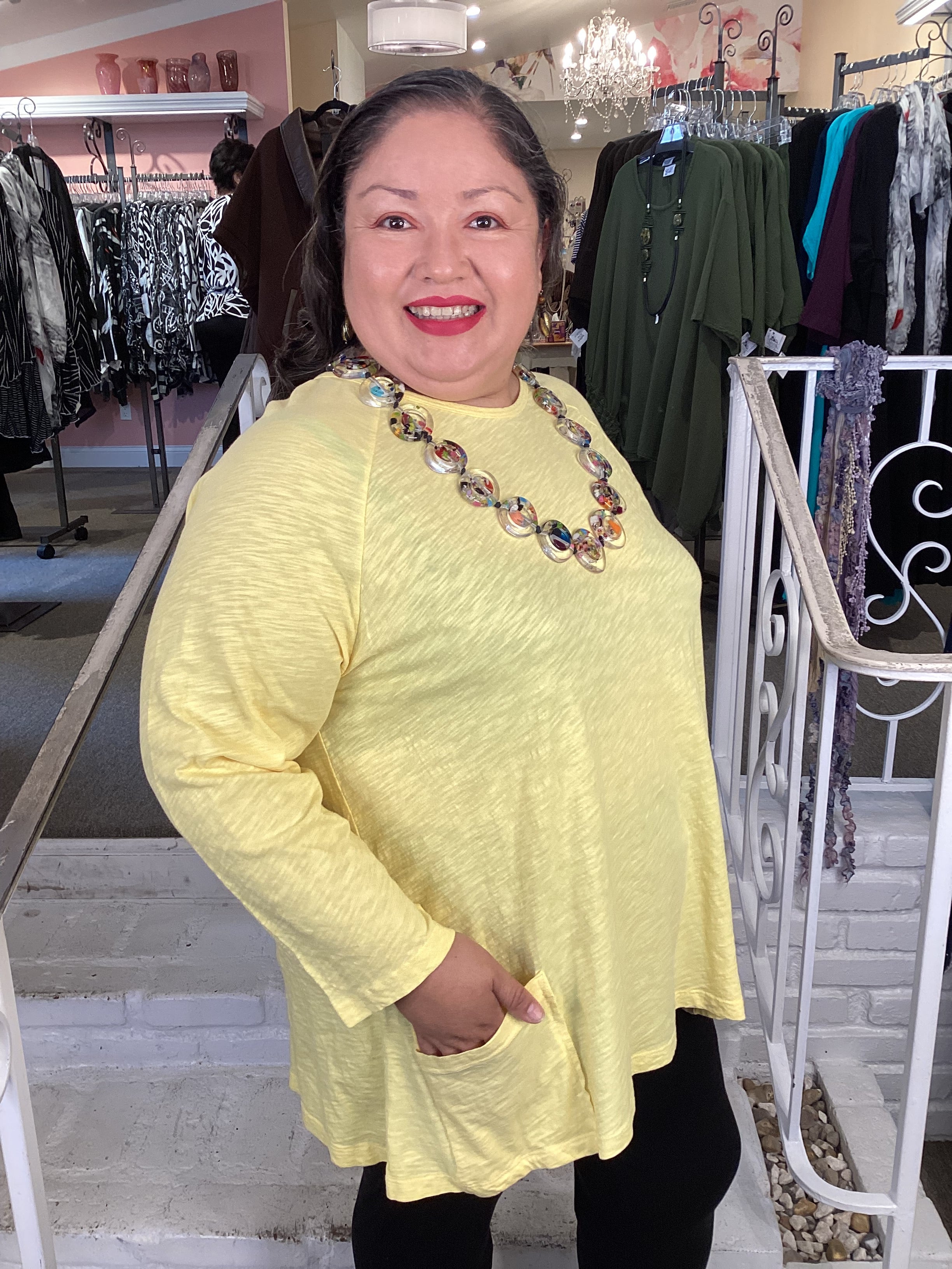 This a-line cotton knit tunic combines practical style with bold bright lilac color. The A-line silhouette flatters beautifully, while dual patch pockets add functional charm. Round neckline and elbow length sleeves.