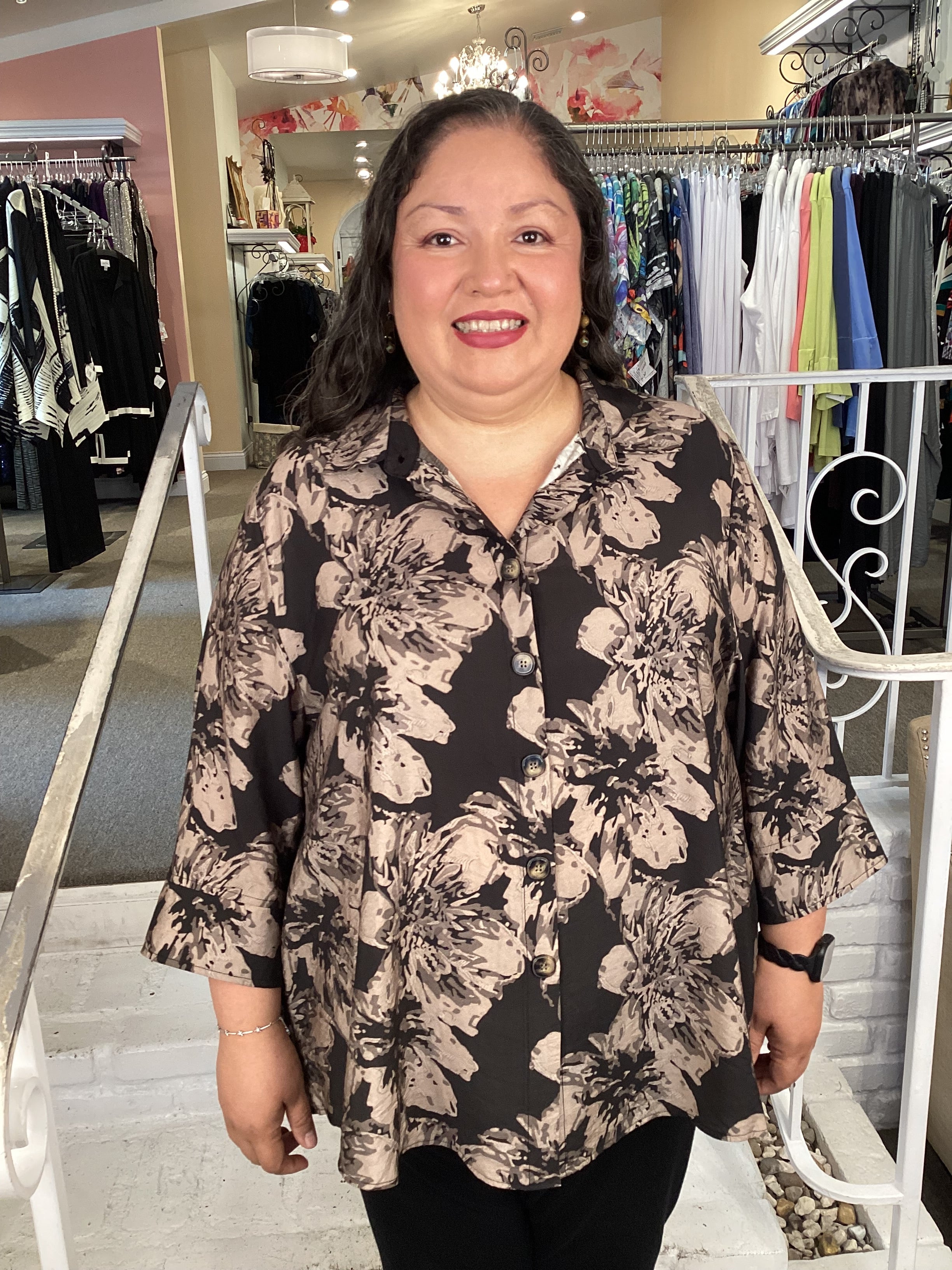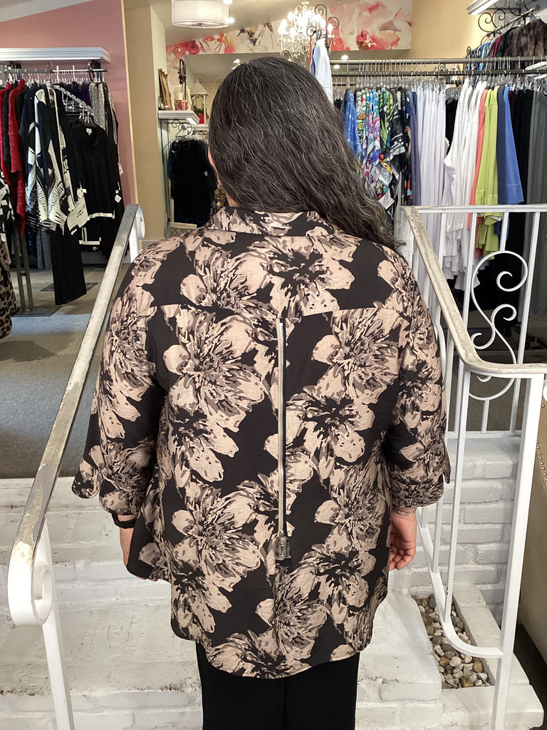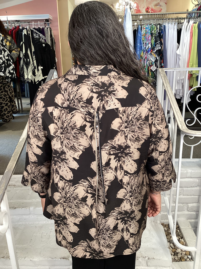 Isn't this the perfect fall blouse? Beige tone florals on black, lightly textured Rayon blend make this a-line top work for dressy or casual. The 3/4 sleeves are finished with double layer cuffs, side seam pockets, zipper detail on back panel. Model is wearing 2X.