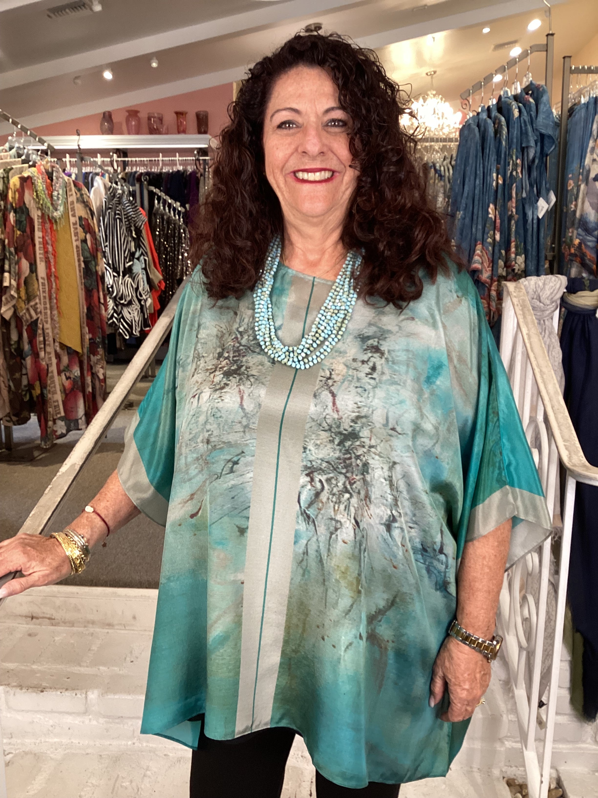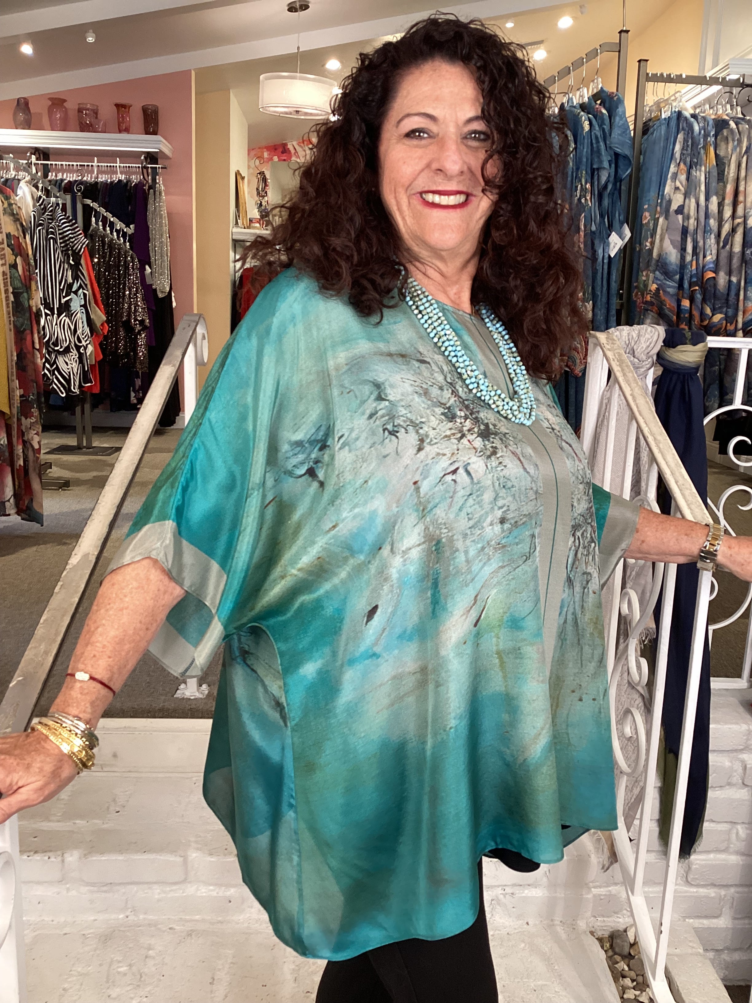 This silk tunic is the perfect evening companion. Crafted from 100% pure silk for a luxurious feel, the square pull over design is striking and eye-catching with its intricate, beautiful prints. This dressy tunic is sure to make a statement on any special occasion.