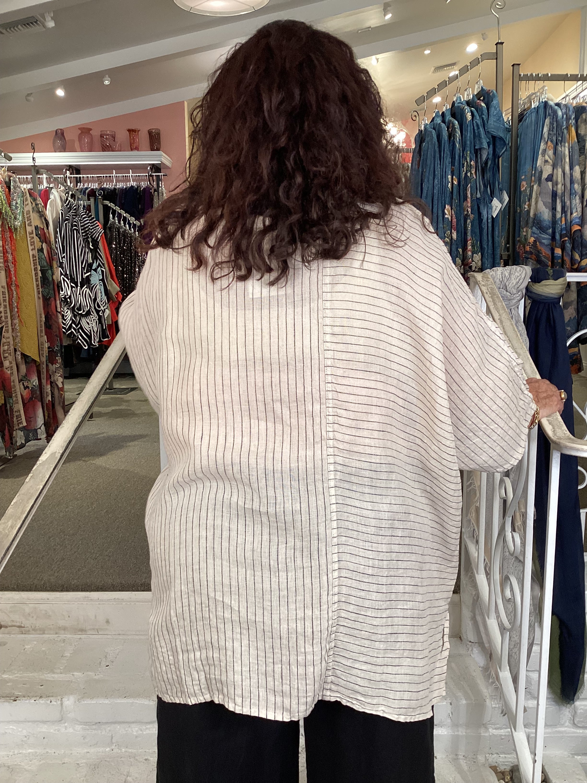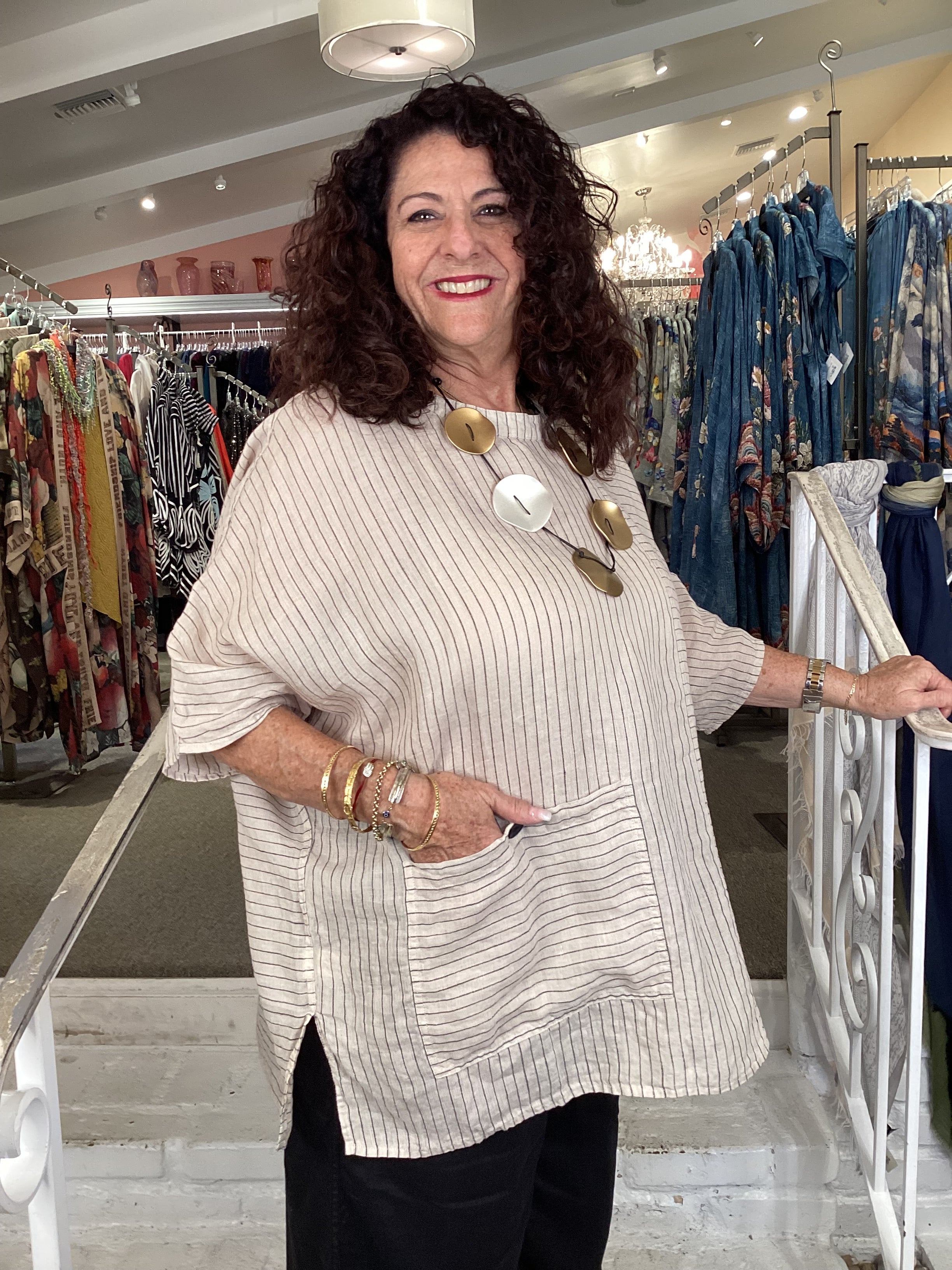This beige pullover top features sophisticated black pinstripes for understated elegance. An asymmetric button front and centered front pocket add practical detail to the relaxed, wide square silhouette. Elbow-length sleeves complete this versatile neutral that pairs seamlessly with any wardrobe, offering both comfort and refined style.