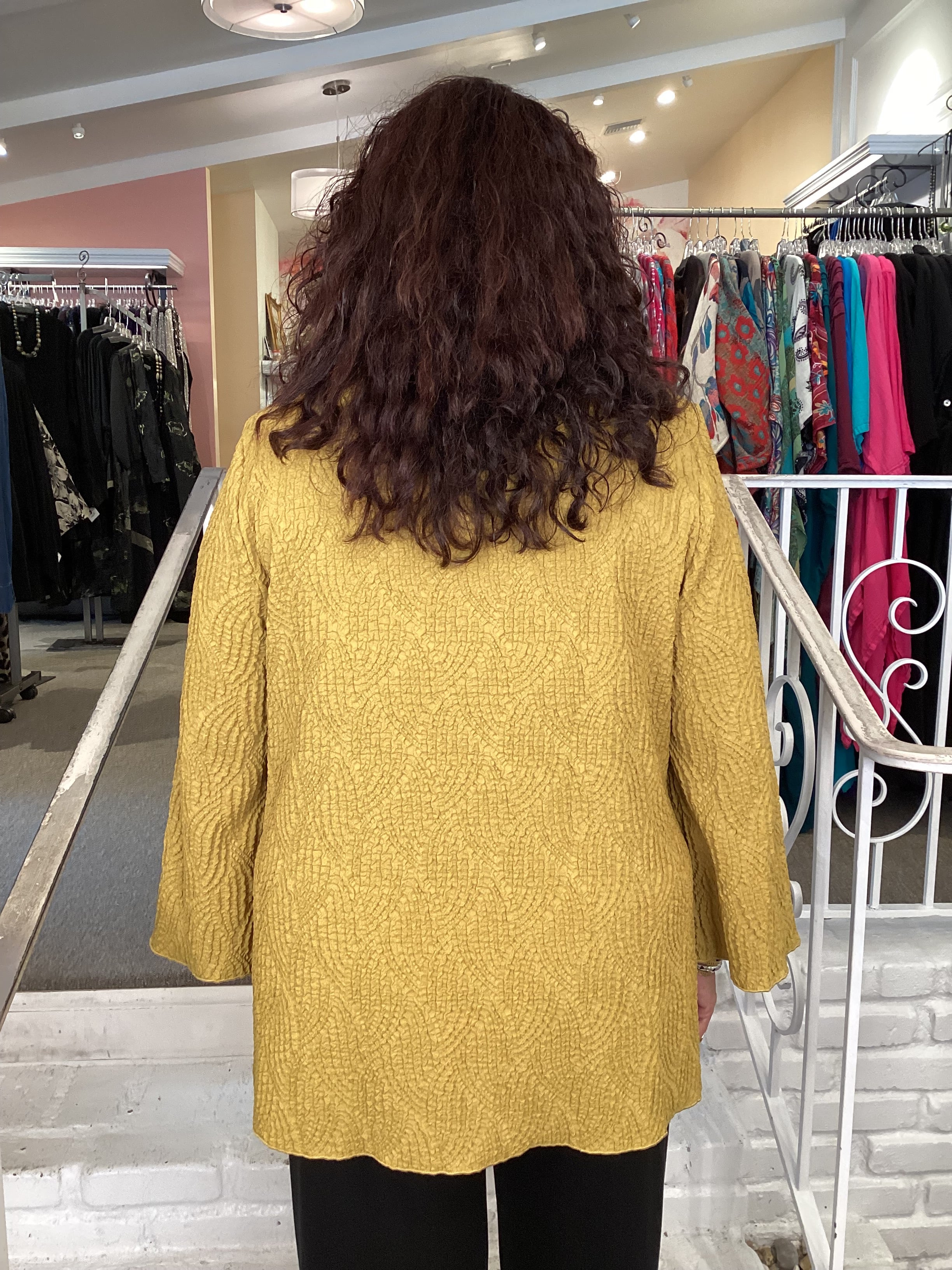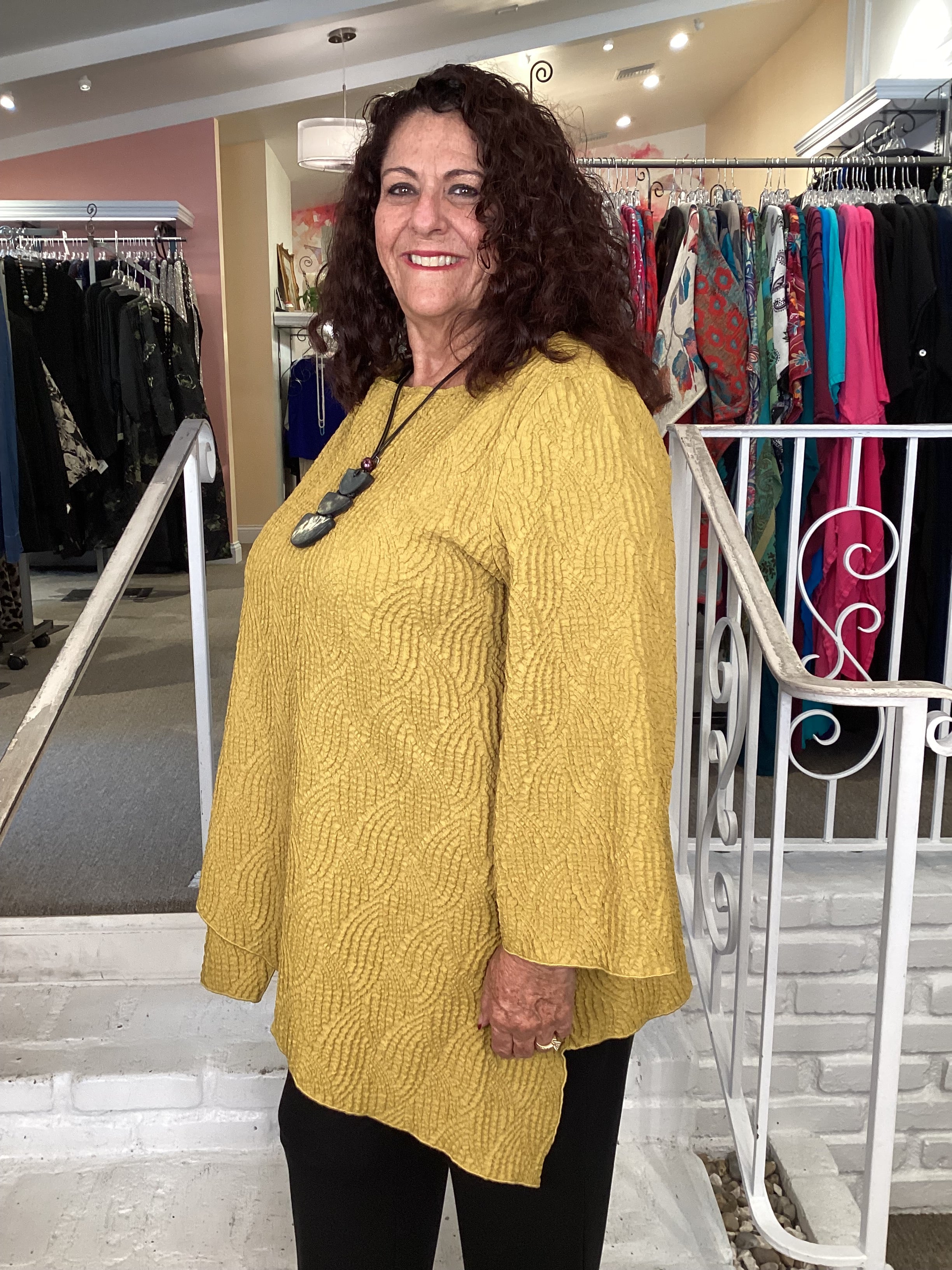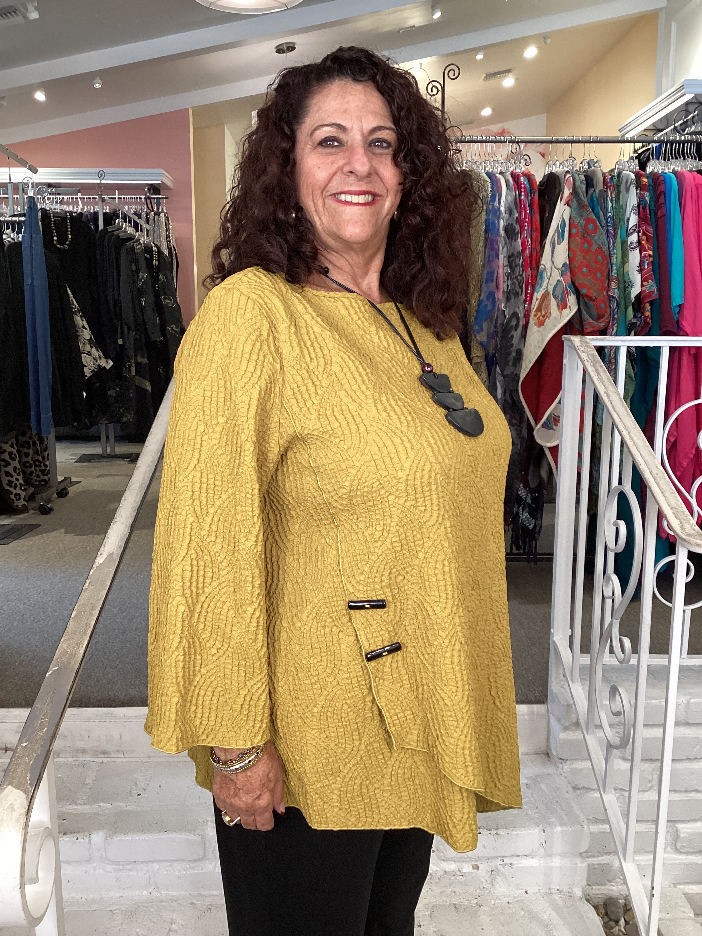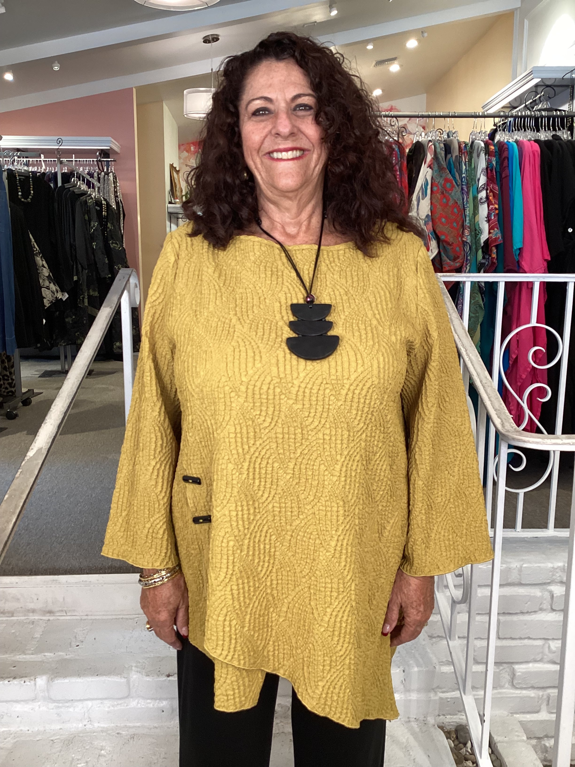 This roomy a-line top is all about shape and texture. The front panels overlap with asymmetric hem, button detail, bell sleeves, side seam pockets. The bust measures about 46", length 30", hips 54".