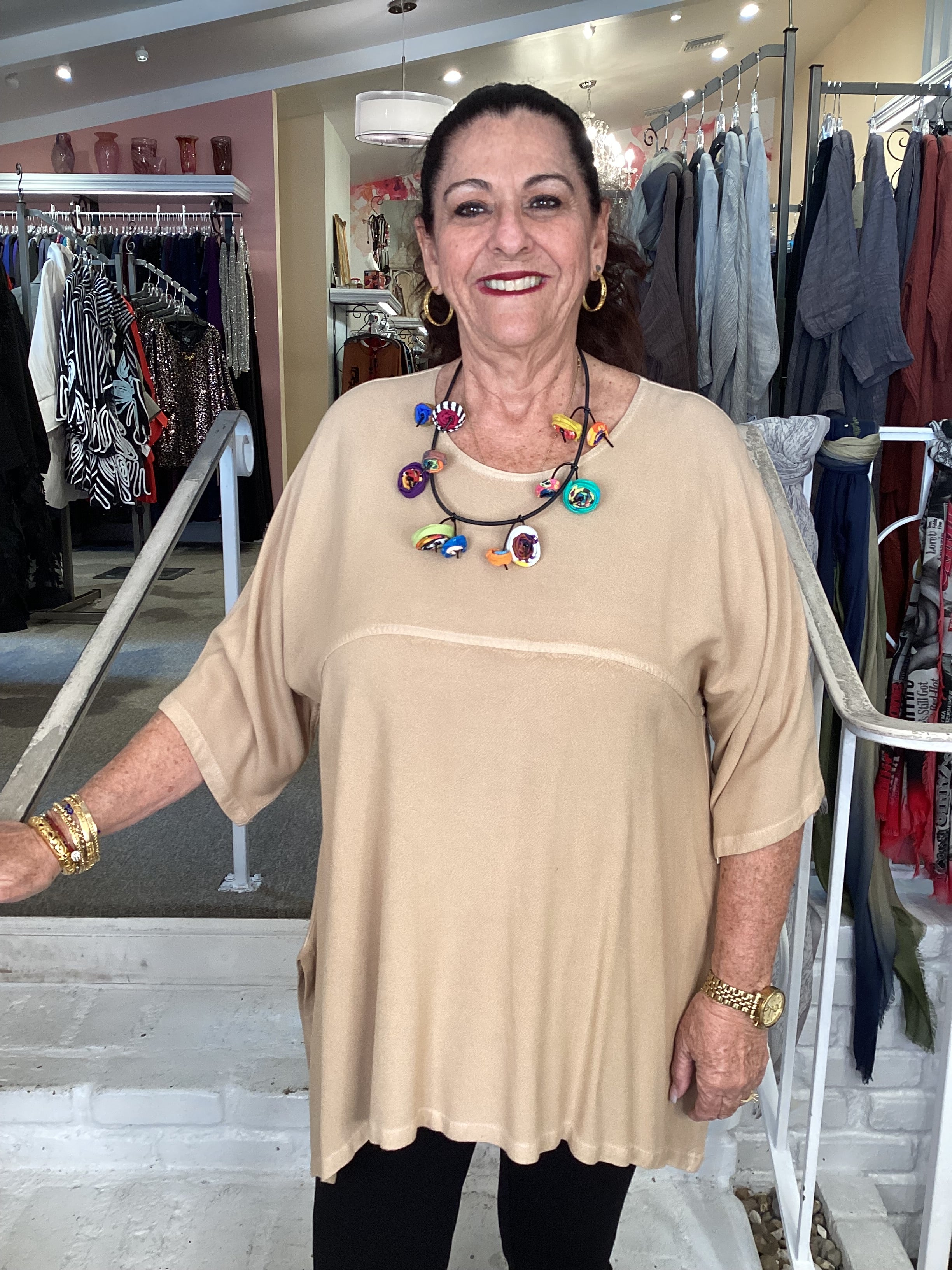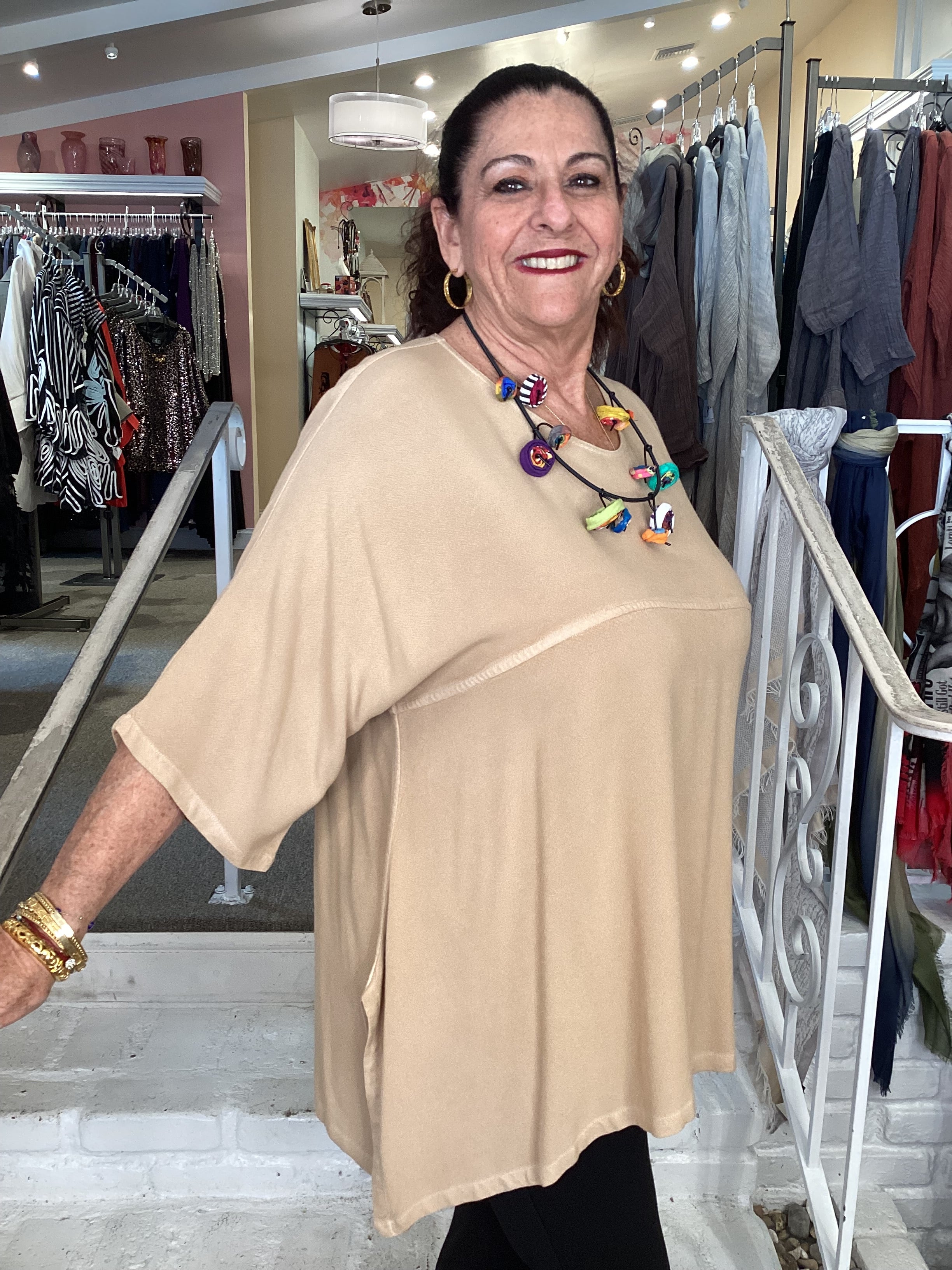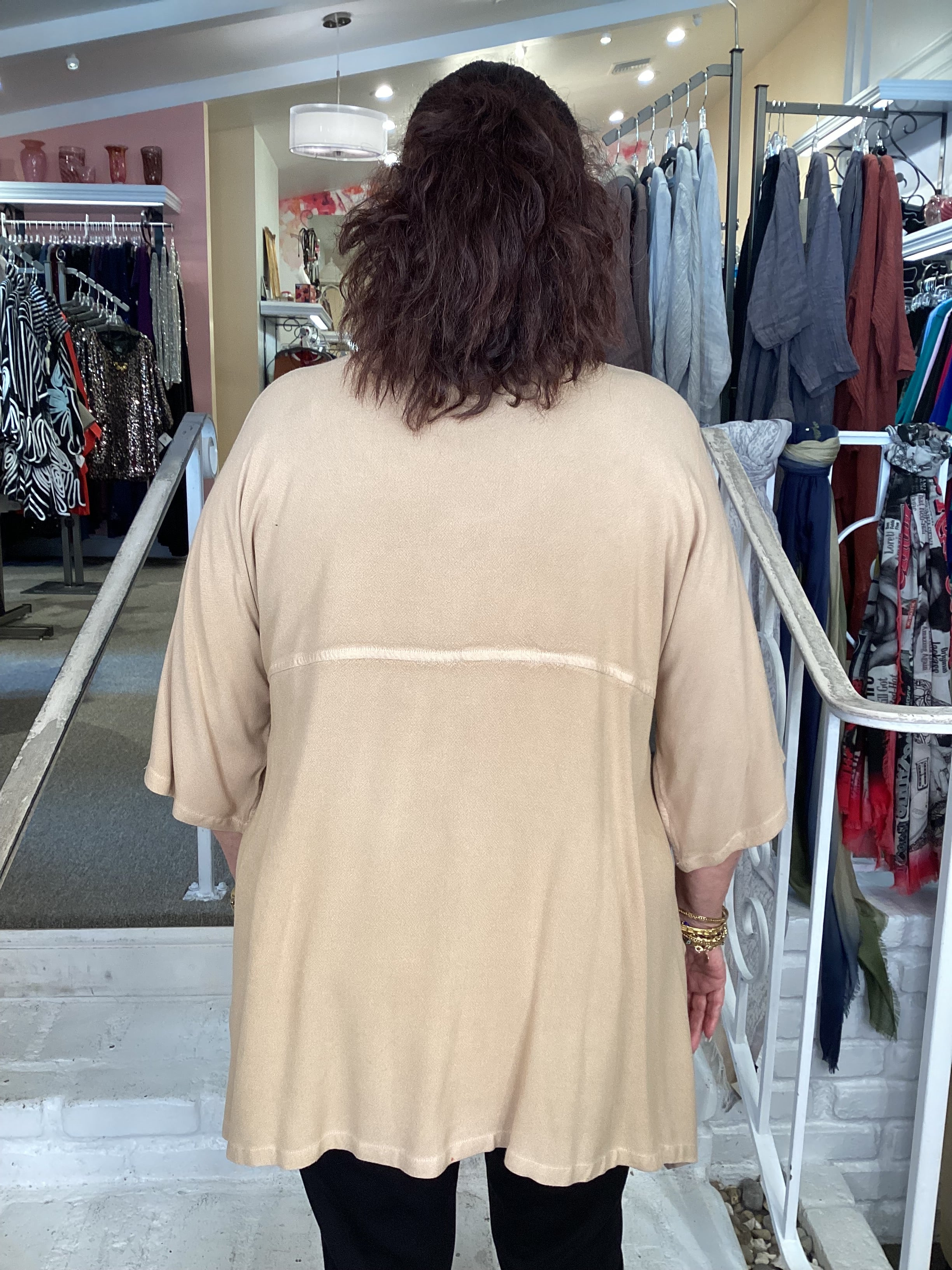 Expertly crafted with a flattering French seam that cinches below the bust, this generously proportioned tunic offers comfortable, flowing silhouettes. The three-quarter sleeves provide ease of movement while the flared hemline creates elegant draping with practical side openings. Designed as a versatile one-size piece that accommodates various body types with grace and style.