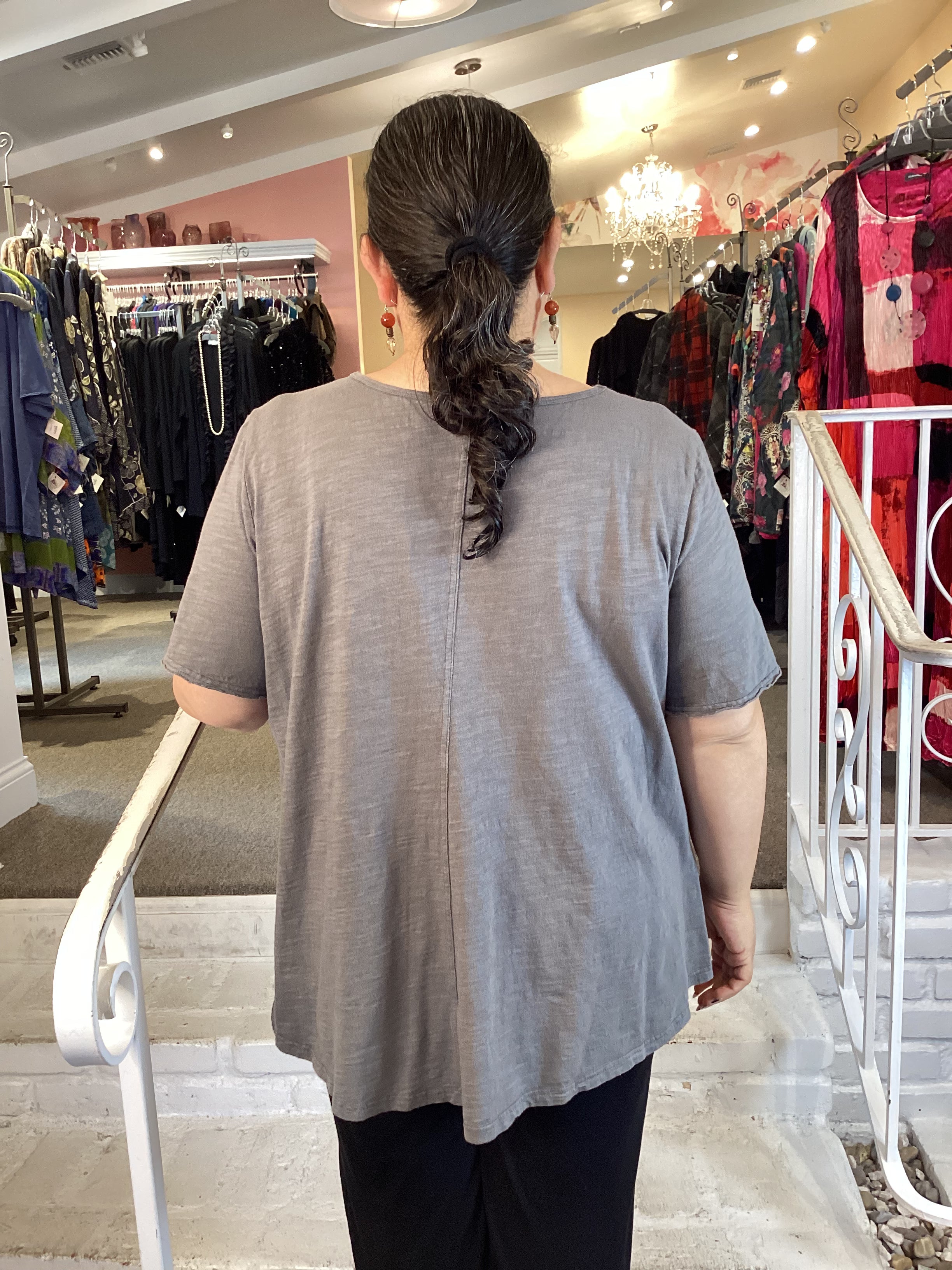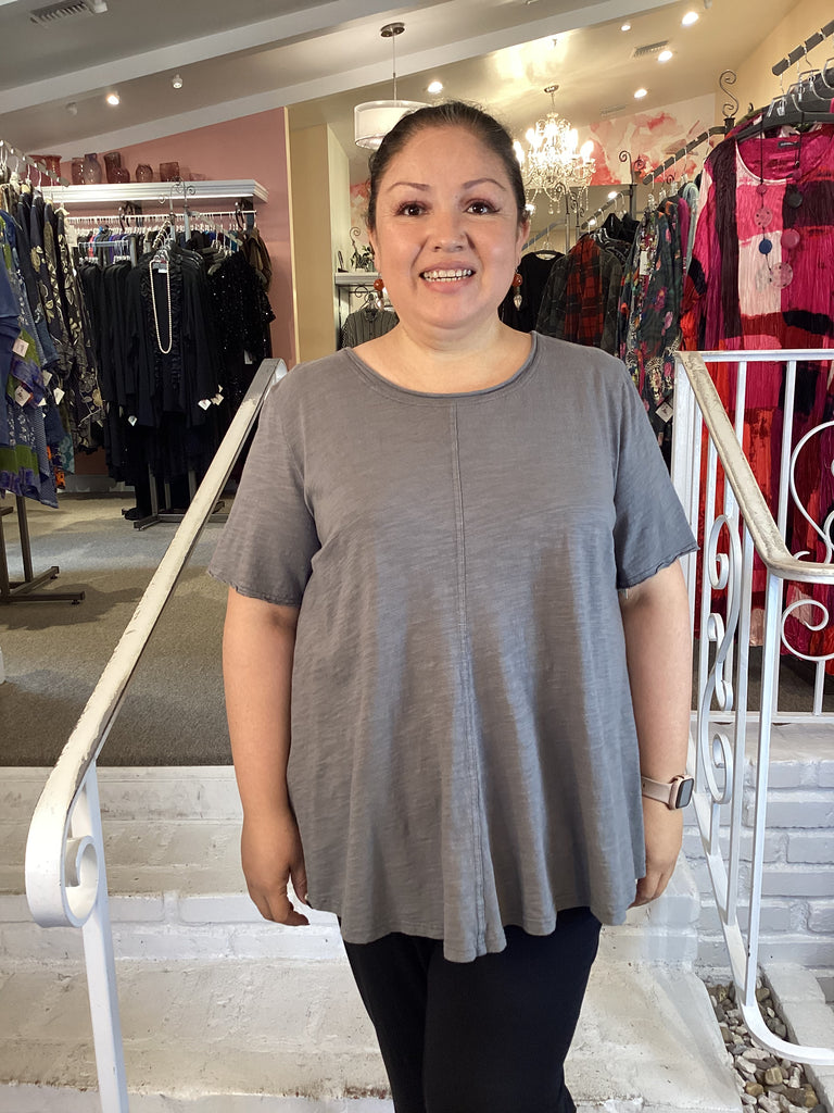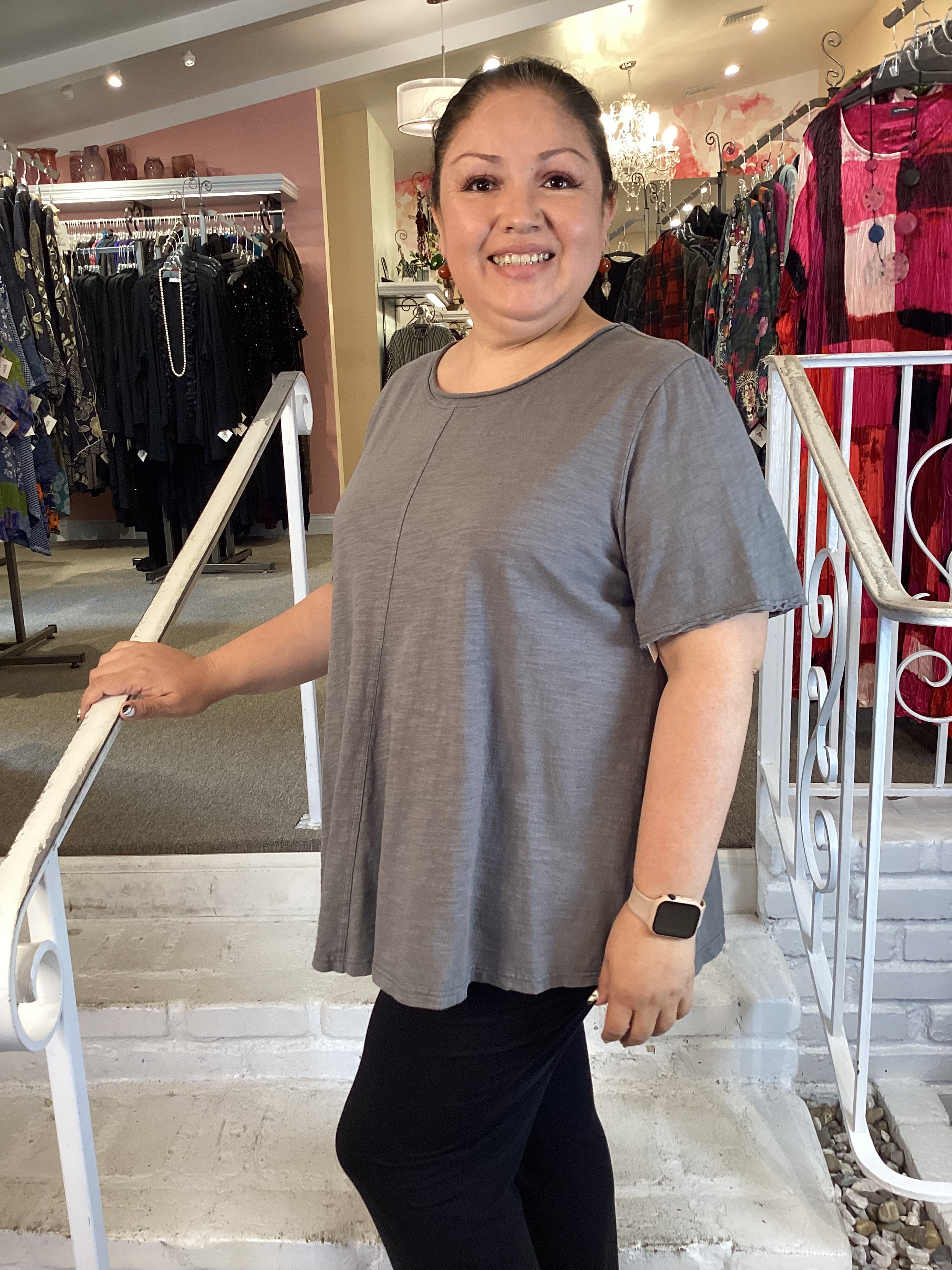 Kleen's short sleeve top made with soft cotton has a scoop neck, short sleeves and seam details front and back center. The A-line shape falls nicely over the hips with a curved hemline. The neck and sleeves are finished with a rolled edge for a casual look.