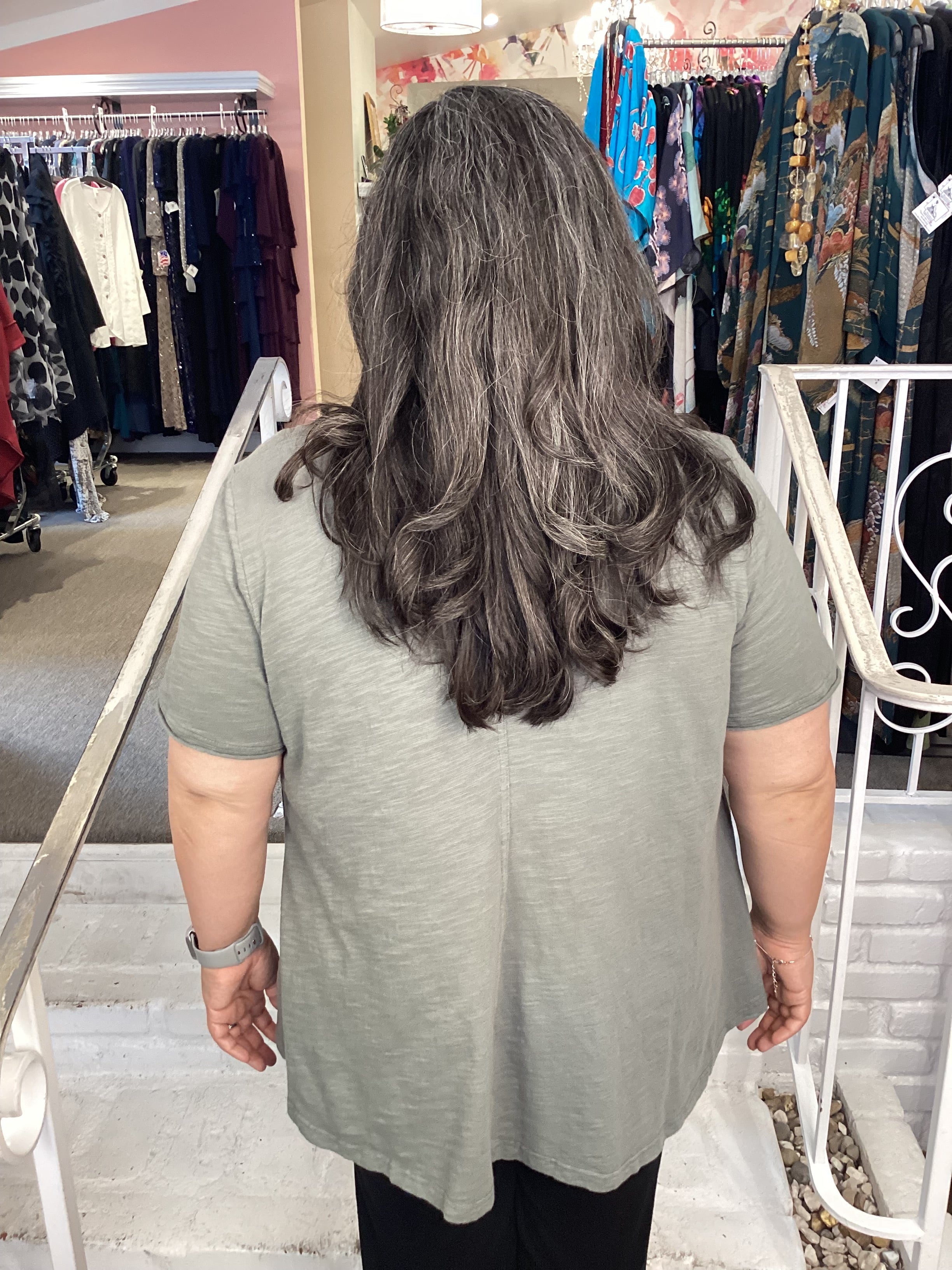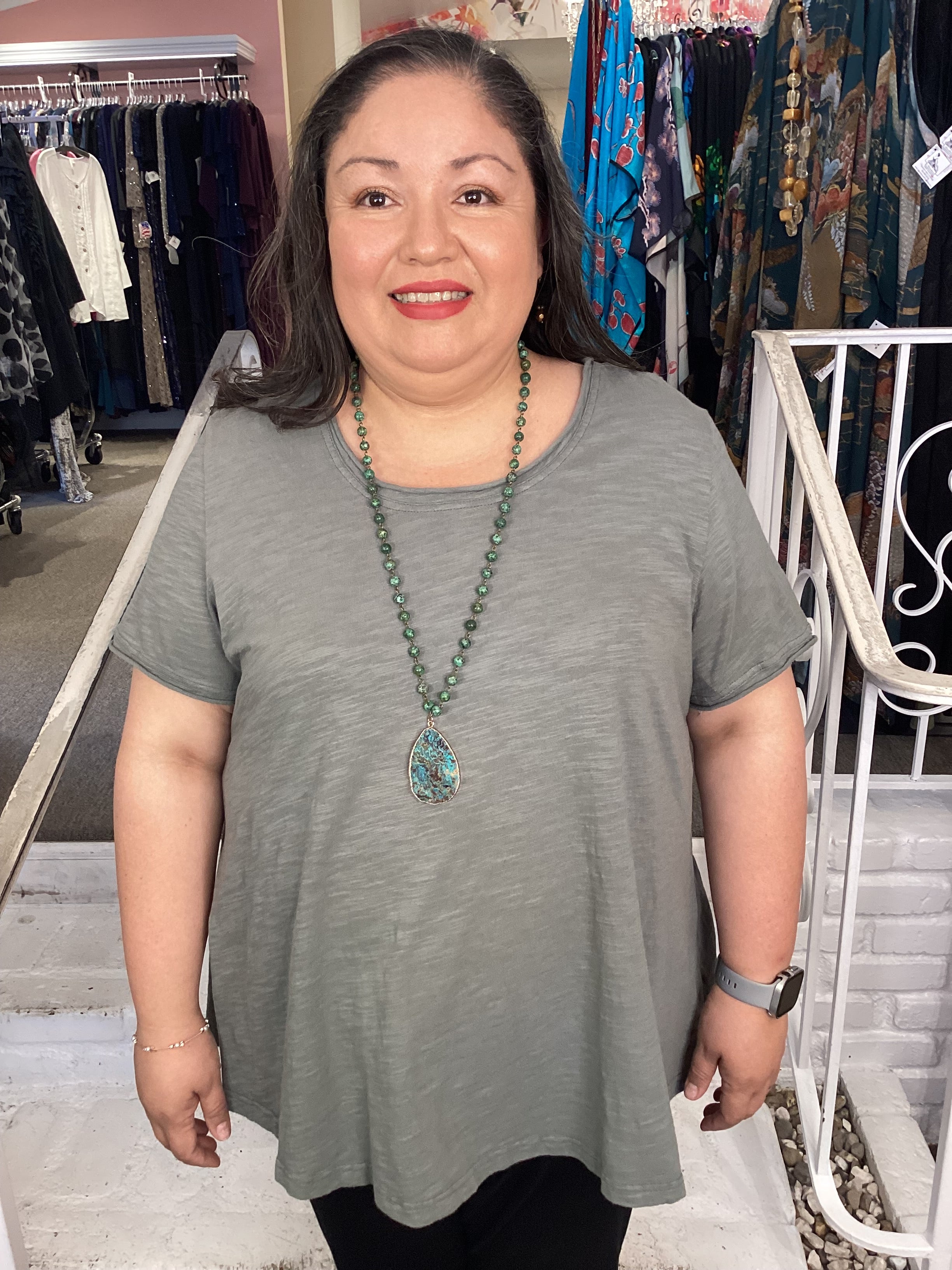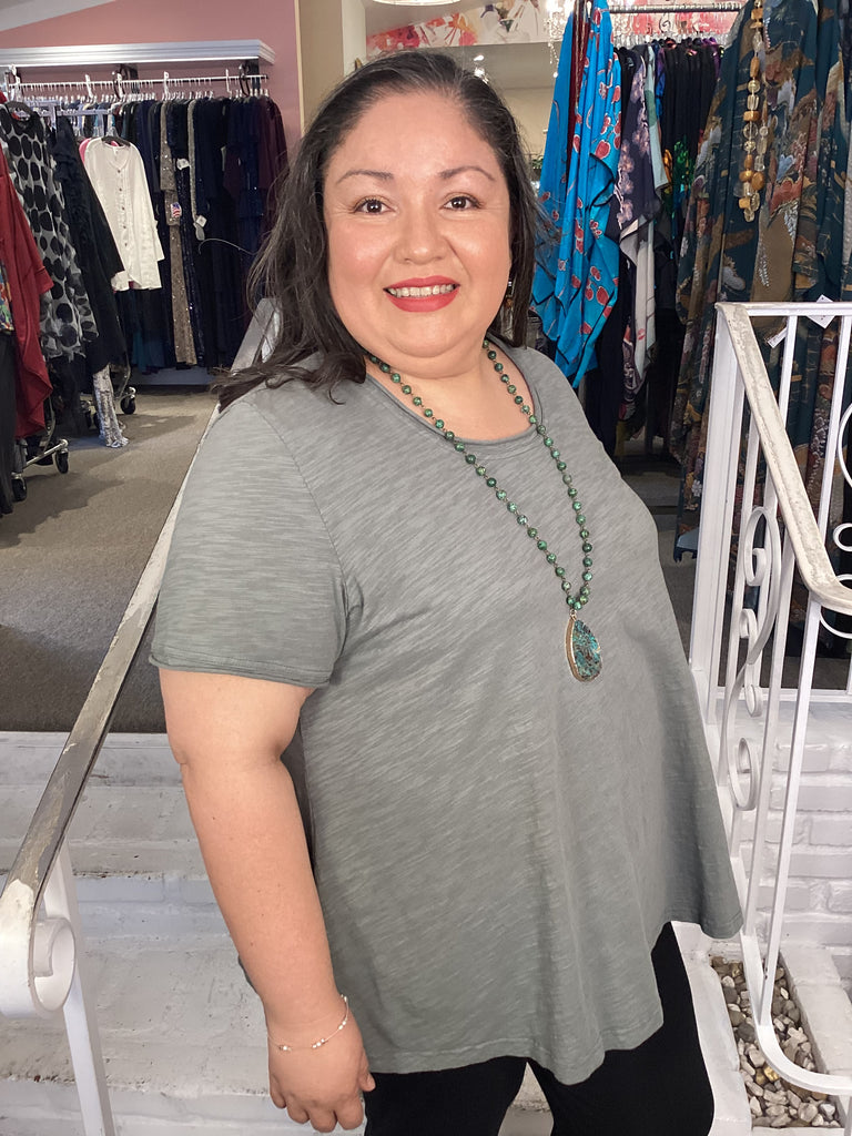 Kleen has this fabulous short sleeve top made with soft cotton. This T-shirt top has a scoop neck and short sleeves. The A-line shape falls nicely over the hips with a curved hemline. The hems on the neck and sleeves are rolled for a casual look.