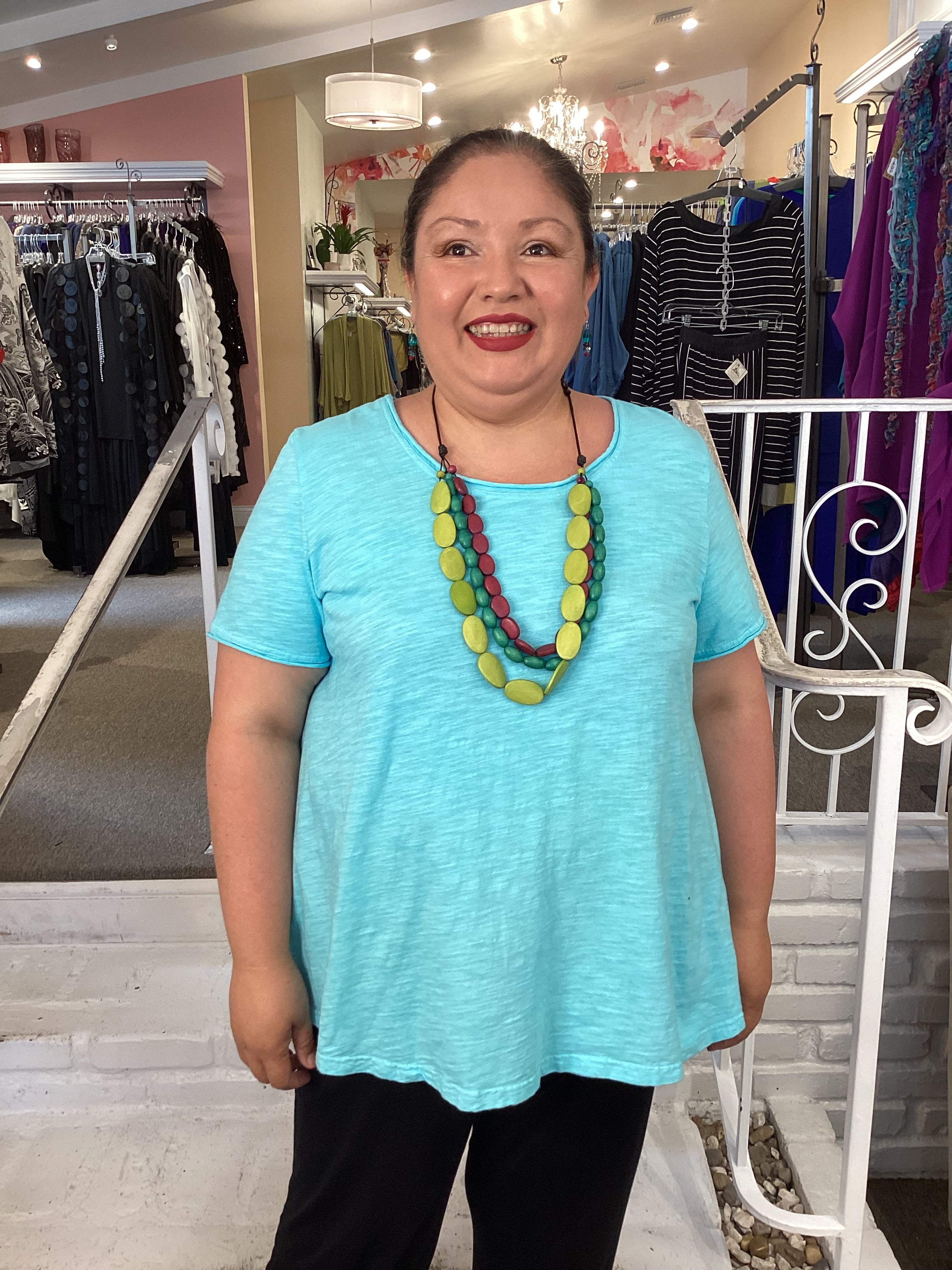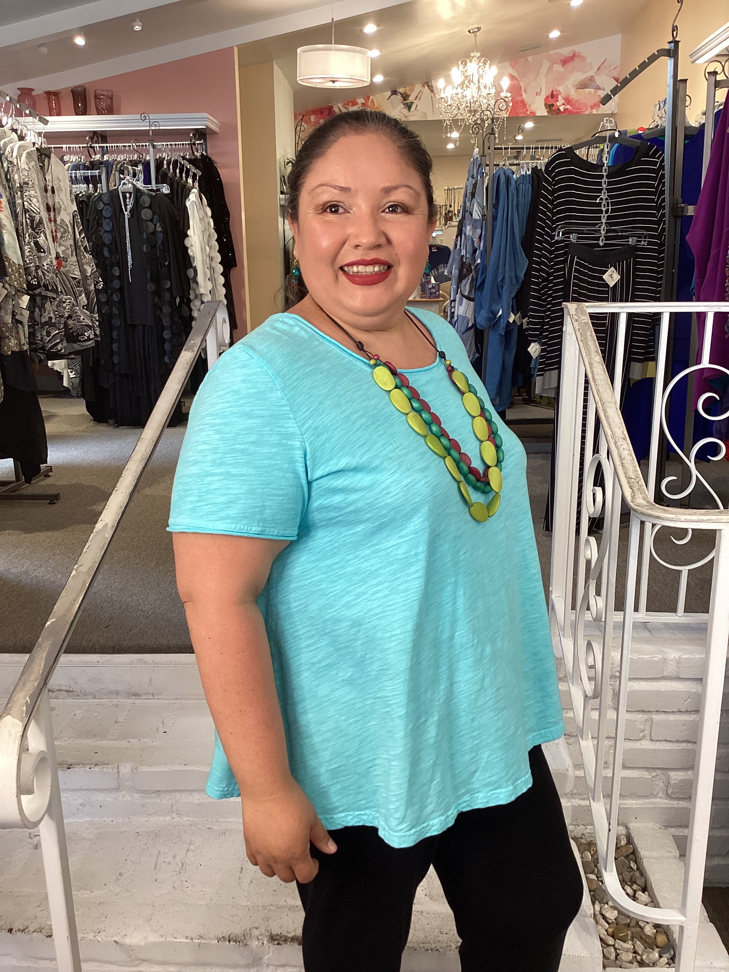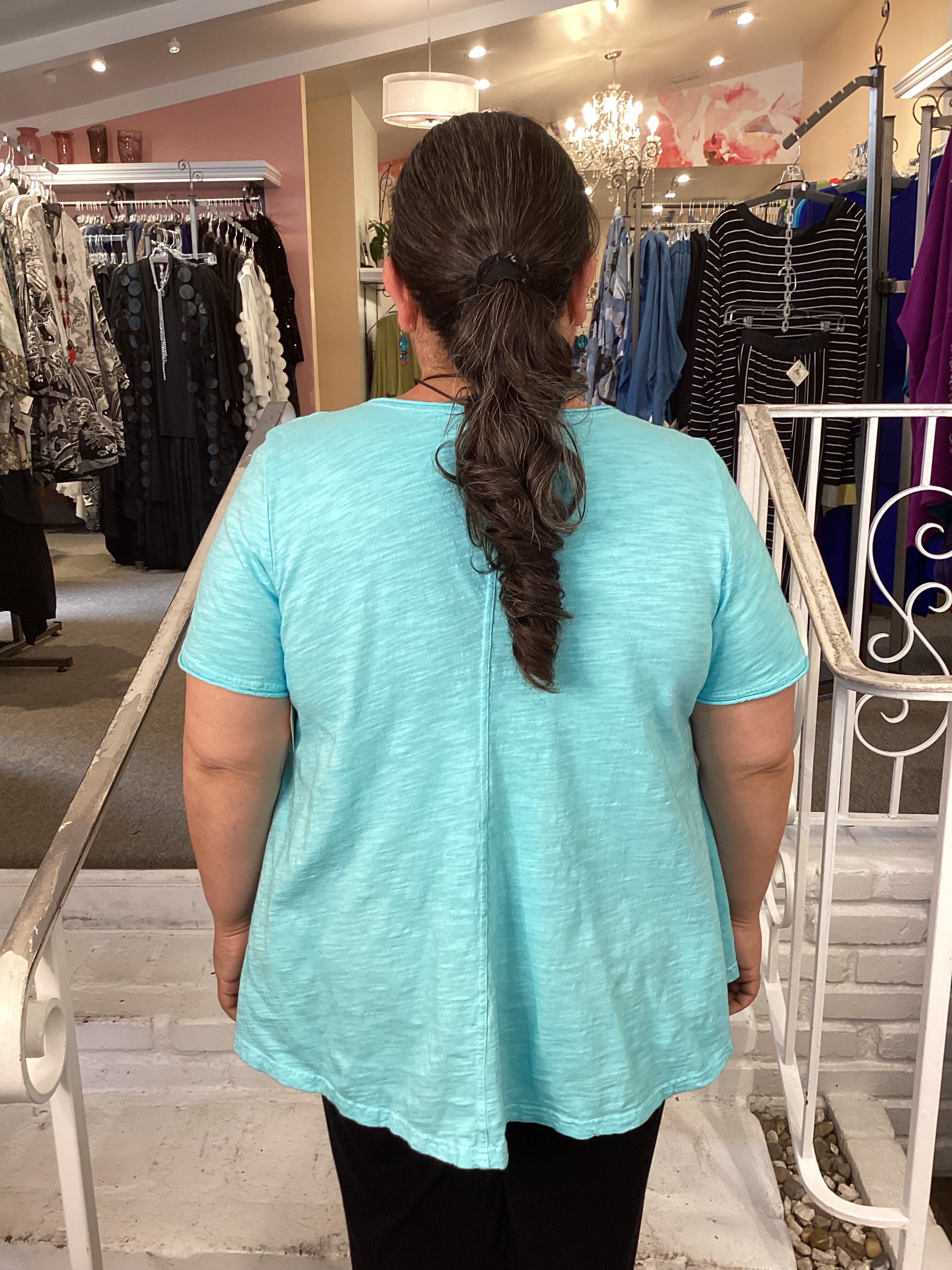 Kleen has this fabulous short sleeve top made with soft cotton. This T-shirt top has a scoop neck and short sleeves. The A-line shape falls nicely over the hips with a curved hemline. The hems on the neck and sleeves are rolled for a casual look.
