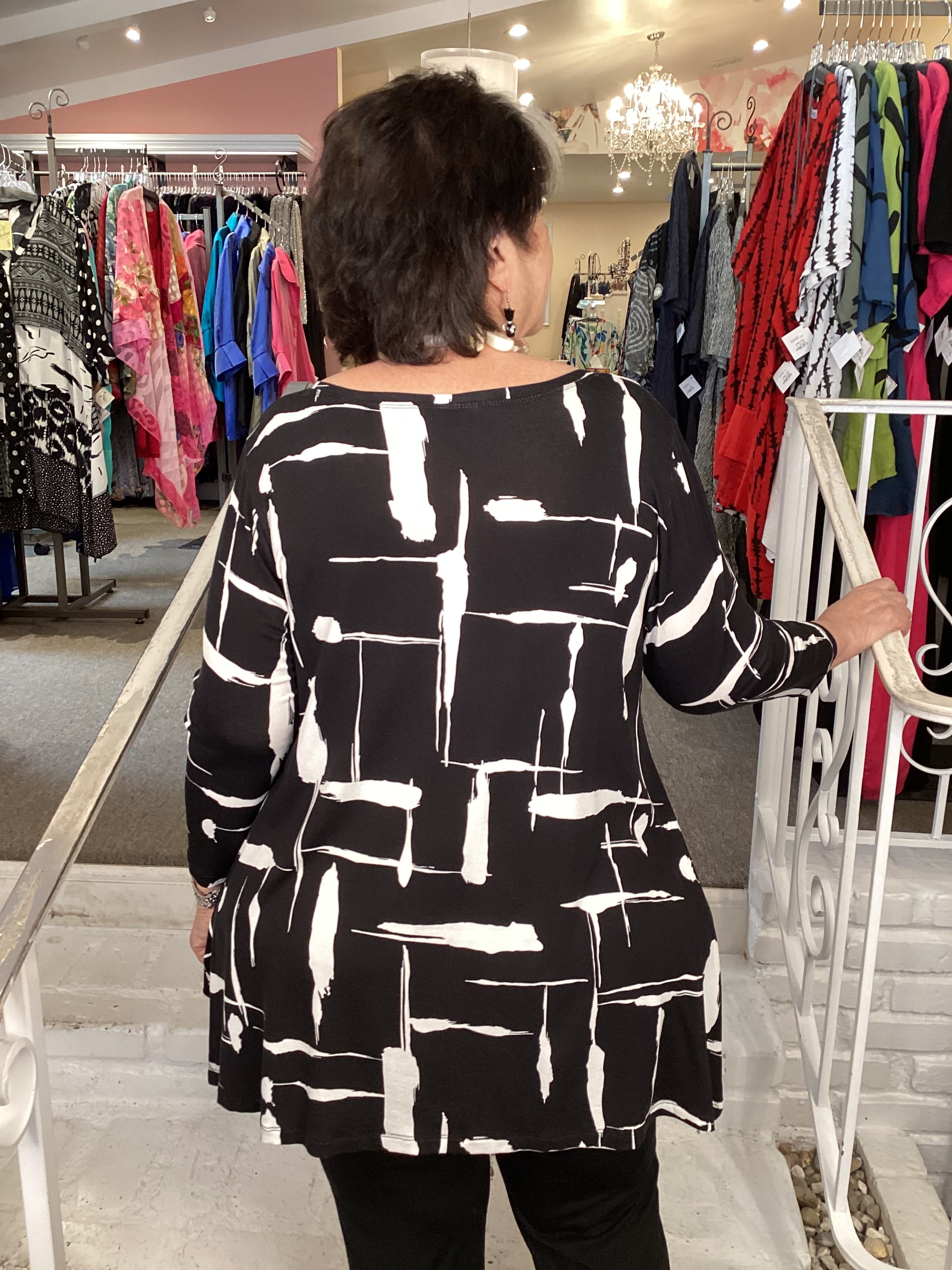 Expertly crafted for comfort and style, our SALSA TEE -SHADOW JERSEY is the perfect addition to your wardrobe. With a round neckline, 3/4 sleeves, and a versatile a-line silhouette, this shirt is both flattering and comfortable. The clipped sides create a unique double point front hem, adding a touch of visual interest.