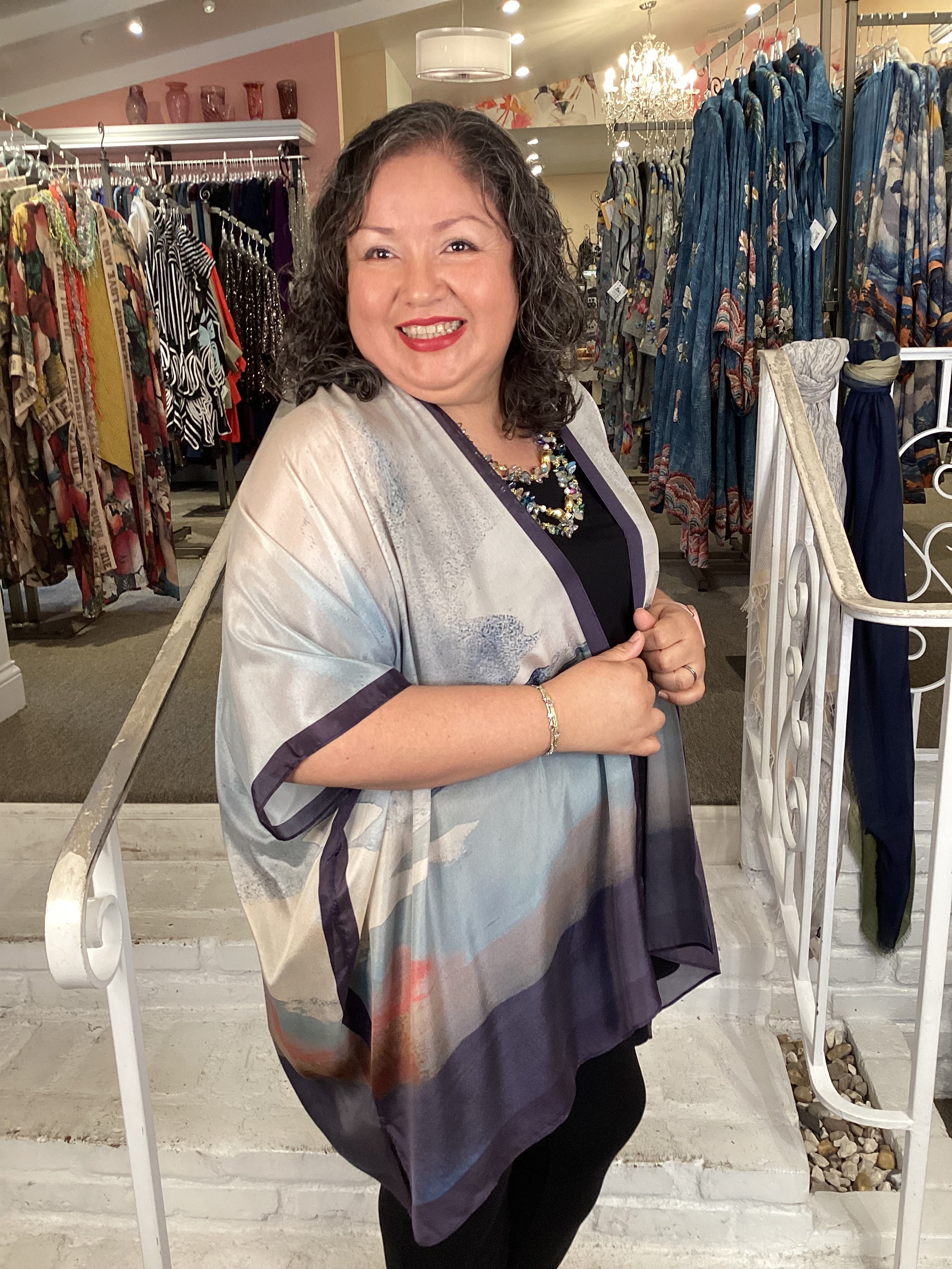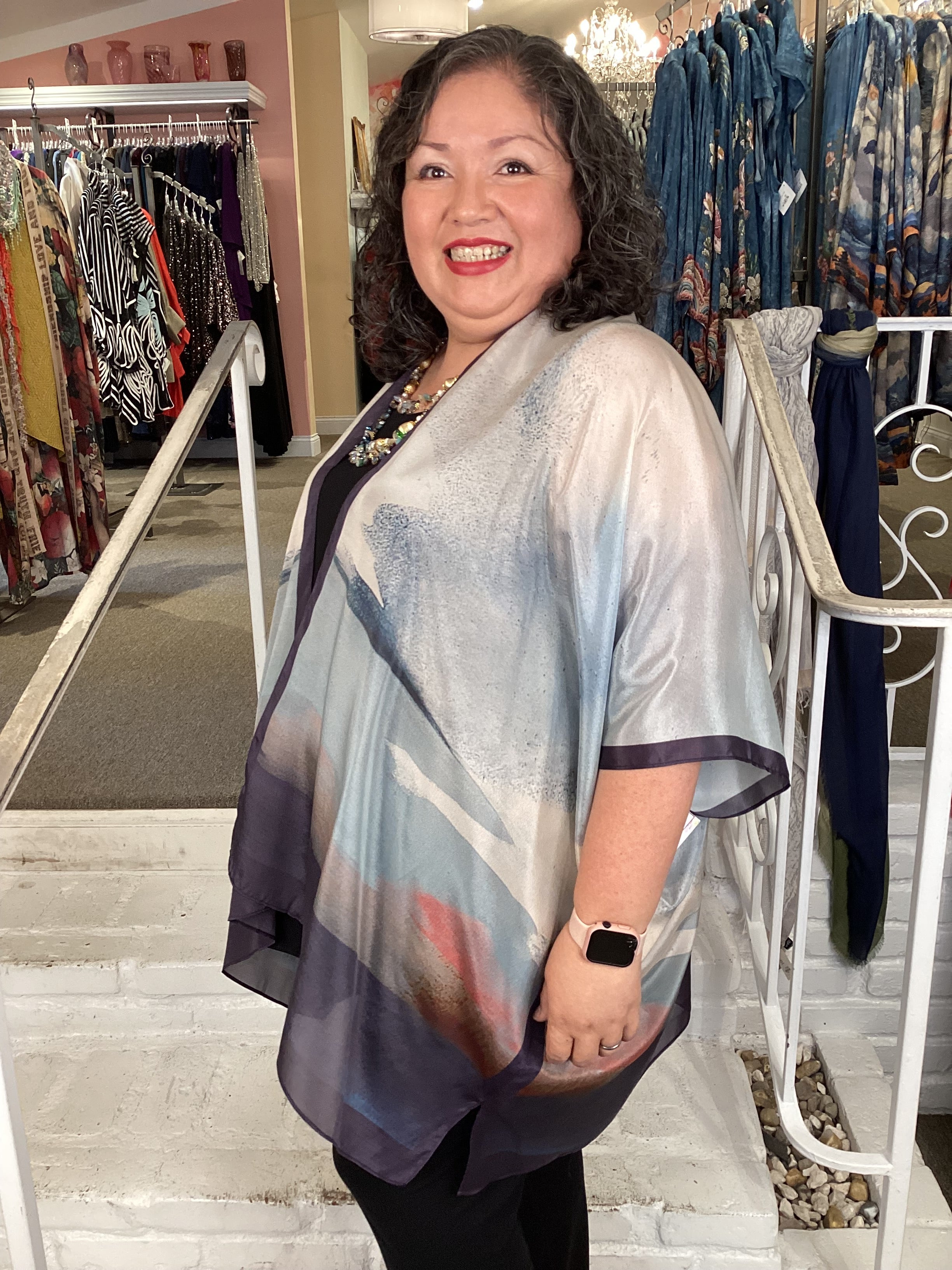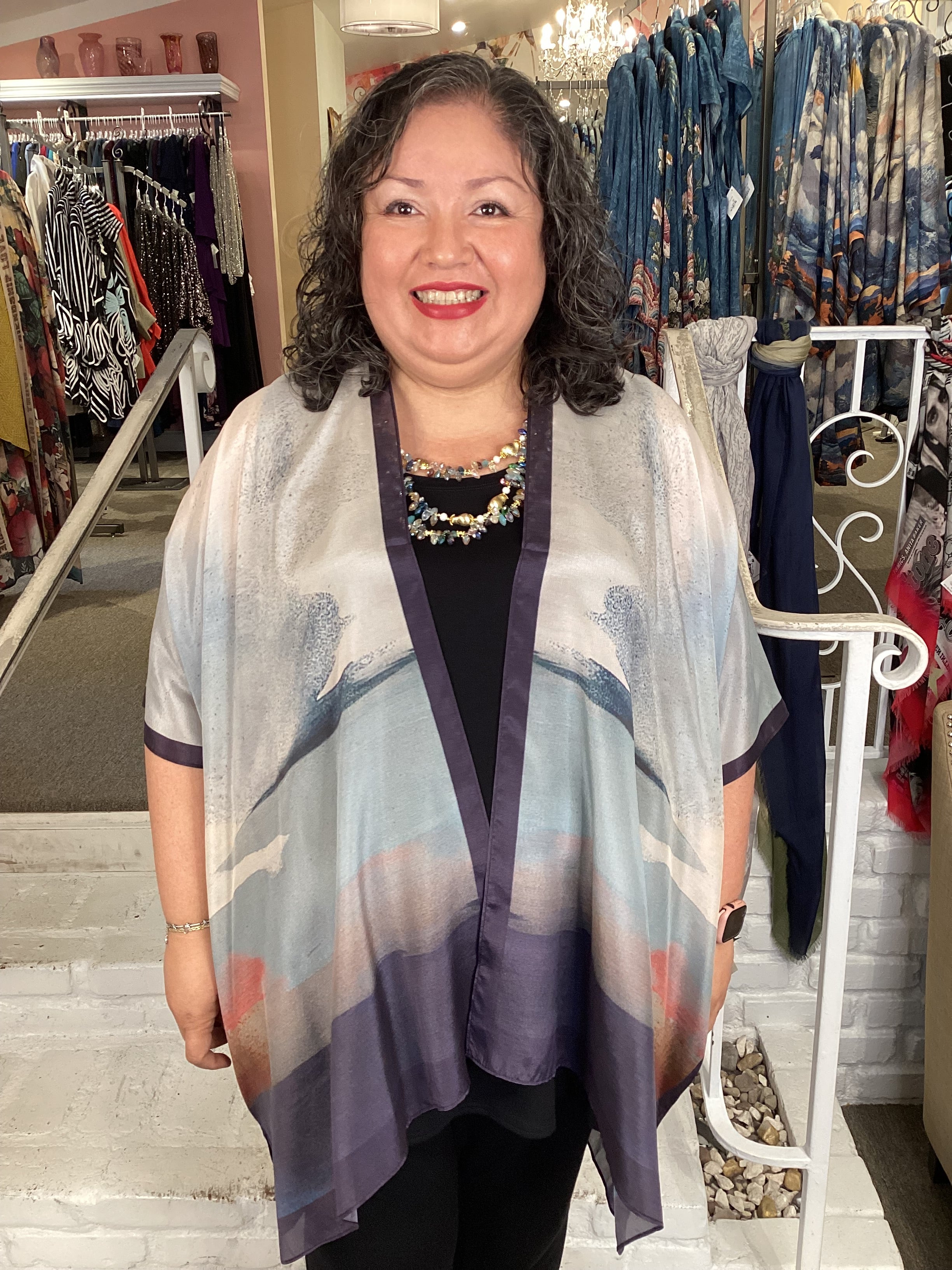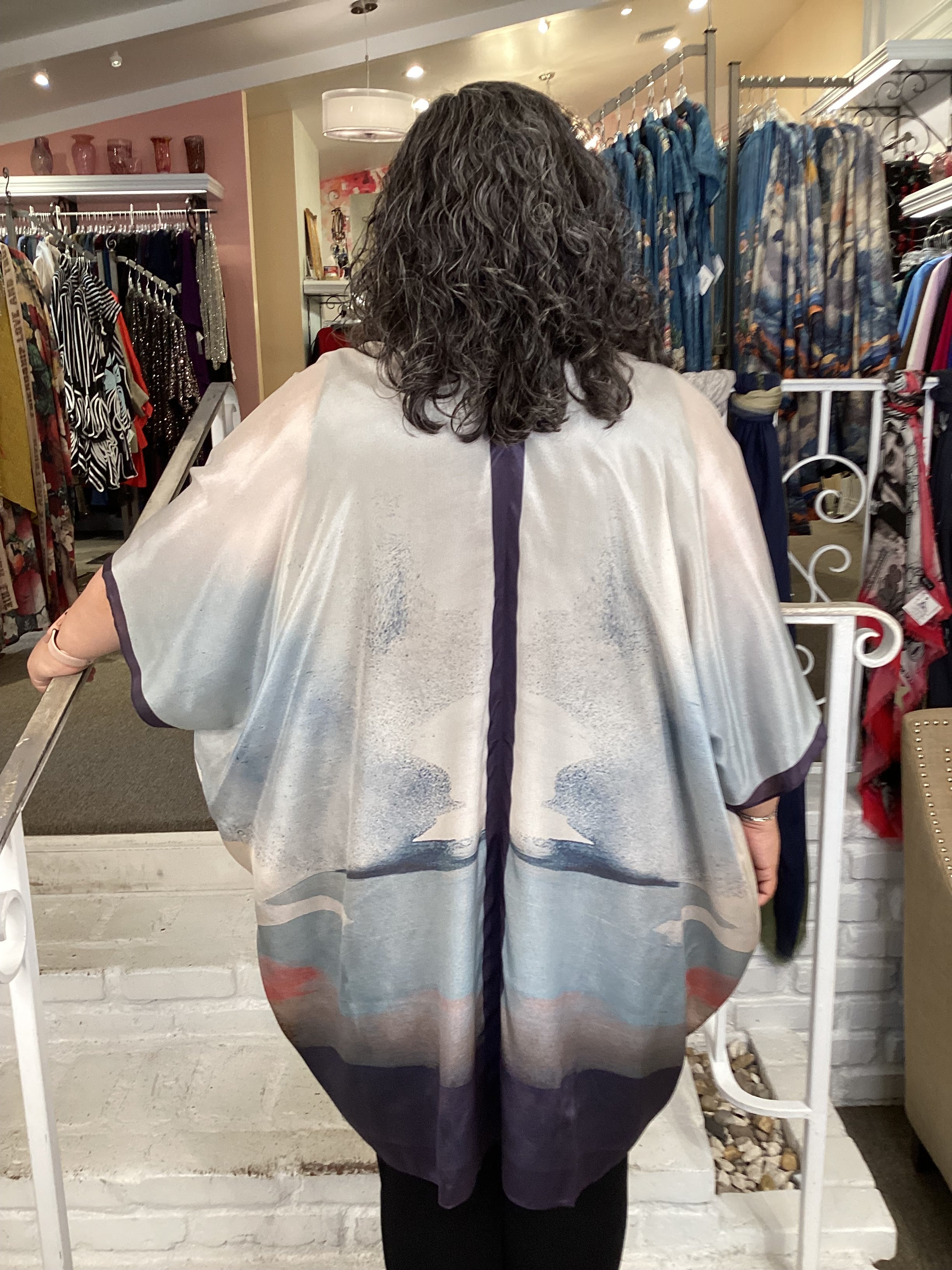Slip into pure silk elegance with this show-stopping kimono from Cocoon. Its captivating prints and rich colors work magic over everything—pair it with your favorite dress, jeans, or separates for instant glamour or laid-back boho vibes. Whether you're celebrating as the mother of the bride, making an entrance at a gallery, or treating yourself to a fabulous dinner night, this 100% silk piece transforms any occasion into something unforgettable.