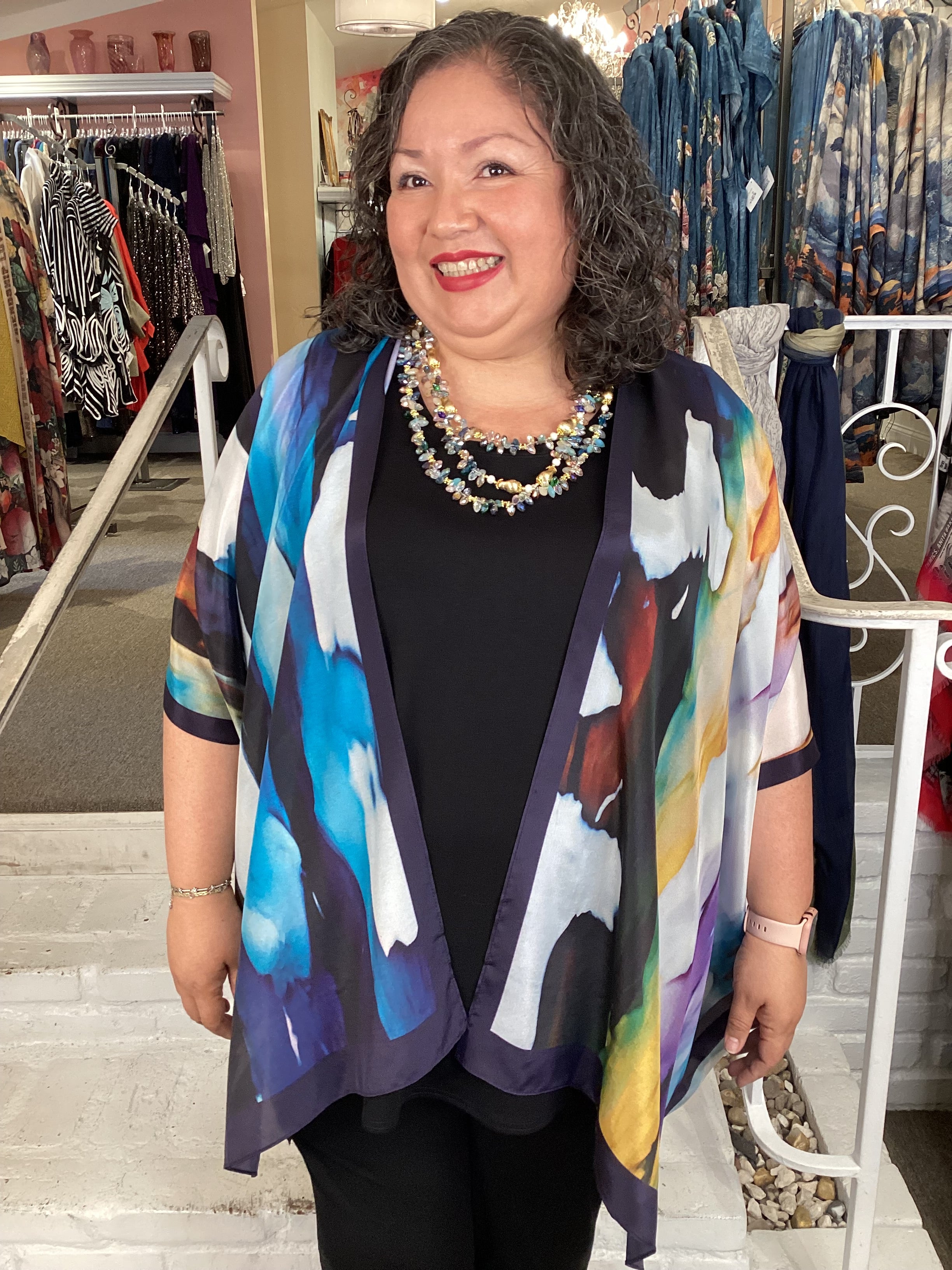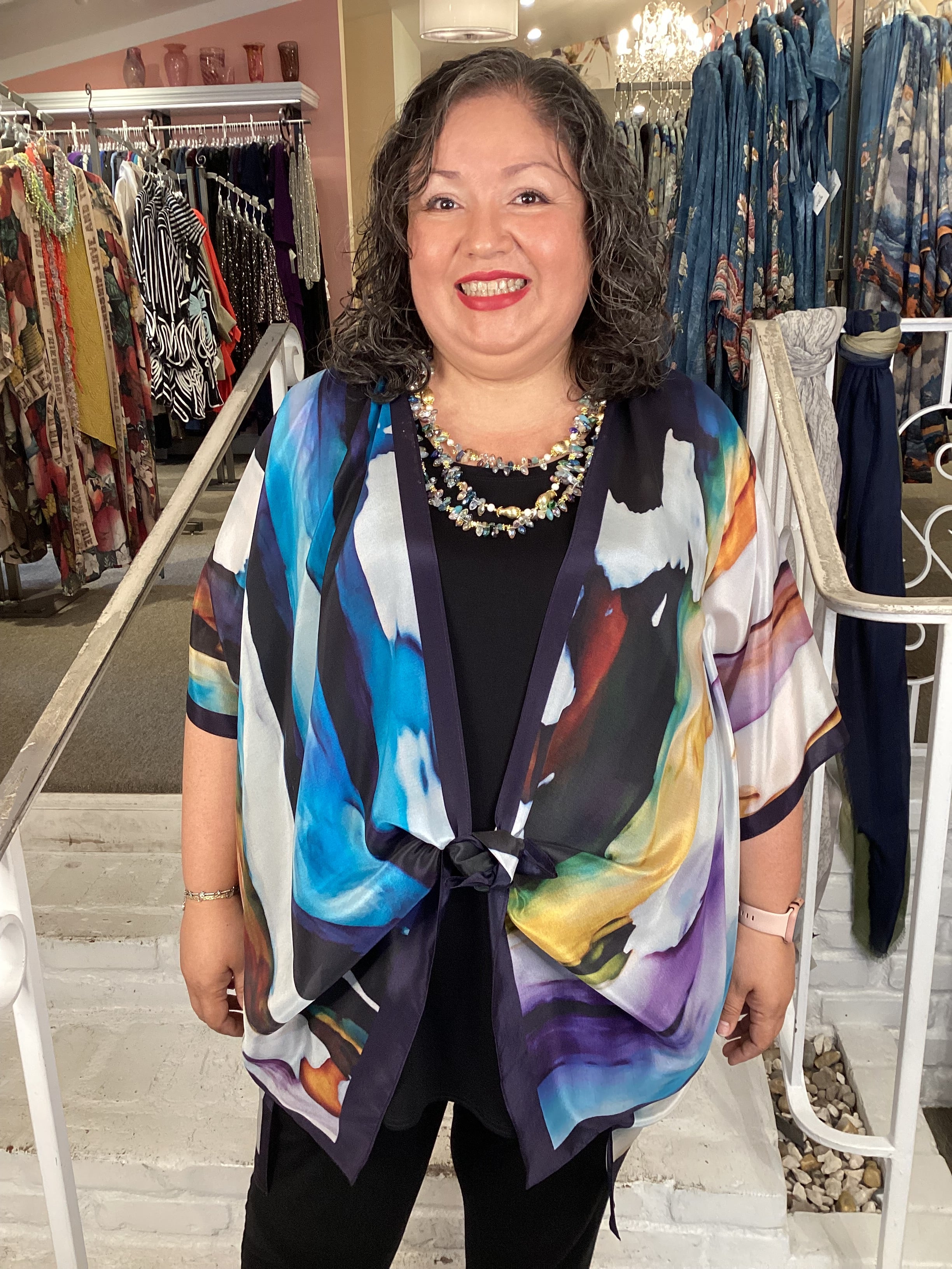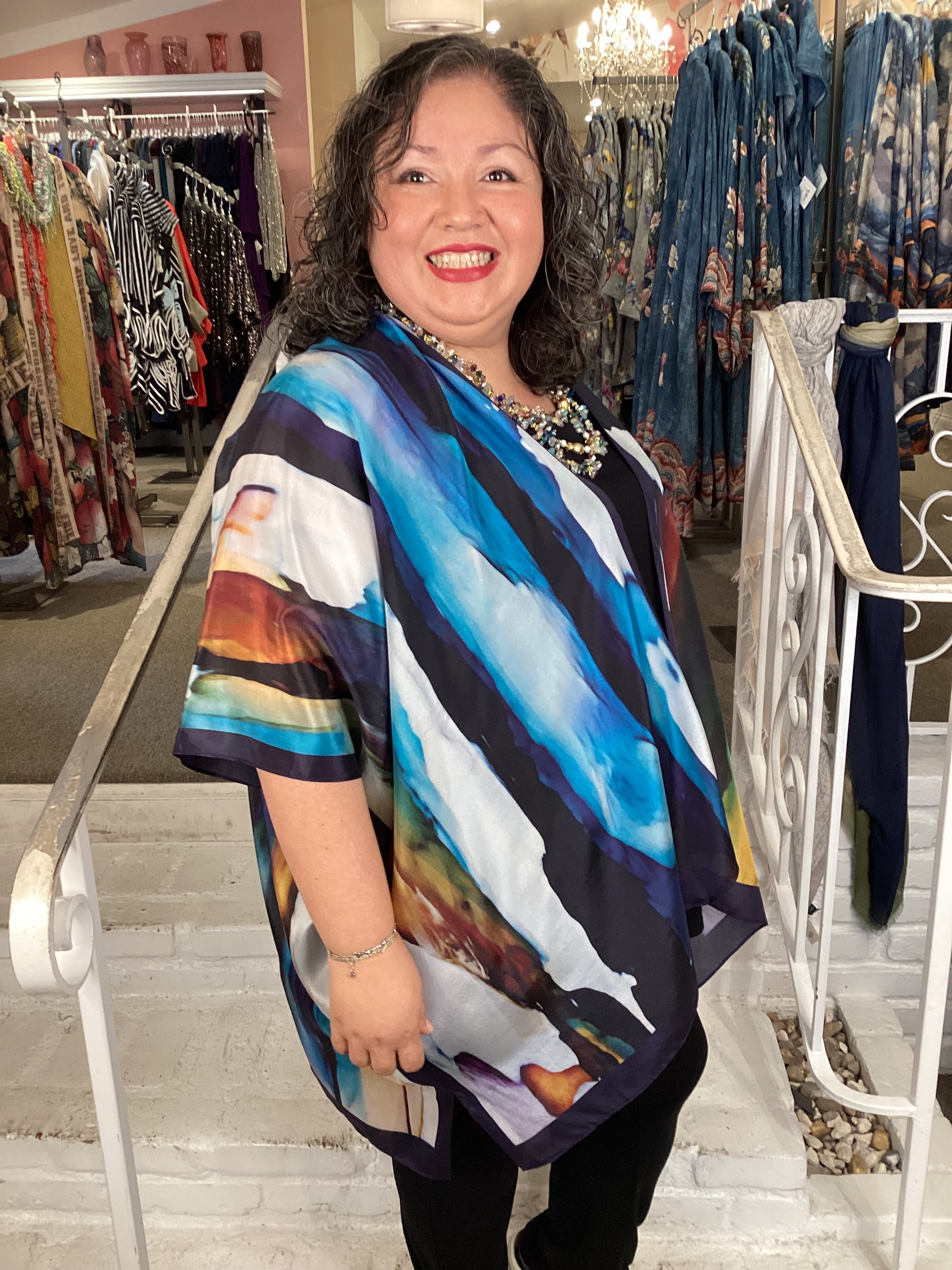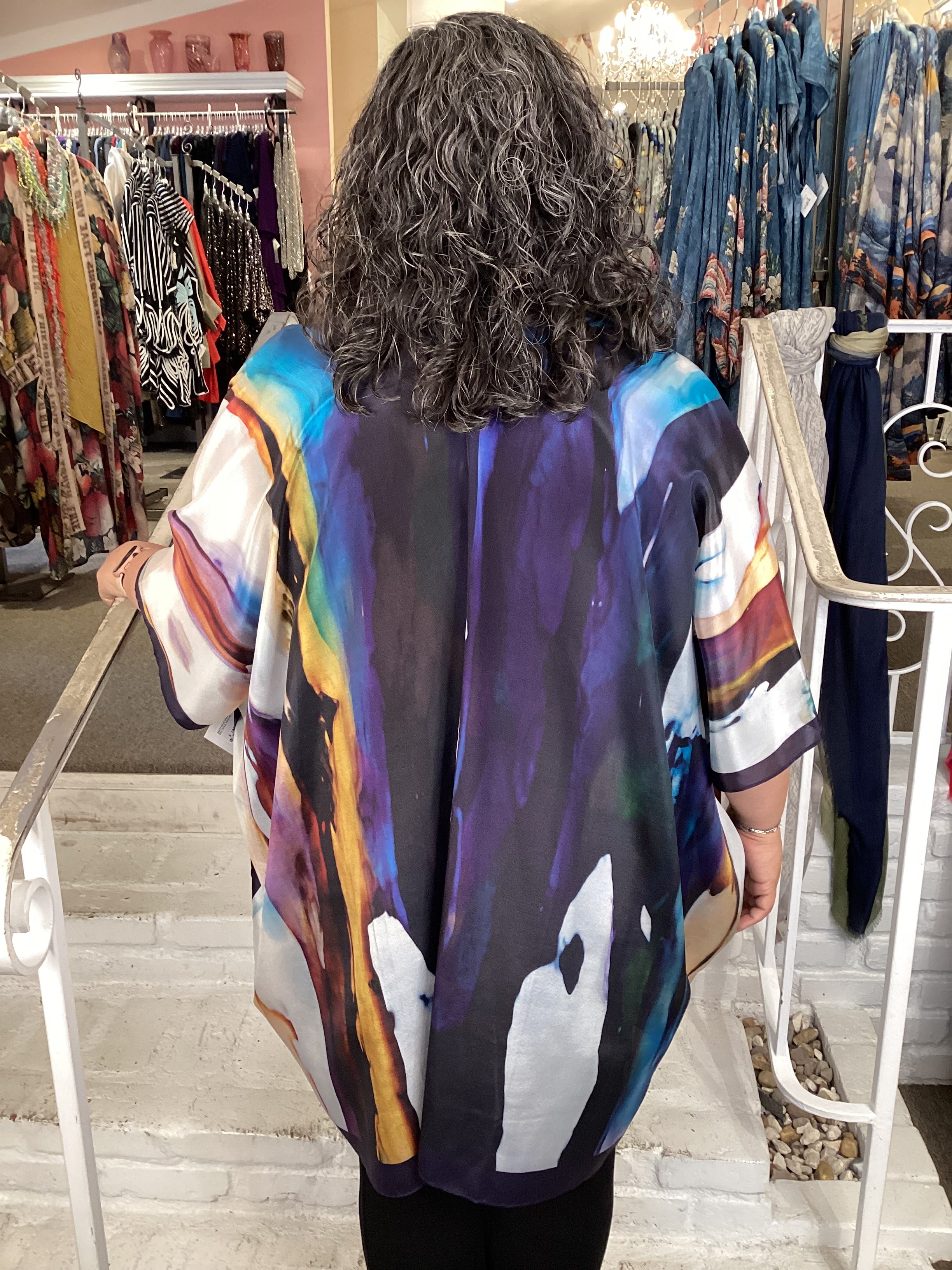 Slip into pure silk elegance with this show-stopping kimono from Cocoon. Its captivating prints and rich colors work magic over everything—pair it with your favorite dress, jeans, or separates for instant glamour or laid-back boho vibes. Whether you're celebrating as the mother of the bride, making an entrance at a gallery, or treating yourself to a fabulous dinner night, this 100% silk piece transforms any occasion into something unforgettable.