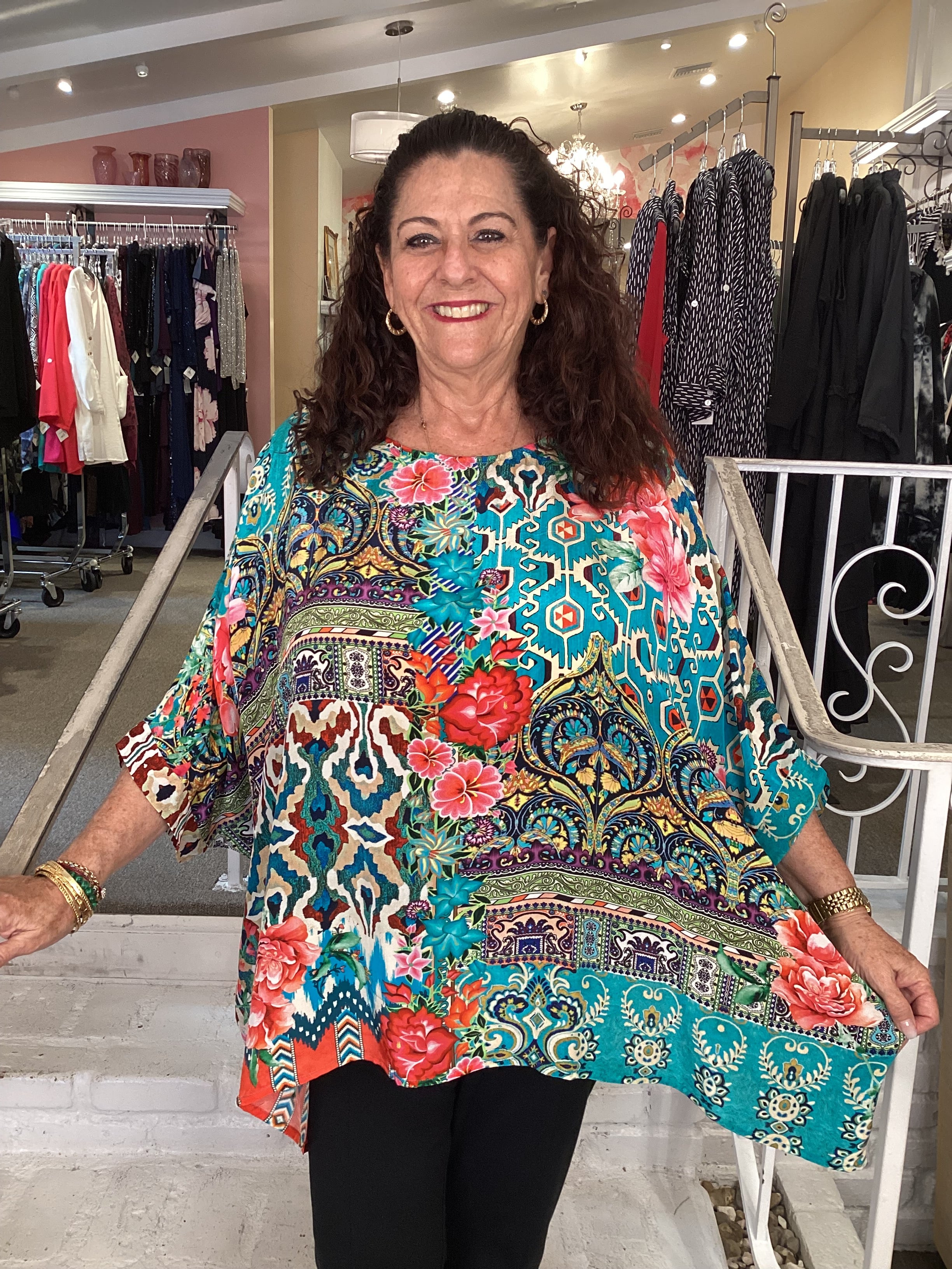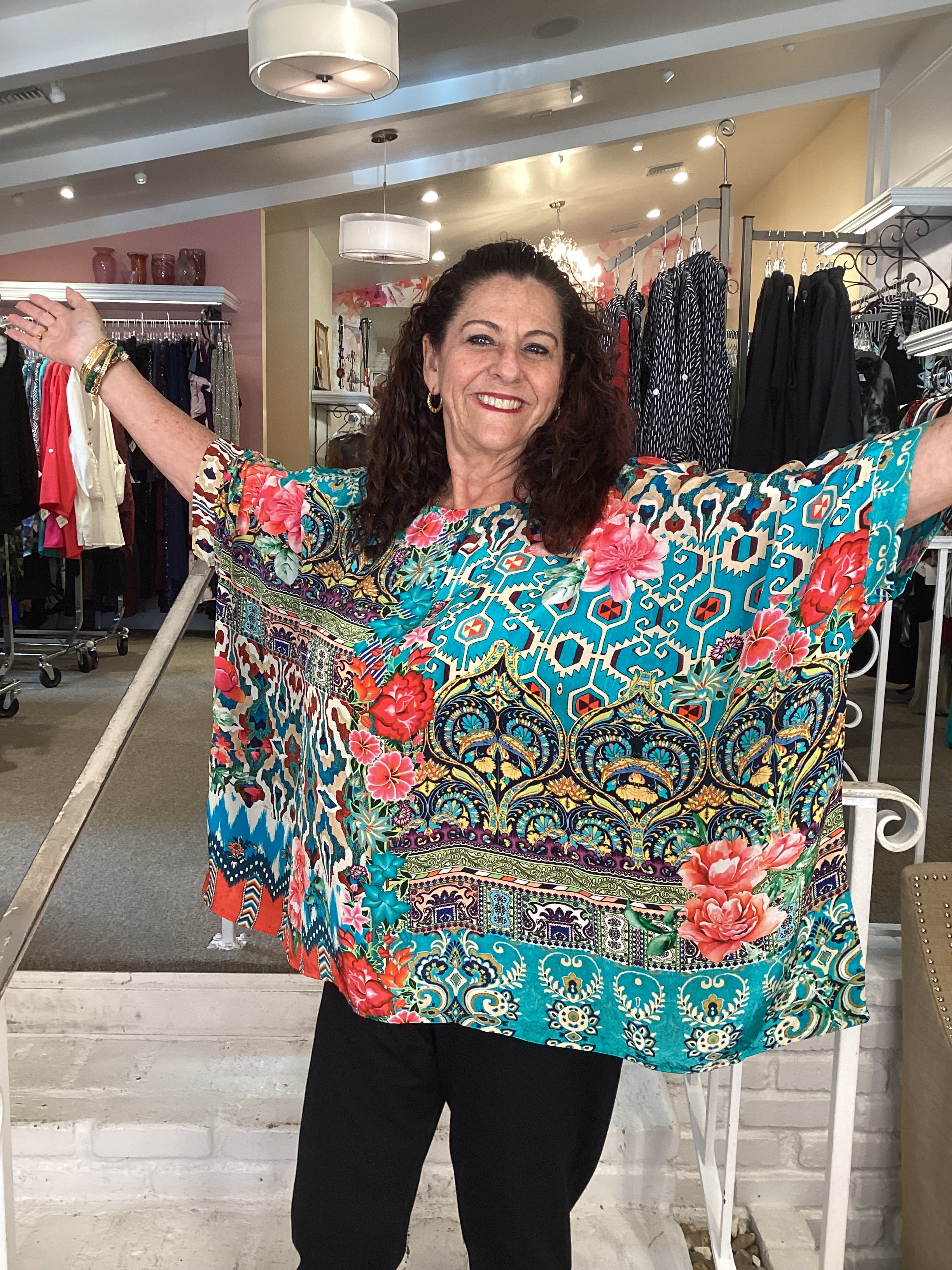 Shana's classic silky viscose fabric with sensational multicolor print. Loose, oversize boxy shape with drop sleeves. S/M is 72" around, 27" long. L/XL 80" around, 28" long