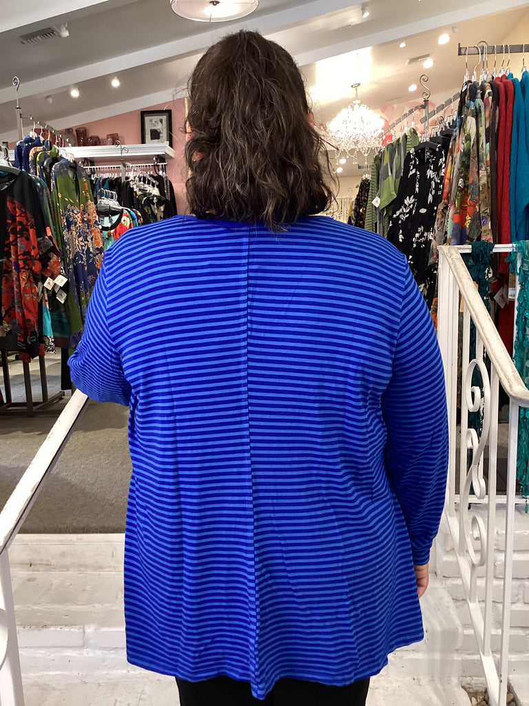 This Kleen swing top has a loose shape, crew neckline and long sleeves. The A line shape falls nicely over the hips with a curved hemline that falls a bit longer in the back. This is a very comfortable lightweight cotton Lycra blend in a tonal stripe.