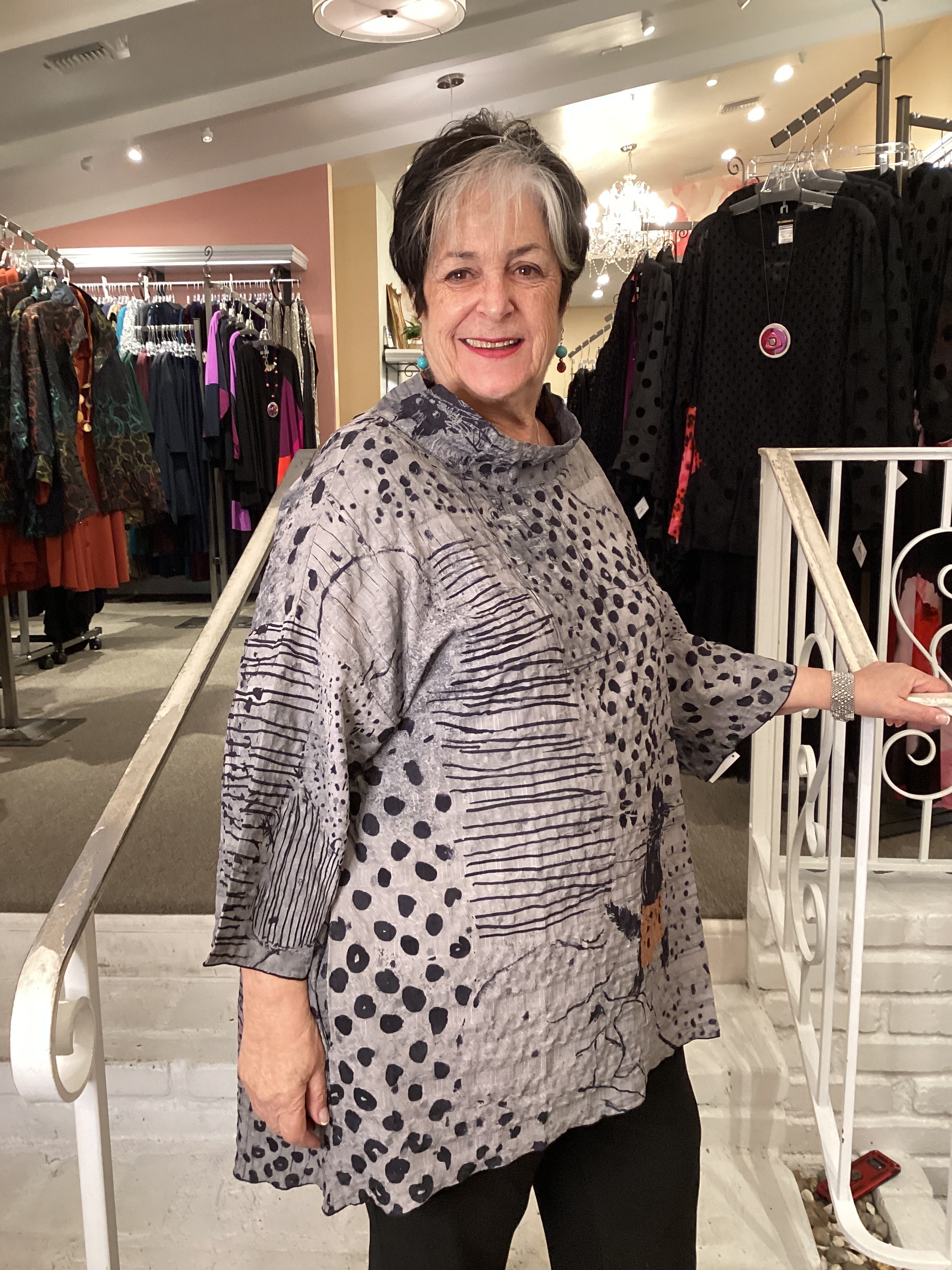 The new twist on the classic 3 Potato boxy top!! Works of art on textured patterned fabric, unique on each top. Topped off with a low cowl neck and below is a high/low hem. The sleeves are drop down and of course we love the pockets. Bust measures about 54", length is 28" front/ 32" back.