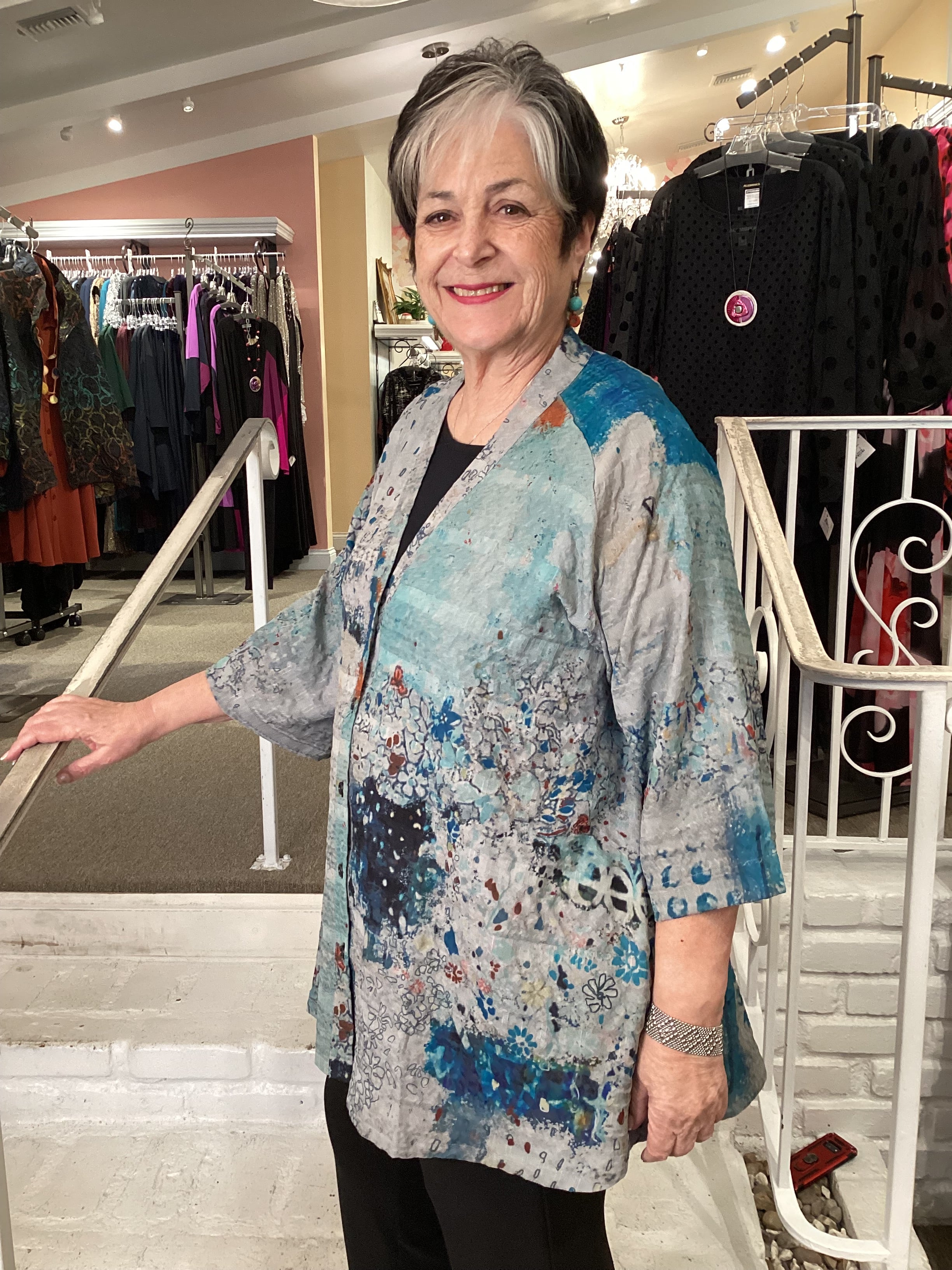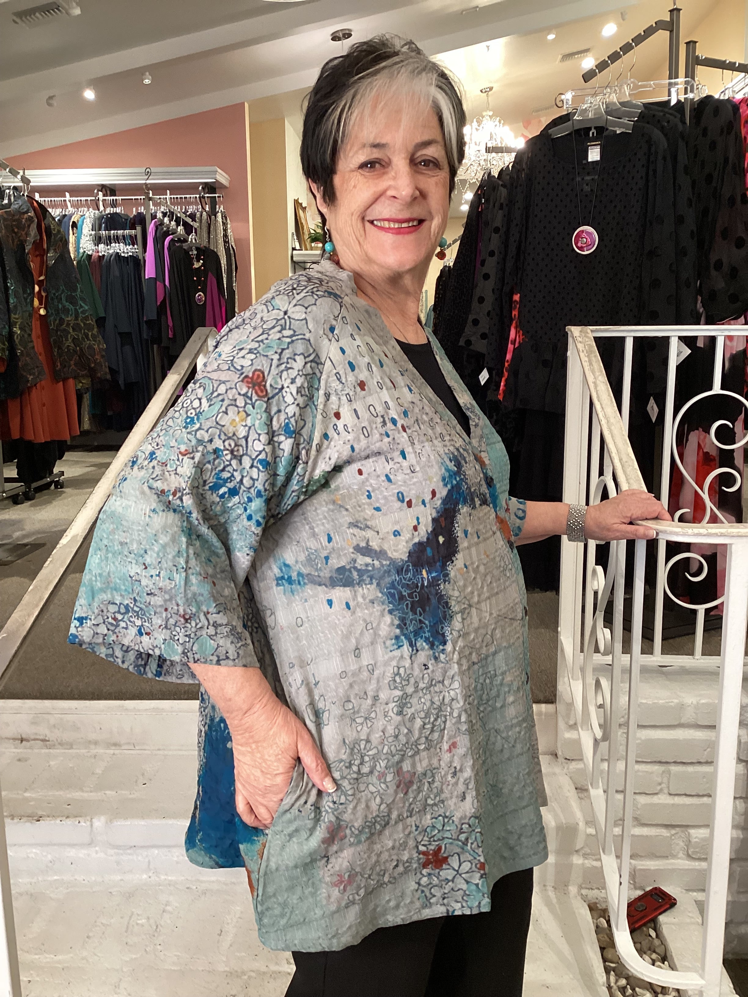 The new body this season is a button front V-neck with a elbow length raglan sleeve.  The unique art is printed on a textured pattern lightweight fabric.  The slight a-line top is made generous at the hips with a nice back pleat.  And yes, it has pockets!!