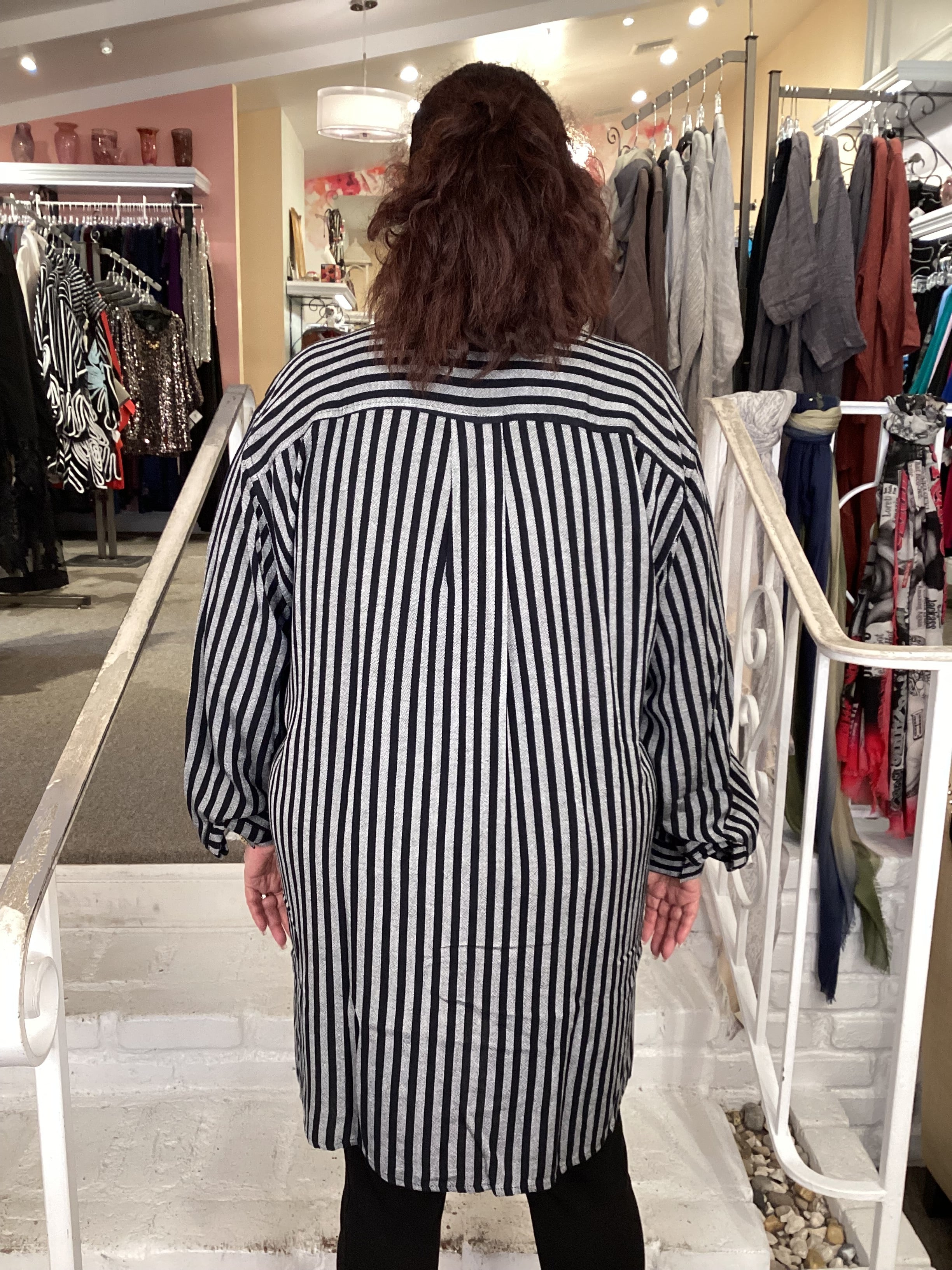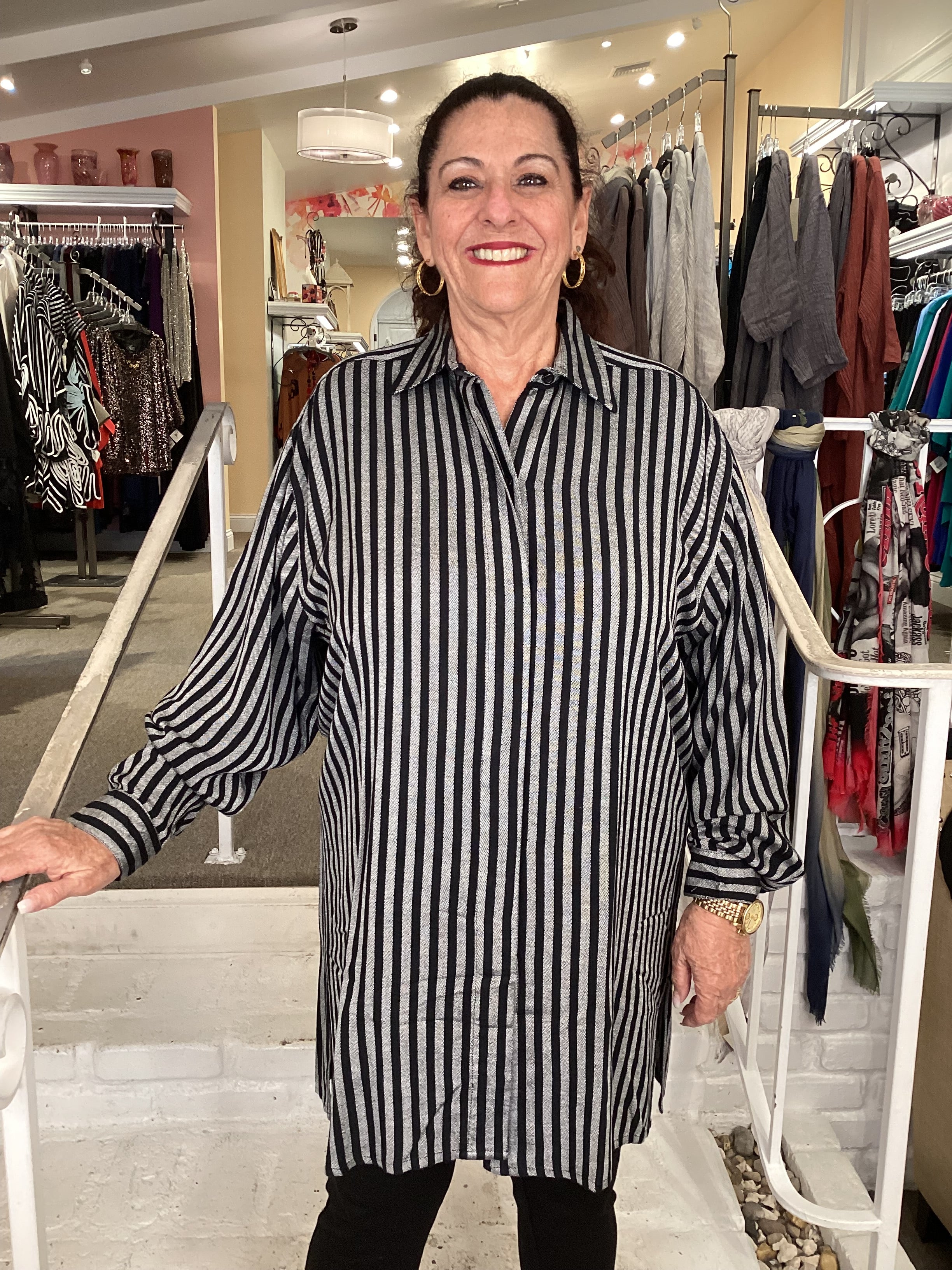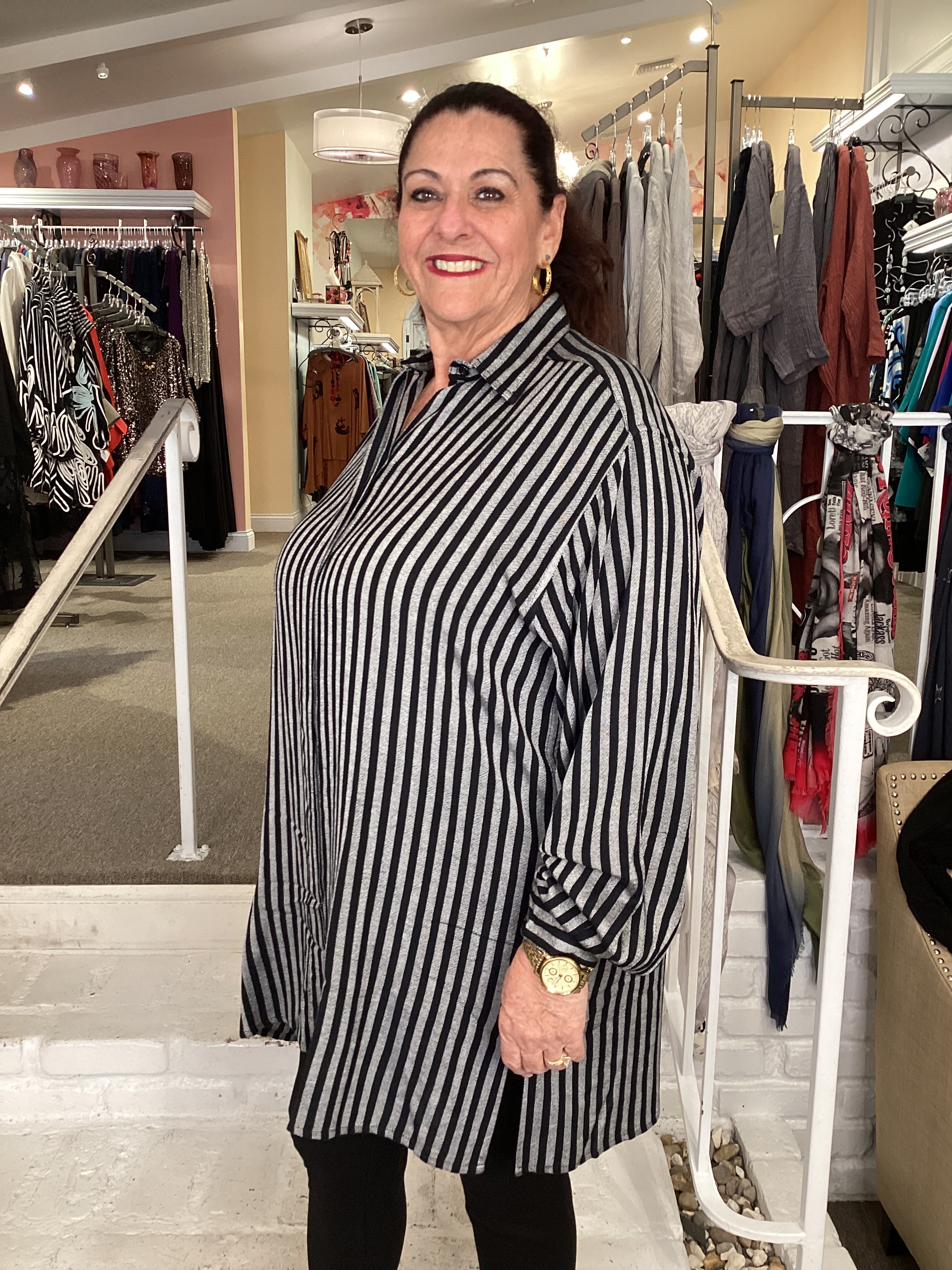 This sophisticated shadow grey top features a classic button-down design with a covered placket for a refined silhouette. Long sleeves provide versatile layering options, while the structured shirt collar adds polished definition. The curved shirt tail hem offers flattering coverage and easy styling whether tucked or worn loose. Crafted in a natural fabric blend, this wardrobe essential delivers comfort and timeless elegance for any occasion.