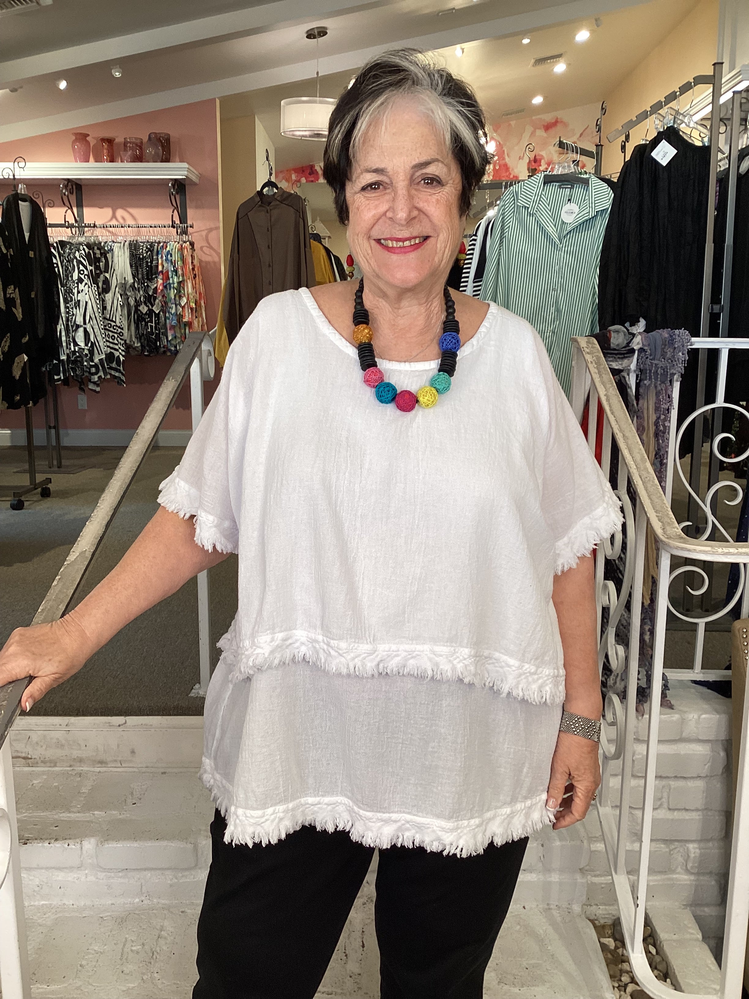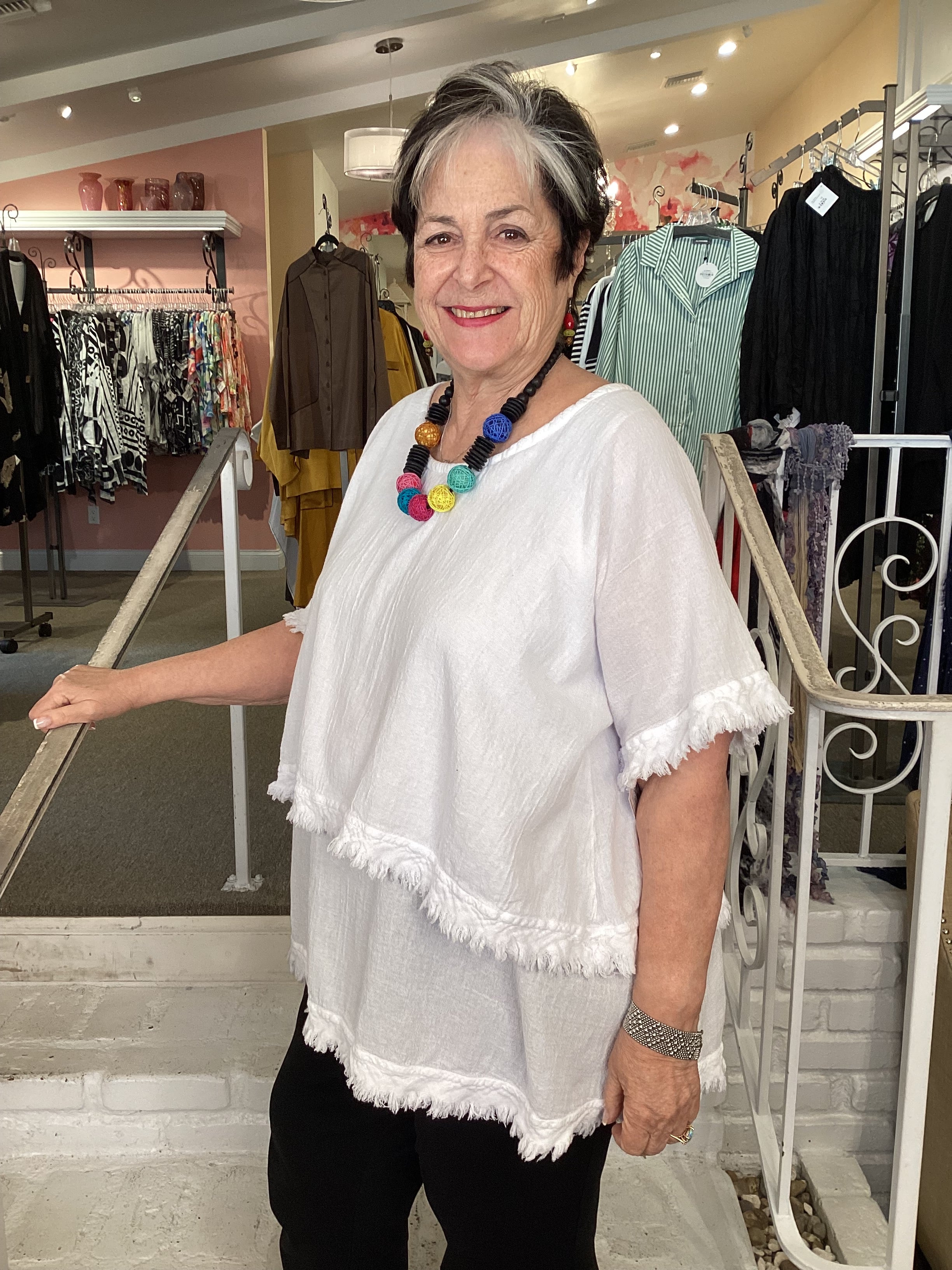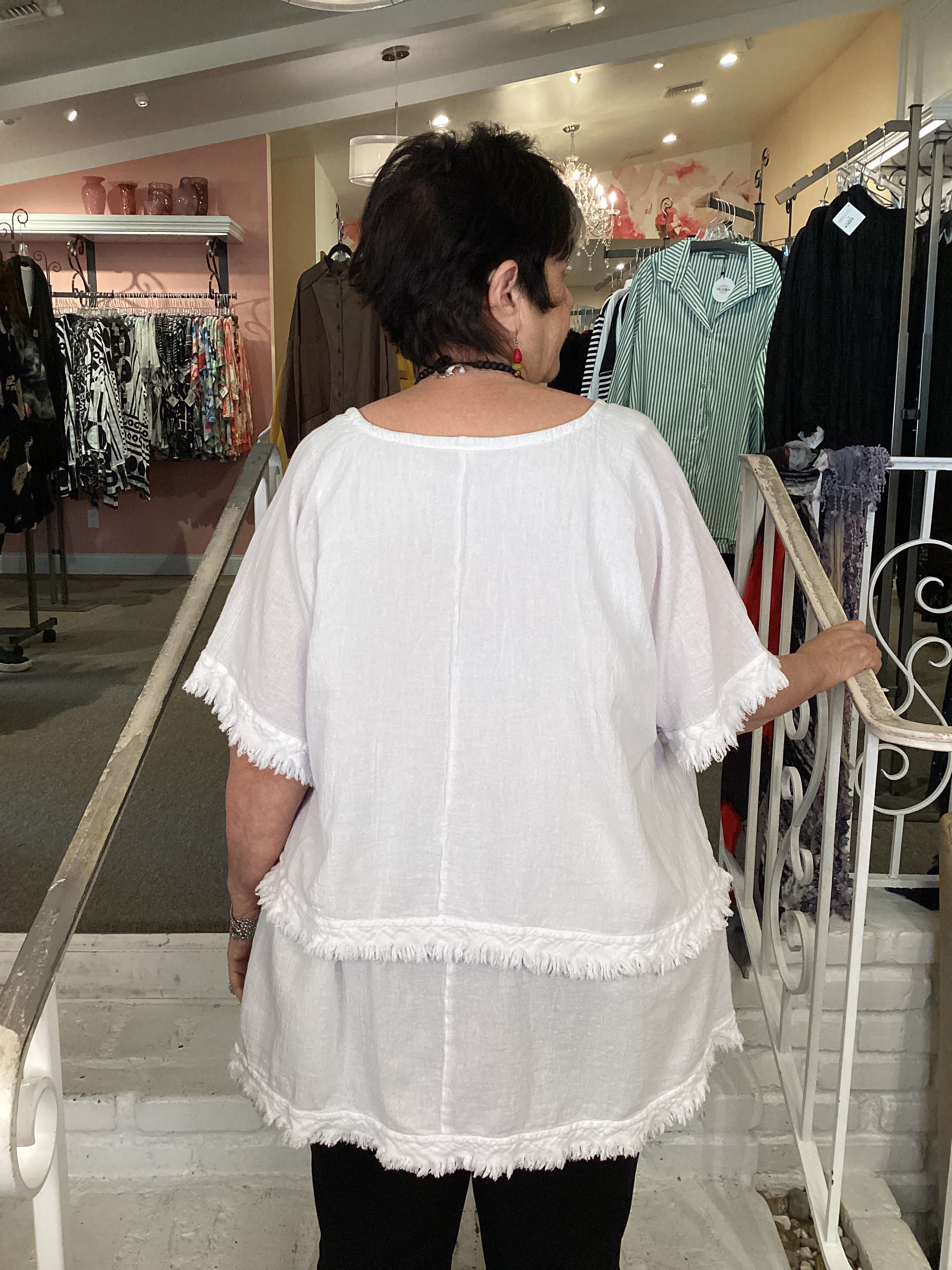 Relaxed and refined, the TRUFFLE TIER TOP in snow white combines a flattering scoop neckline with soft, frayed edges for an effortlessly chic look. Short sleeves and tiered layers create dimension and movement, while the frayed detailing adds a touch of casual sophistication. Perfect for pairing with denim, skirts, or layering under jackets. Comfortable, versatile, and made to become a go-to favorite in your wardrobe.