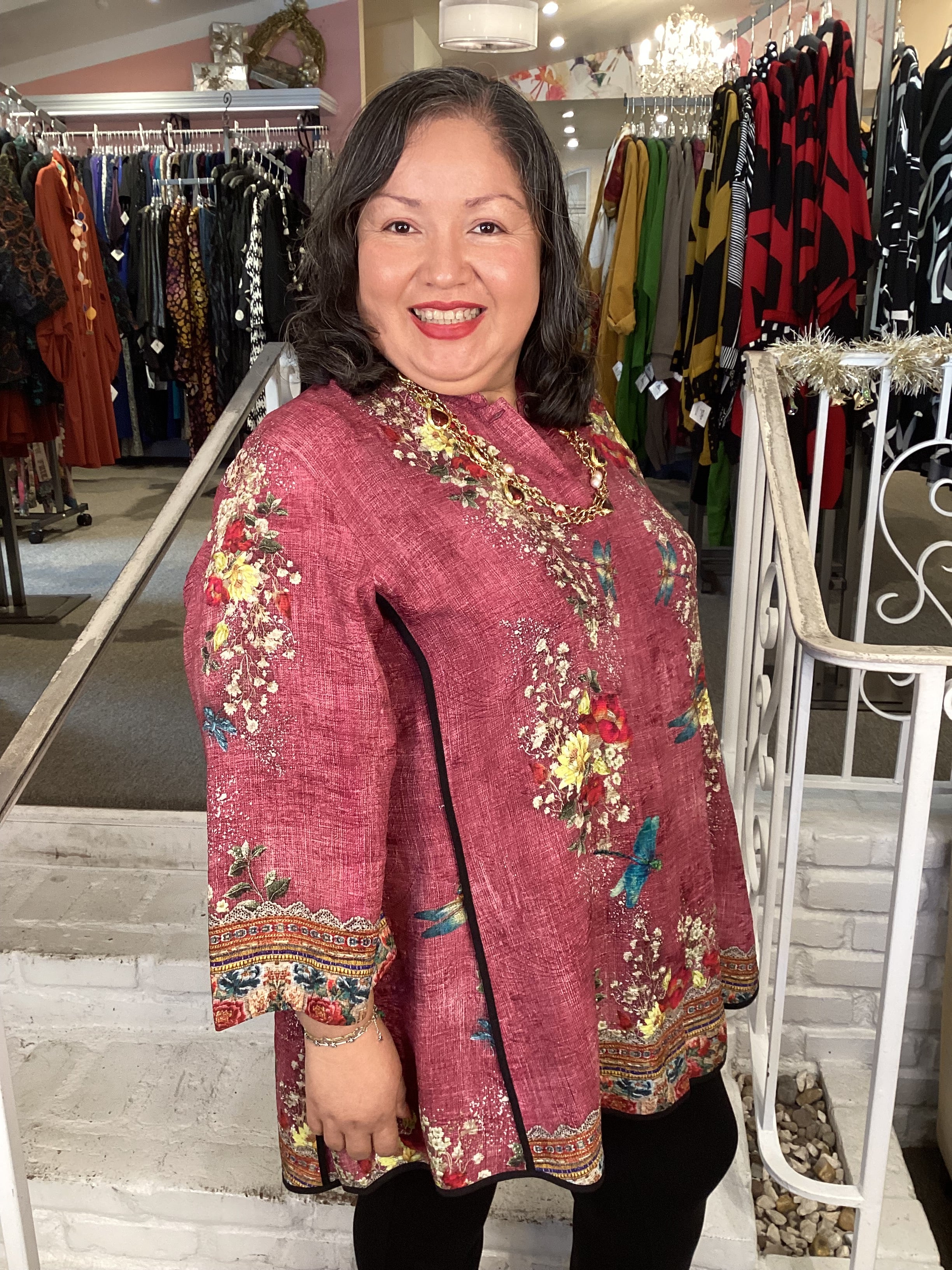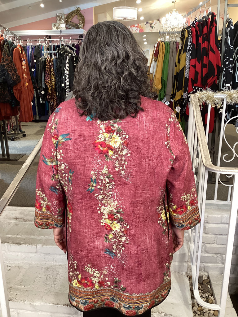 A new, unique print on textured fabric from Citron. The button front closure adds a touch of sophistication, but you can also wear it open for a more effortless and chic look. And of course, the top has the Citron classic Mandarin collar. Tucked in side panels give a slimming effect from the bust down, as the silhouette flares out to an a-line. The bracelet length sleeves are generous kimono style and the hemline is a high/low.