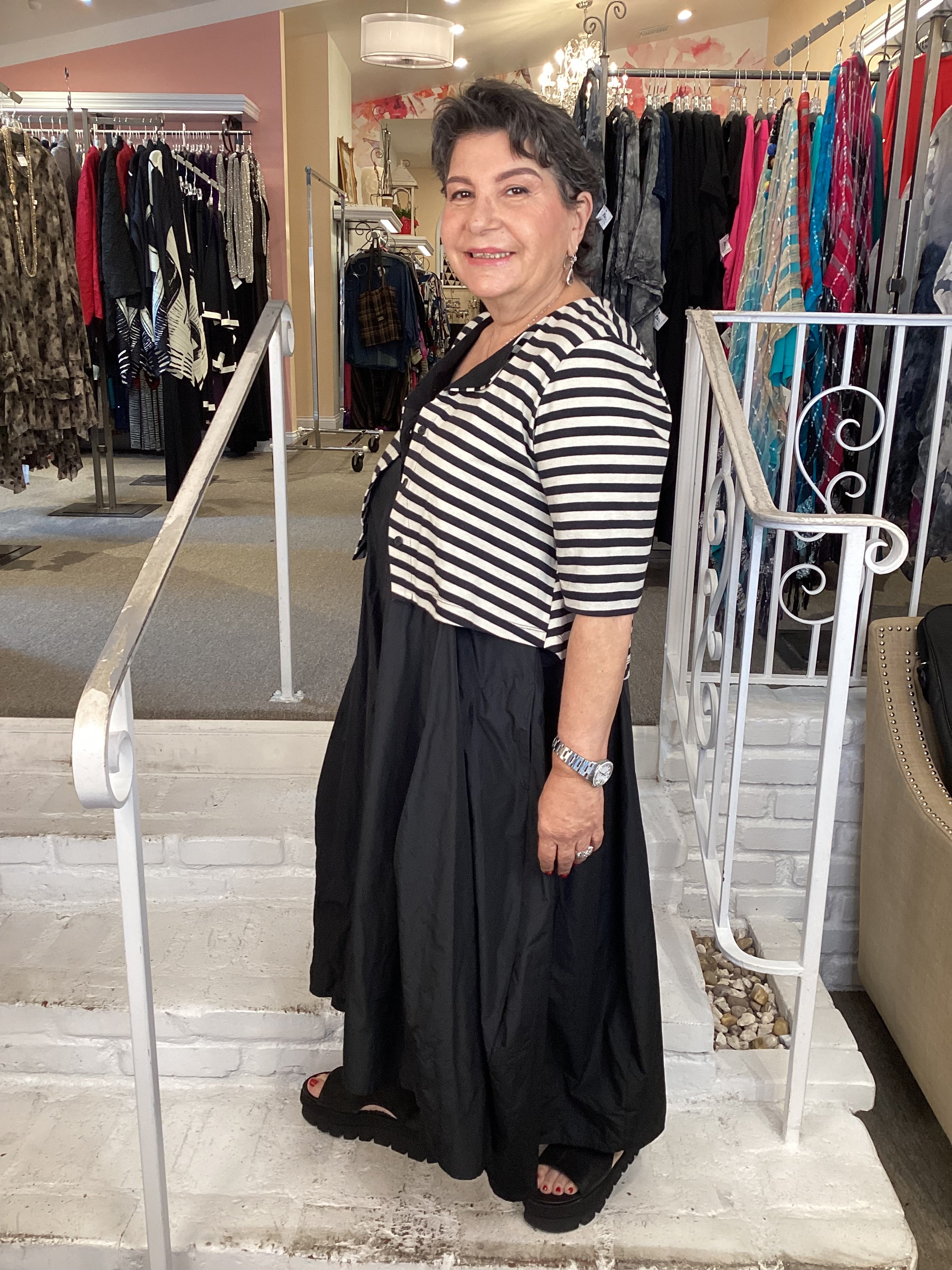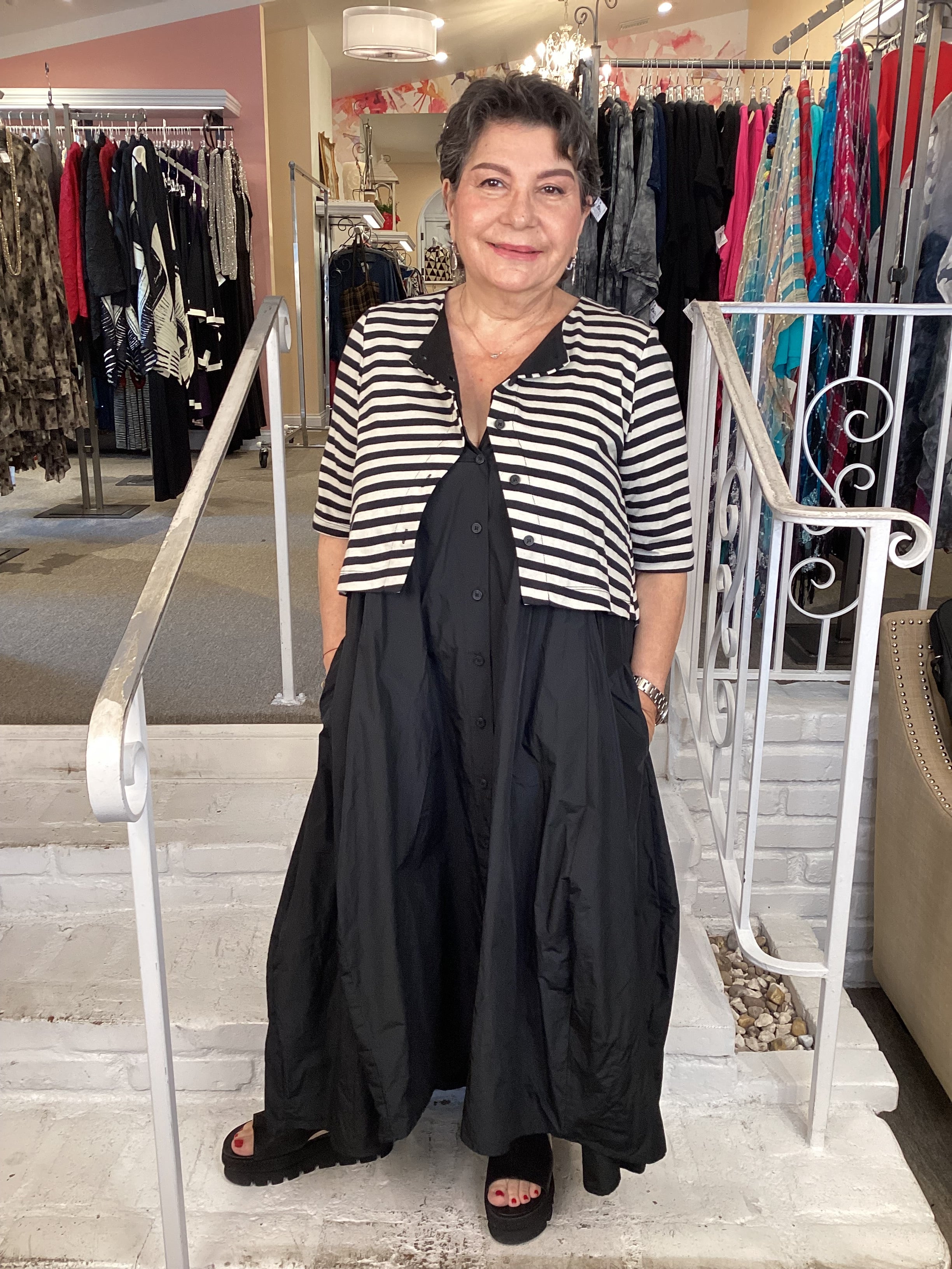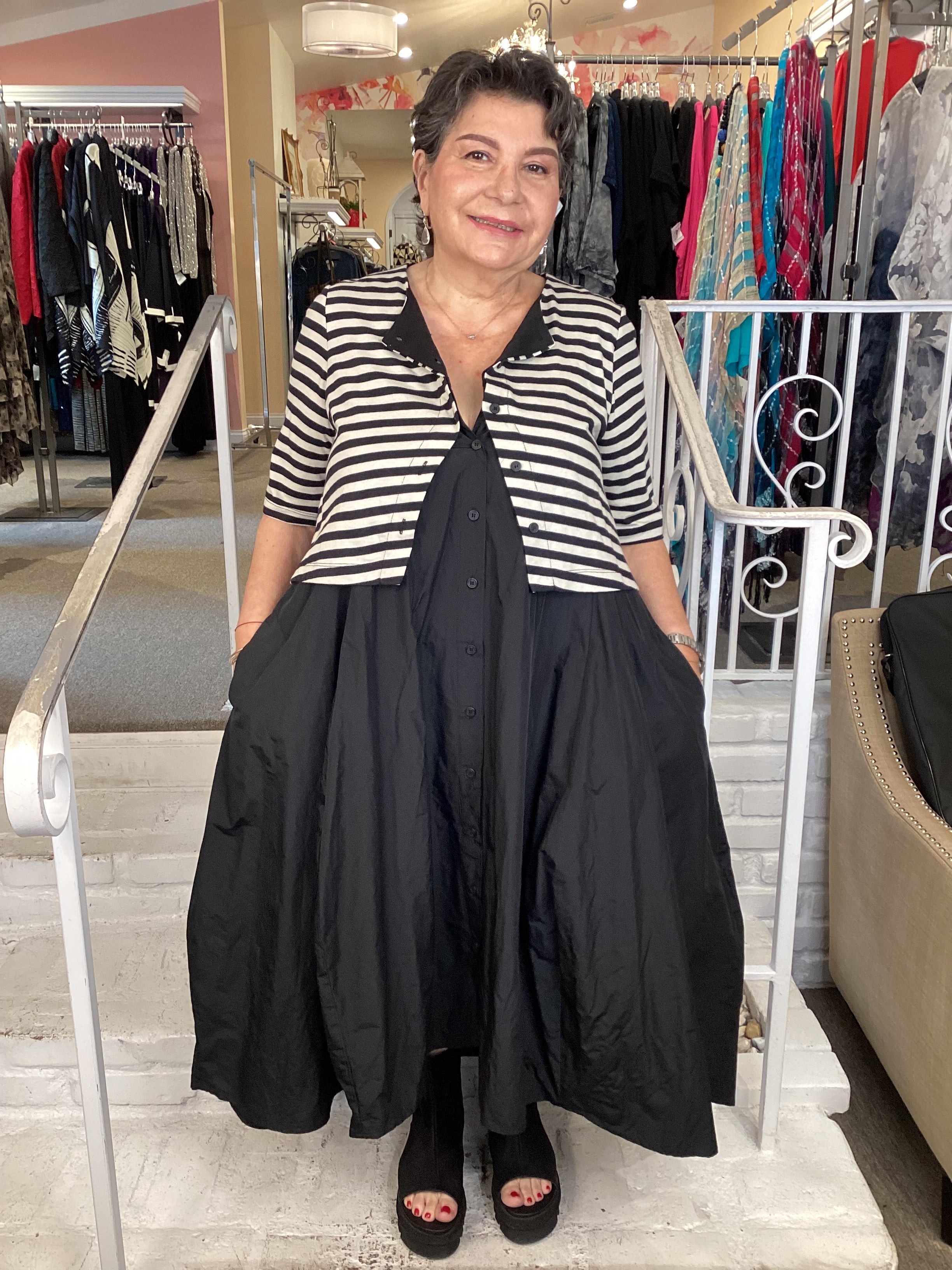 Skims shoulders and bust with a generous A-line skirt that falls to mid-calf. This striped jersey knit top pairs with lightweight taffeta skirting for effortless movement and volume. Elbow-length sleeves and a full button front create the illusion of layered separates, while side pockets add practical style. The exaggerated silhouette reads polished yet comfortable for everyday wear.