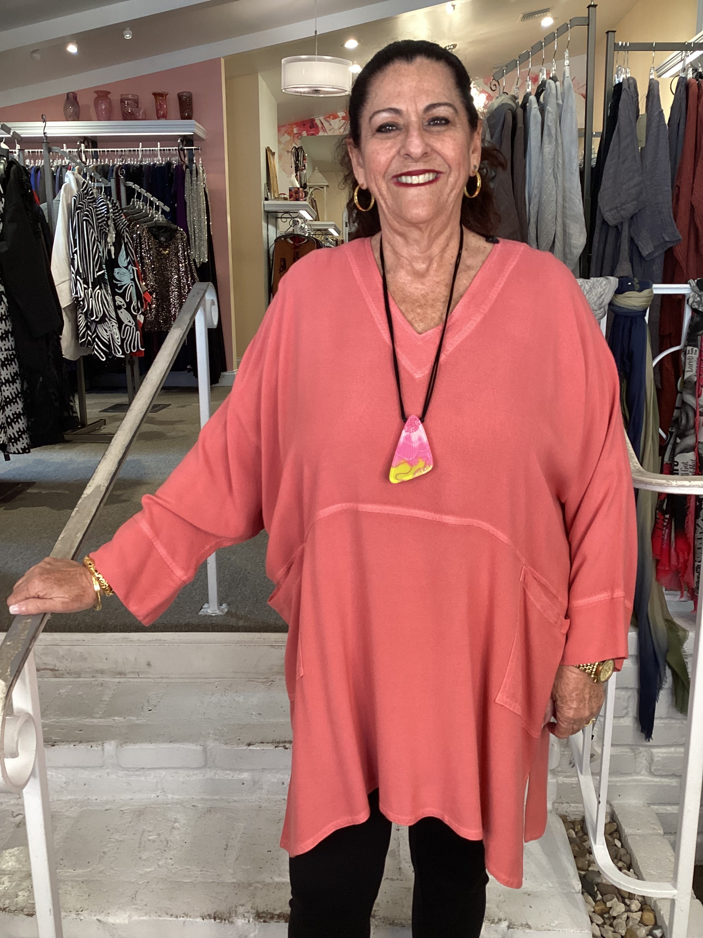 This versatile V-neck tunic delivers effortless style with thoughtfully designed details. The relaxed drop sleeves provide comfortable movement, while strategically placed side vents enhance mobility and silhouette. A defined waist seam creates a polished look, and dual front pockets offer practical functionality. The ketchup hue brings vibrant color to any wardrobe, making this piece an ideal layering option or standalone statement piece for everyday wear.