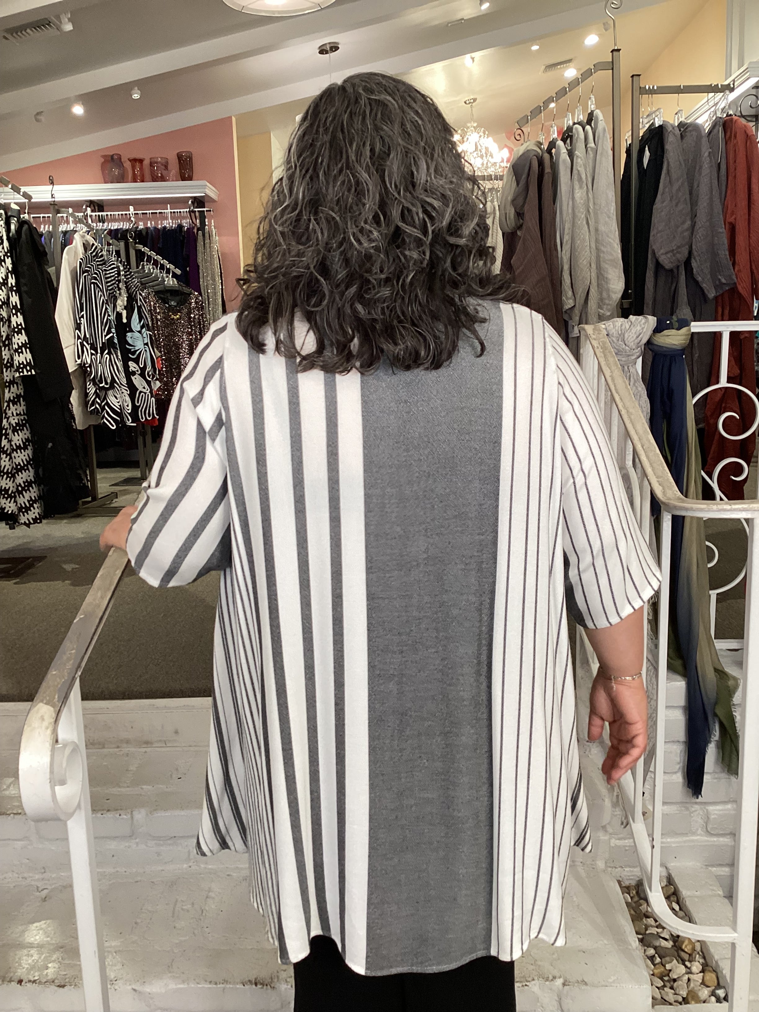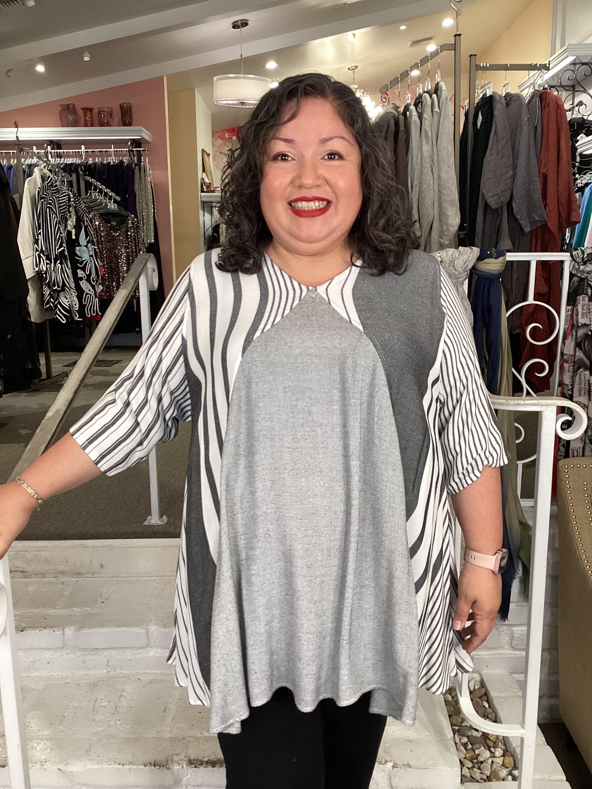 Elevate your wardrobe with this sophisticated V-neck tunic, designed for modern comfort and timeless appeal. The striking quality fabric creates visual interest, while the bias-cut construction ensures a flattering silhouette. Elbow-length sleeves and a gracefully rounded hem provide movement and ease, making this piece ideal for layering or wearing solo. Versatile enough for casual outings or dressed-up occasions, this tunic delivers both style and wearability for the discerning plus-size shopper.