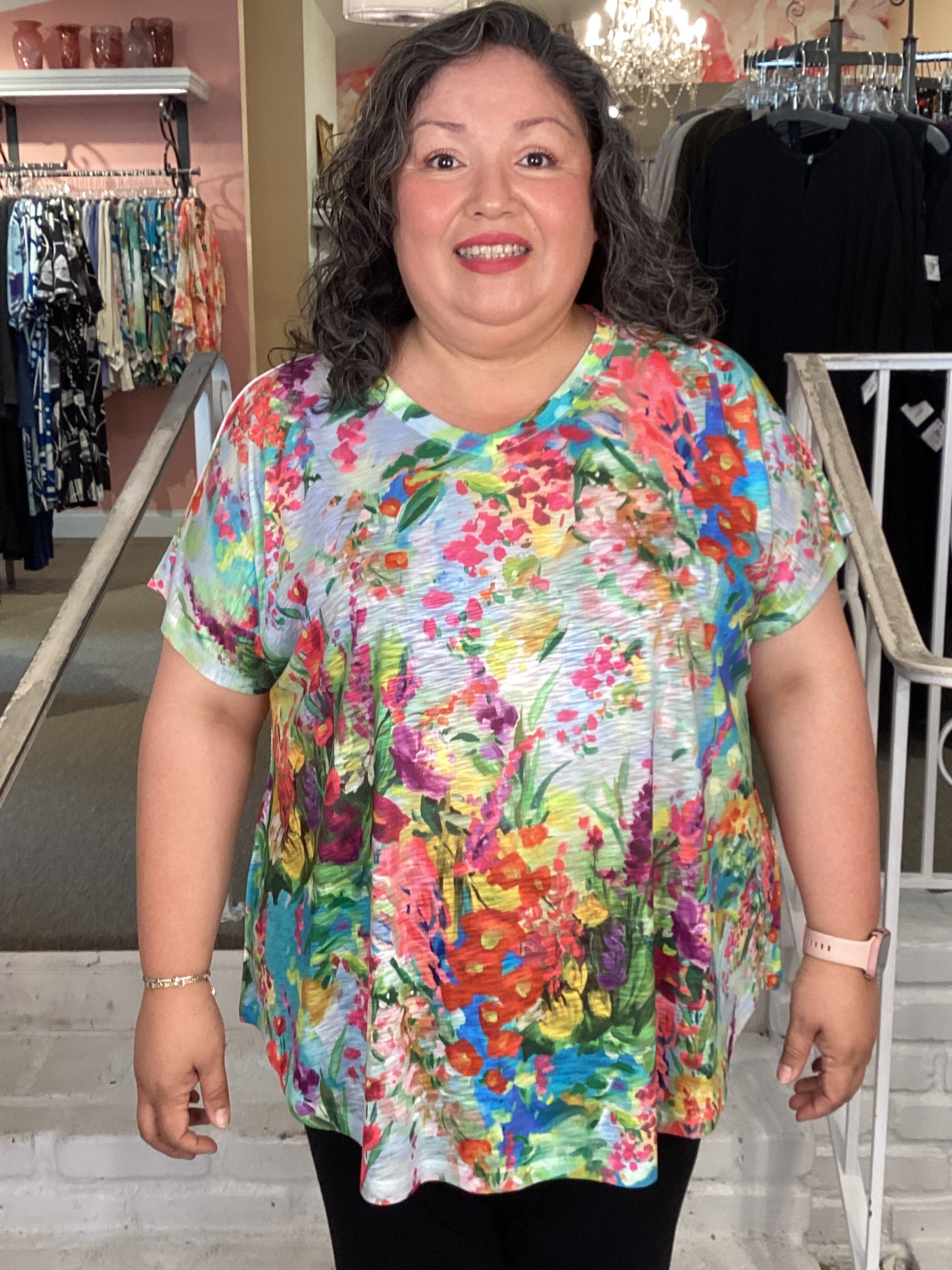 An  ultra-lightweight fabric for a relaxed fit, summer time tee.  With a flattering V neck, shirt tail hemline and short cap sleeves, it's ideal for any wardrobe. The beautiful print is brand-new from Jess and Jane, ensuring you stay up to date with the latest fashion trends.