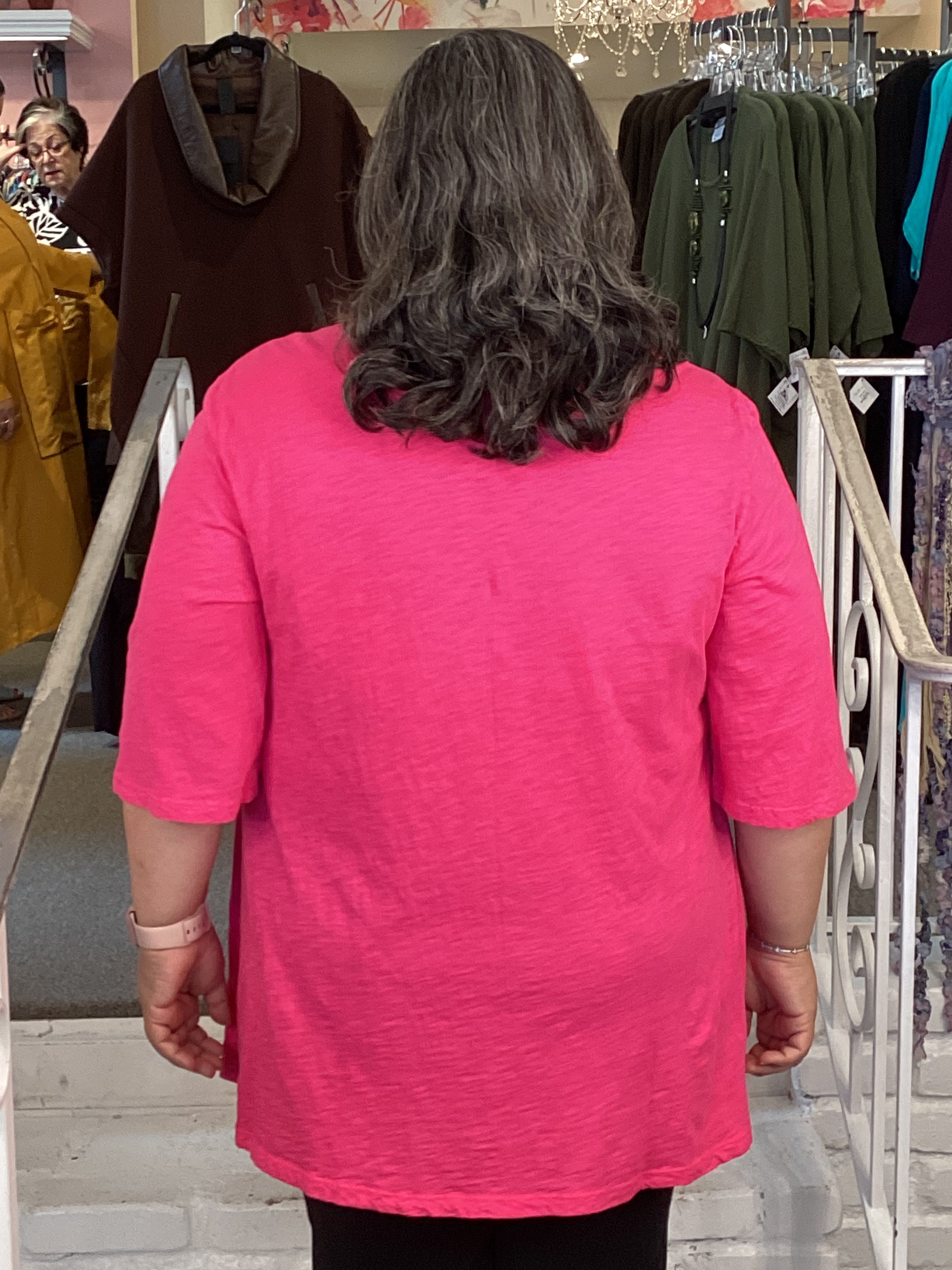 This soft cotton tee is a-line silhouette with an arched hemline and 3/4 sleeves.  There's also a cute single pocket on one side of this v-neck shirt.