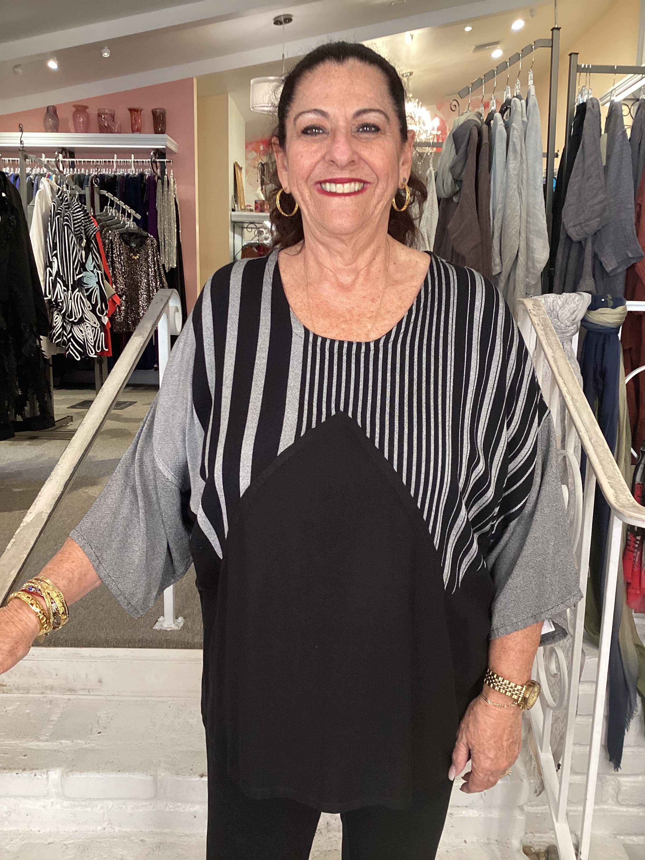 Crafted from a luxurious cotton-rayon blend, this versatile top delivers comfort with sophisticated style. The classic round neckline and three-quarter sleeves provide elegant coverage, while the striking zig-zag detail across the front—rendered in contrasting colors and prints—adds visual interest and dimension. An even hemline ensures a polished, flattering silhouette that works seamlessly from casual outings to layered ensembles. Perfect for those seeking quality basics with understated design elements.