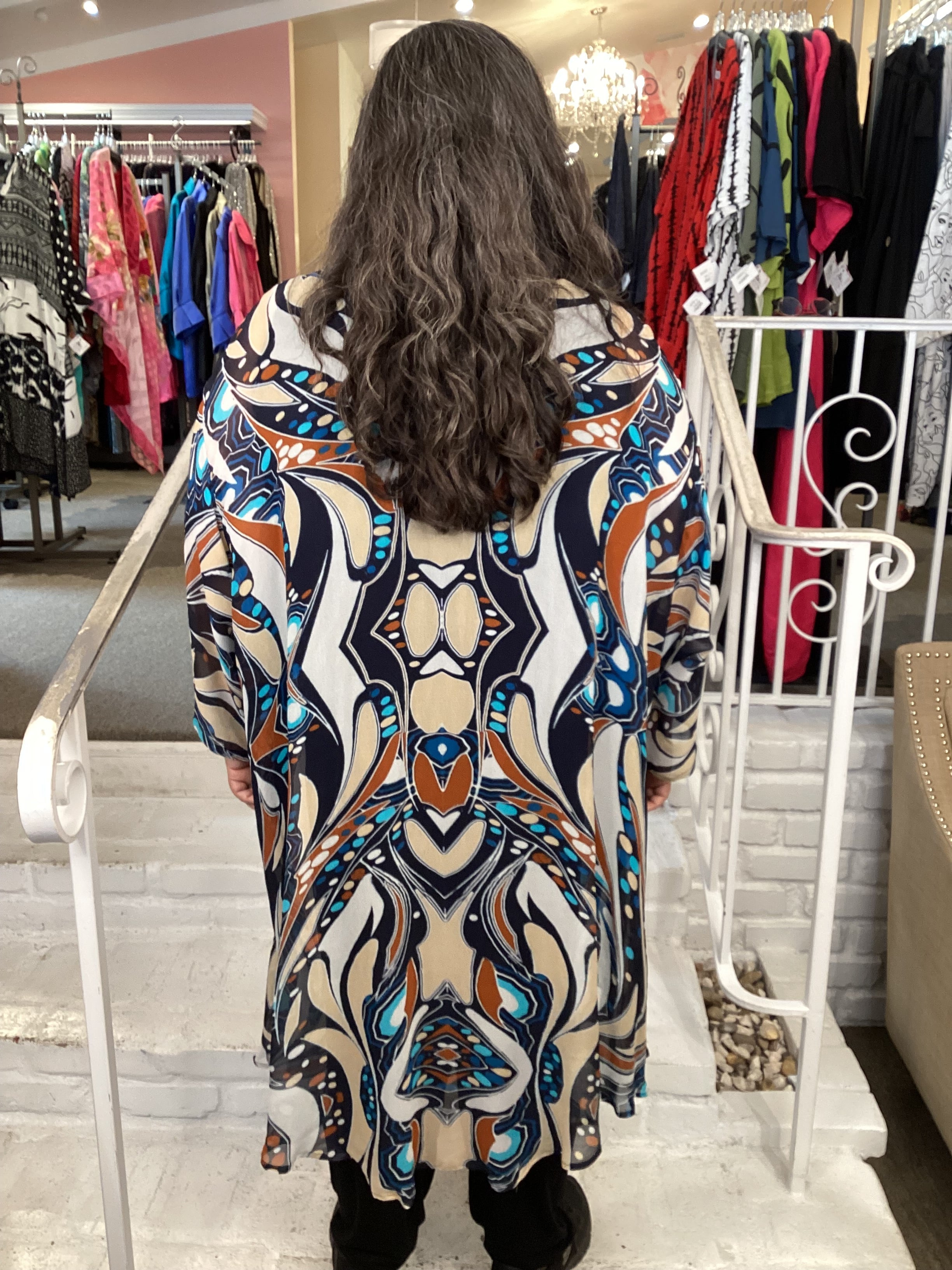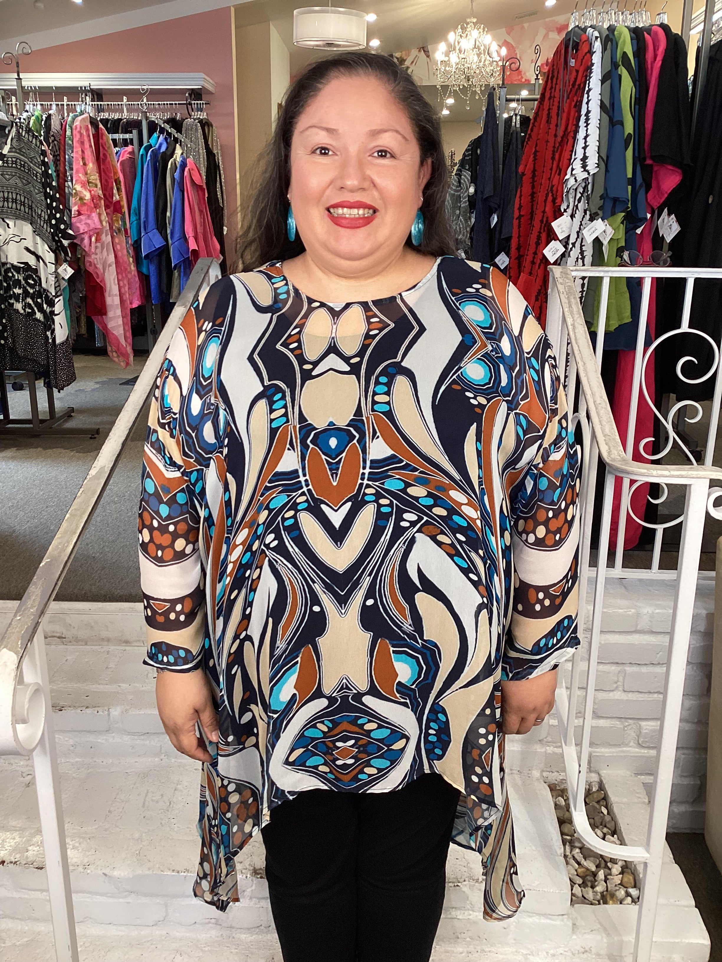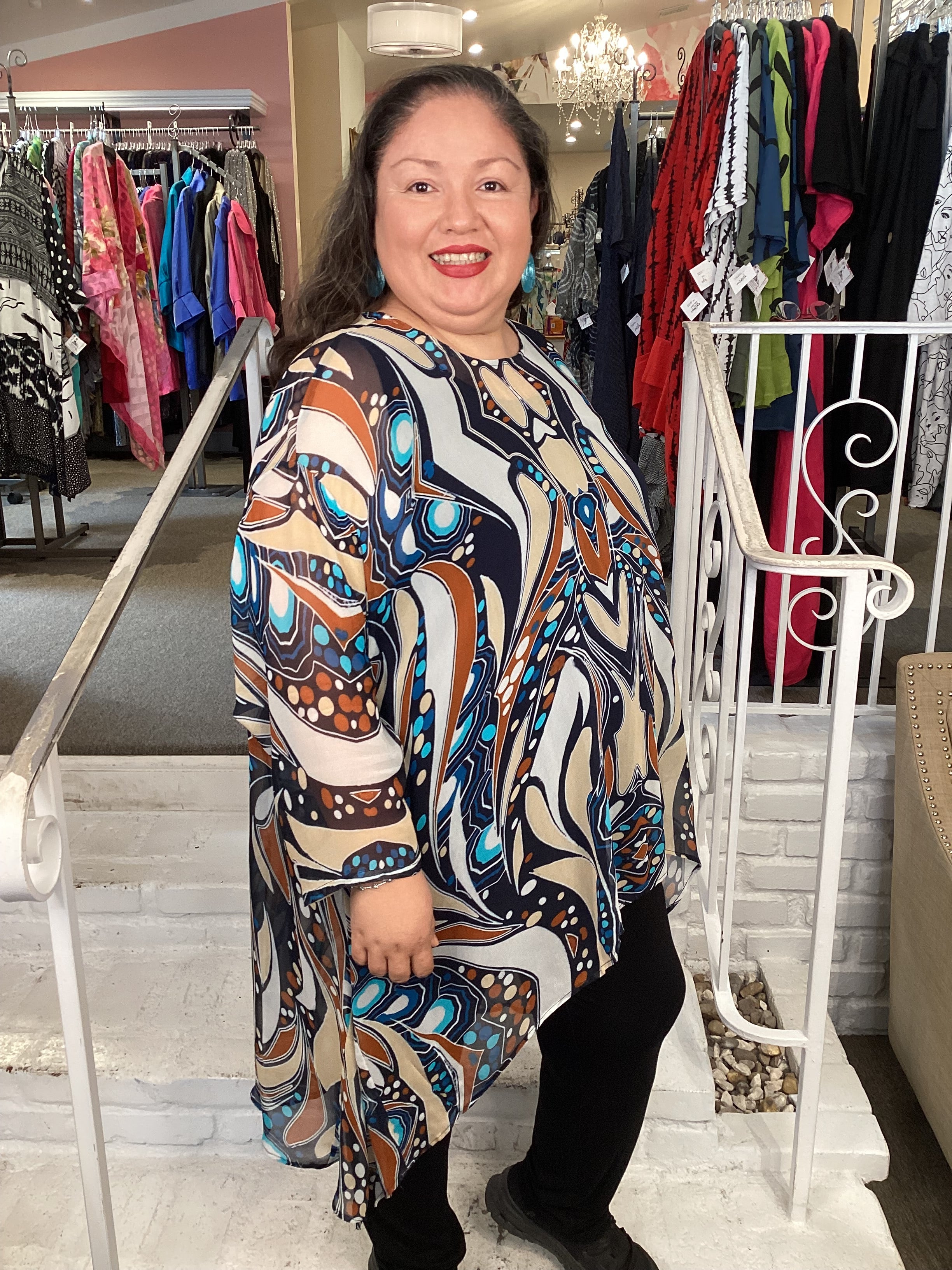 This version of the Whisper top features a semi sheer chiffon in a super colorful print and round neckline with generous sleeve. Designed in a boxy shape, the hem is arched in front and curved downward in back in a high/low contrast. Our model wears this one size piece which will work for 1X-4X.