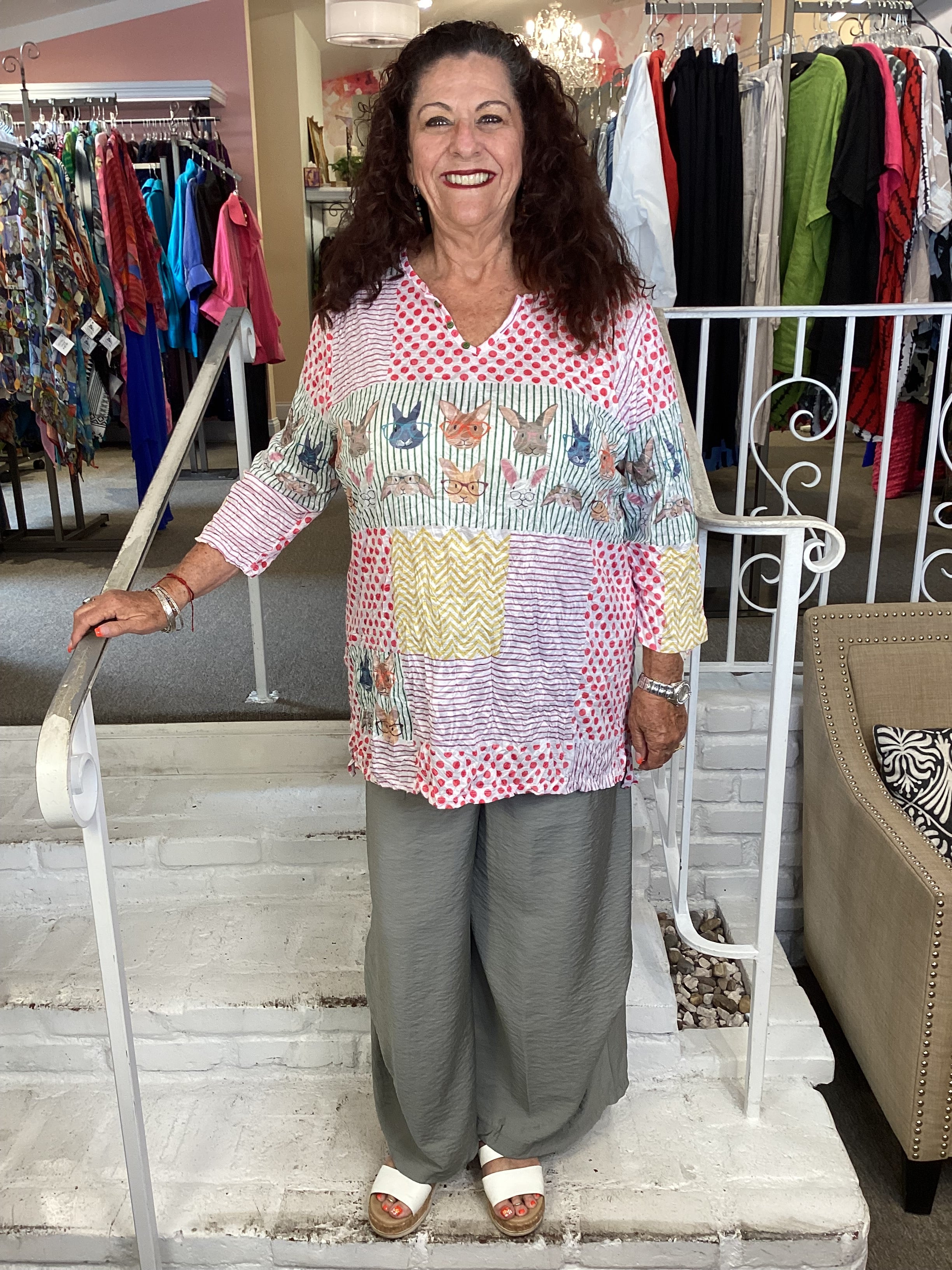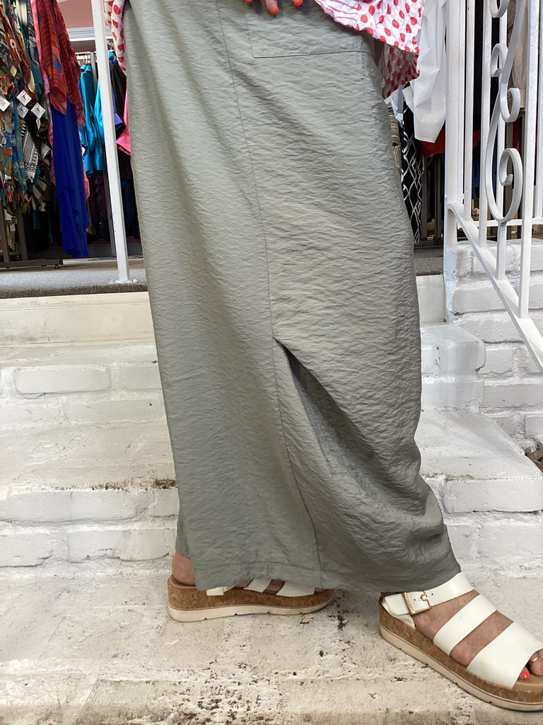 This wide leg pant has a pleat at the knee side seam that adds unique shape to this soft flowing pant. Lightly crinkled textured fabric, elastic waist and side pockets. Model is wearing an XXL