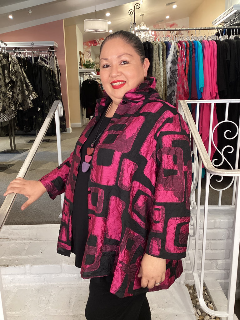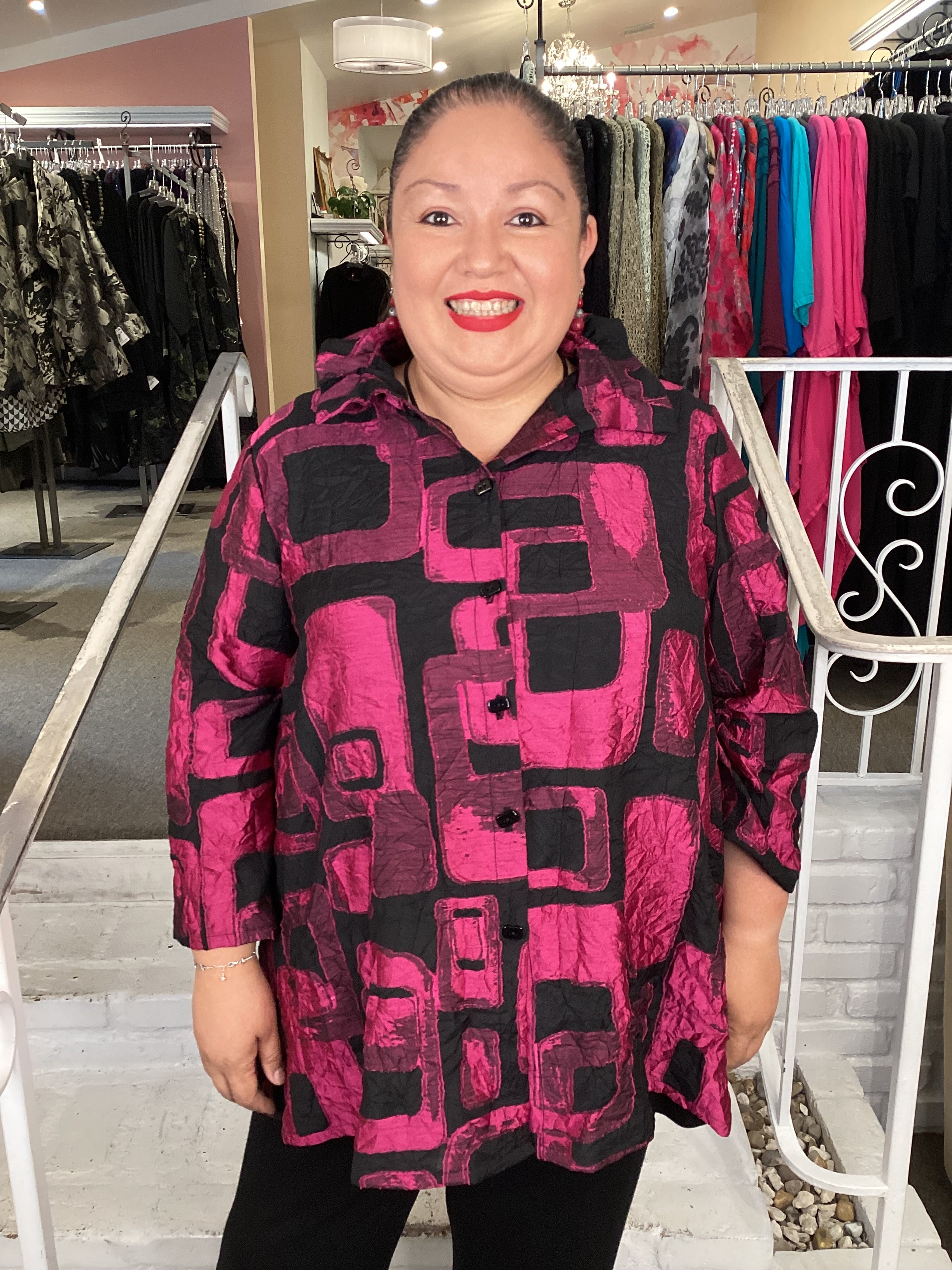 This bold new collection from Sydney features their standard vibrant colors with a new print textured crinkled fabric. And of course it's light weight and generous in sizing with a generous pleat on the back panel. This slight a-line silhouette jacket closes with a button front, has side seam pockets and a versatile wire collar.