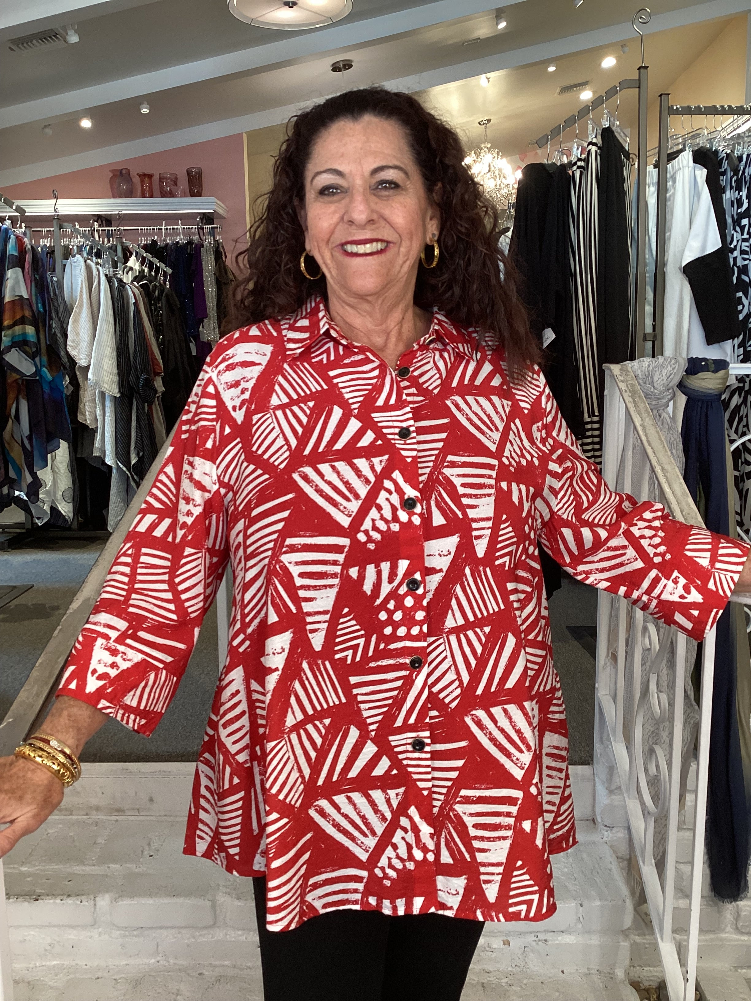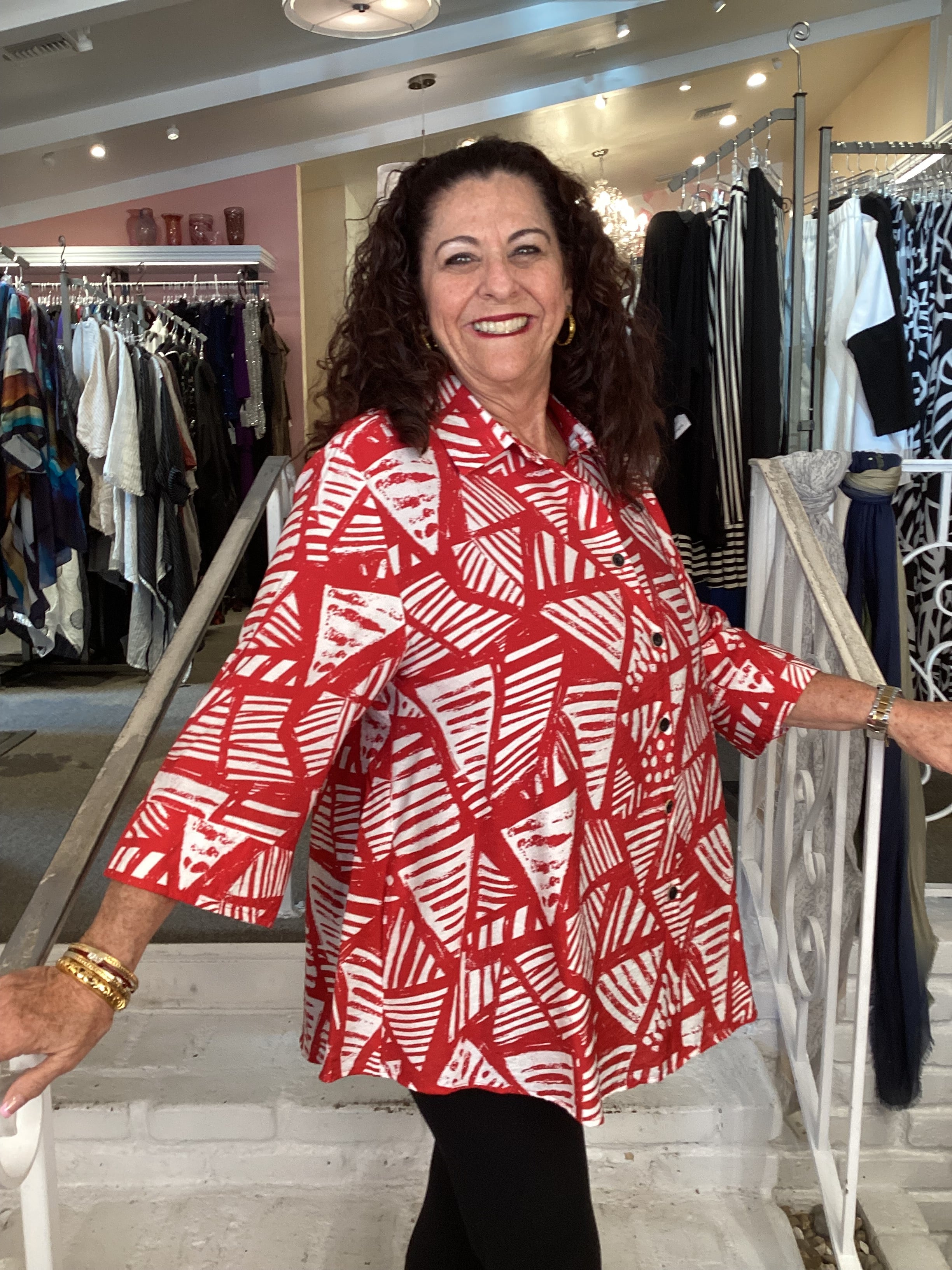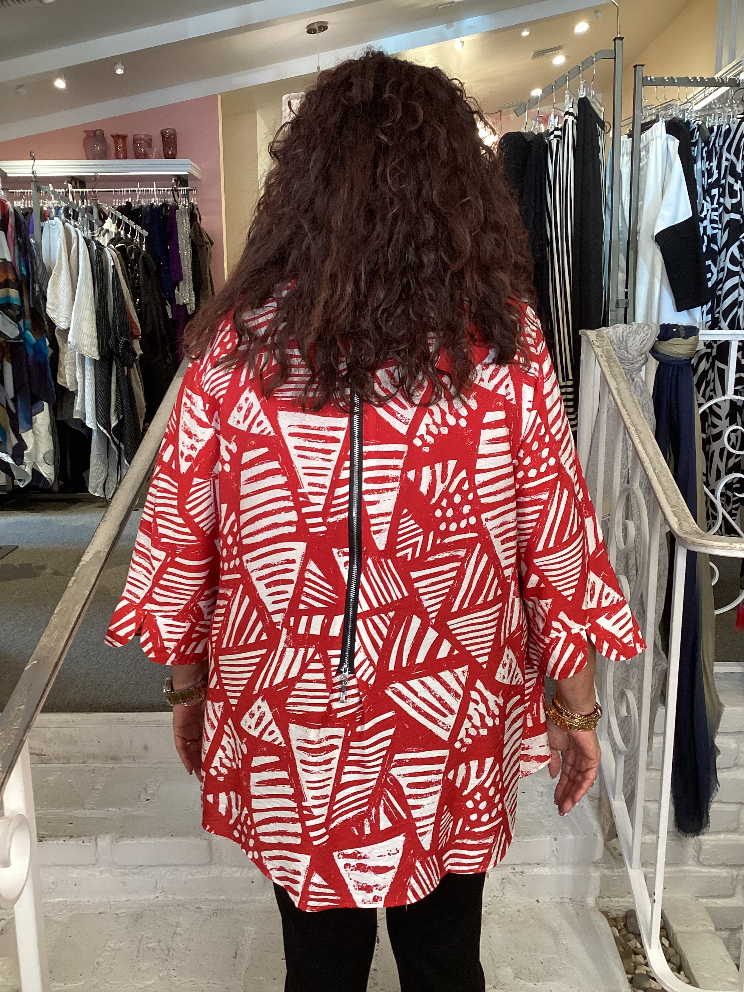 Very light weight Rayon/Poly blend with a primitive print motif, button front, high low hem, 3/4 sleeves with cuff. Detailed in the back with a zippered pleat.